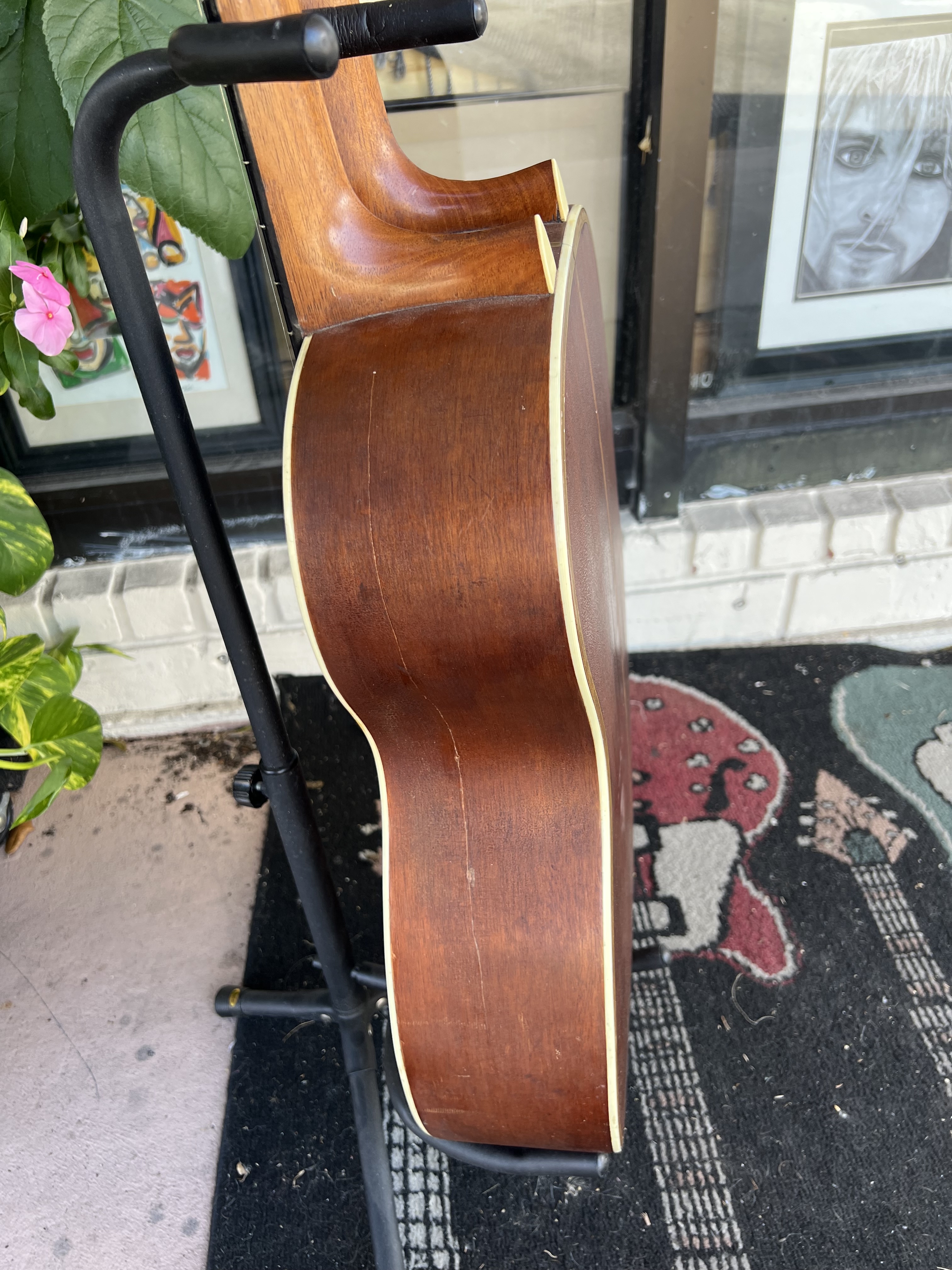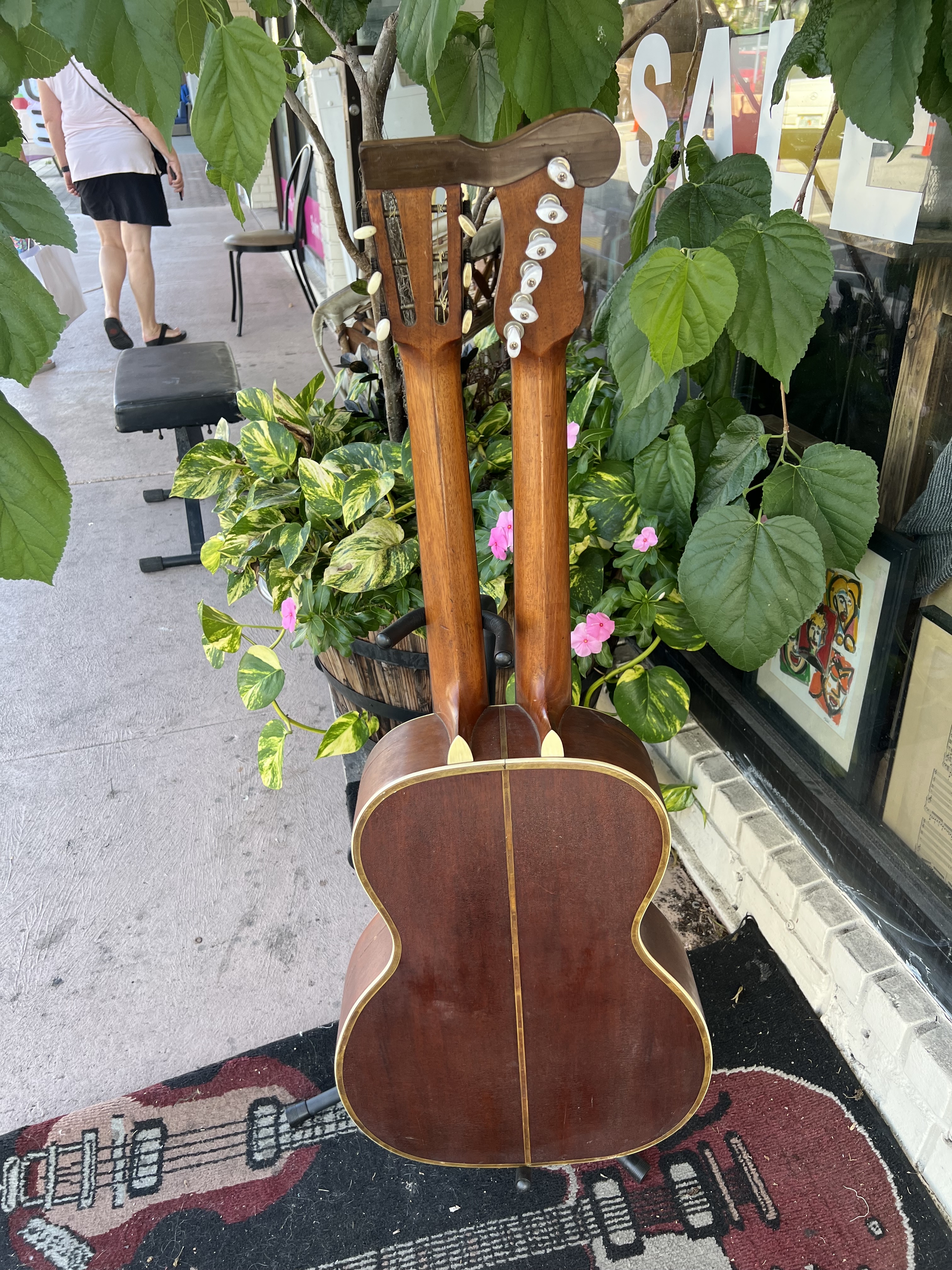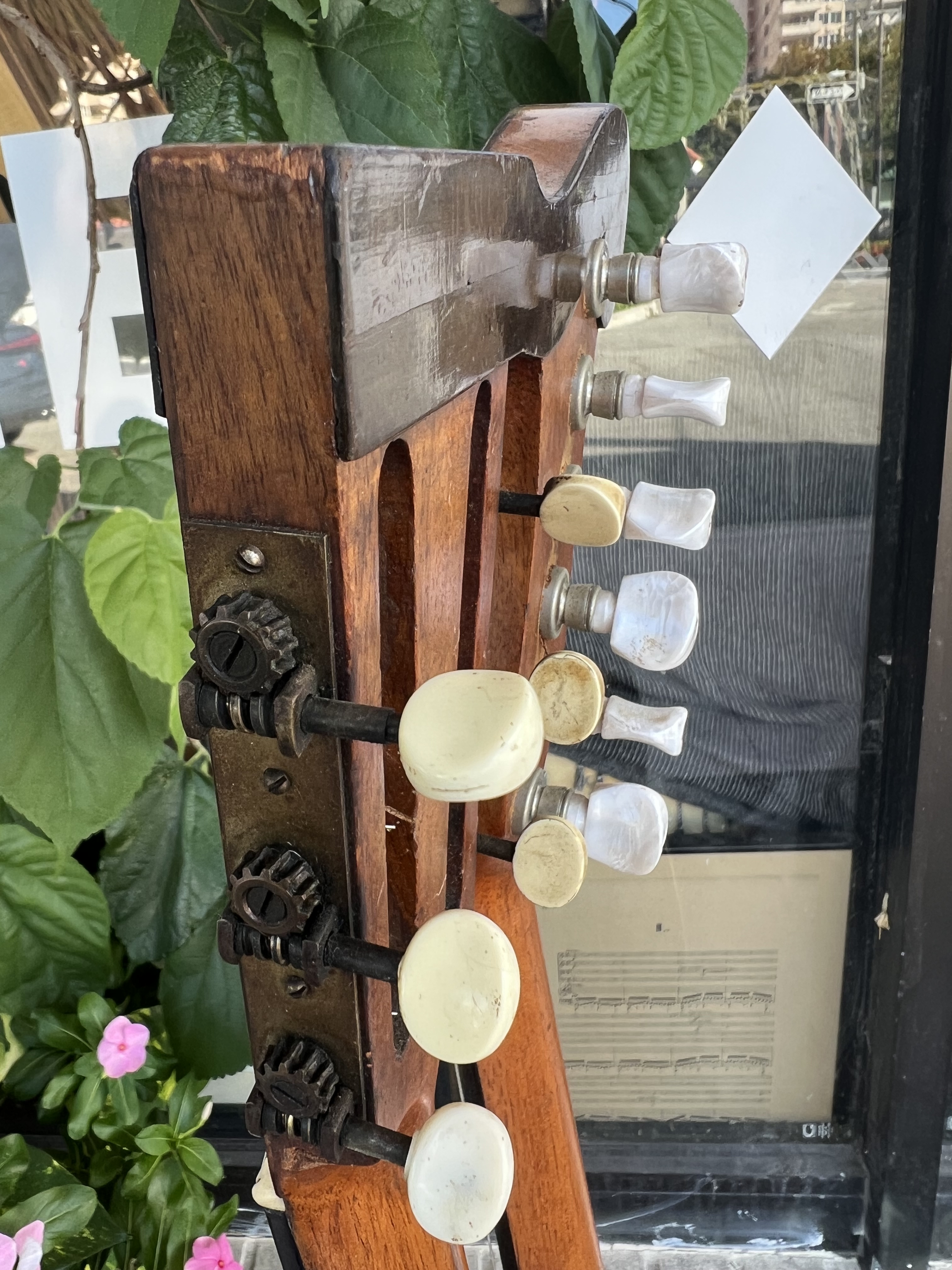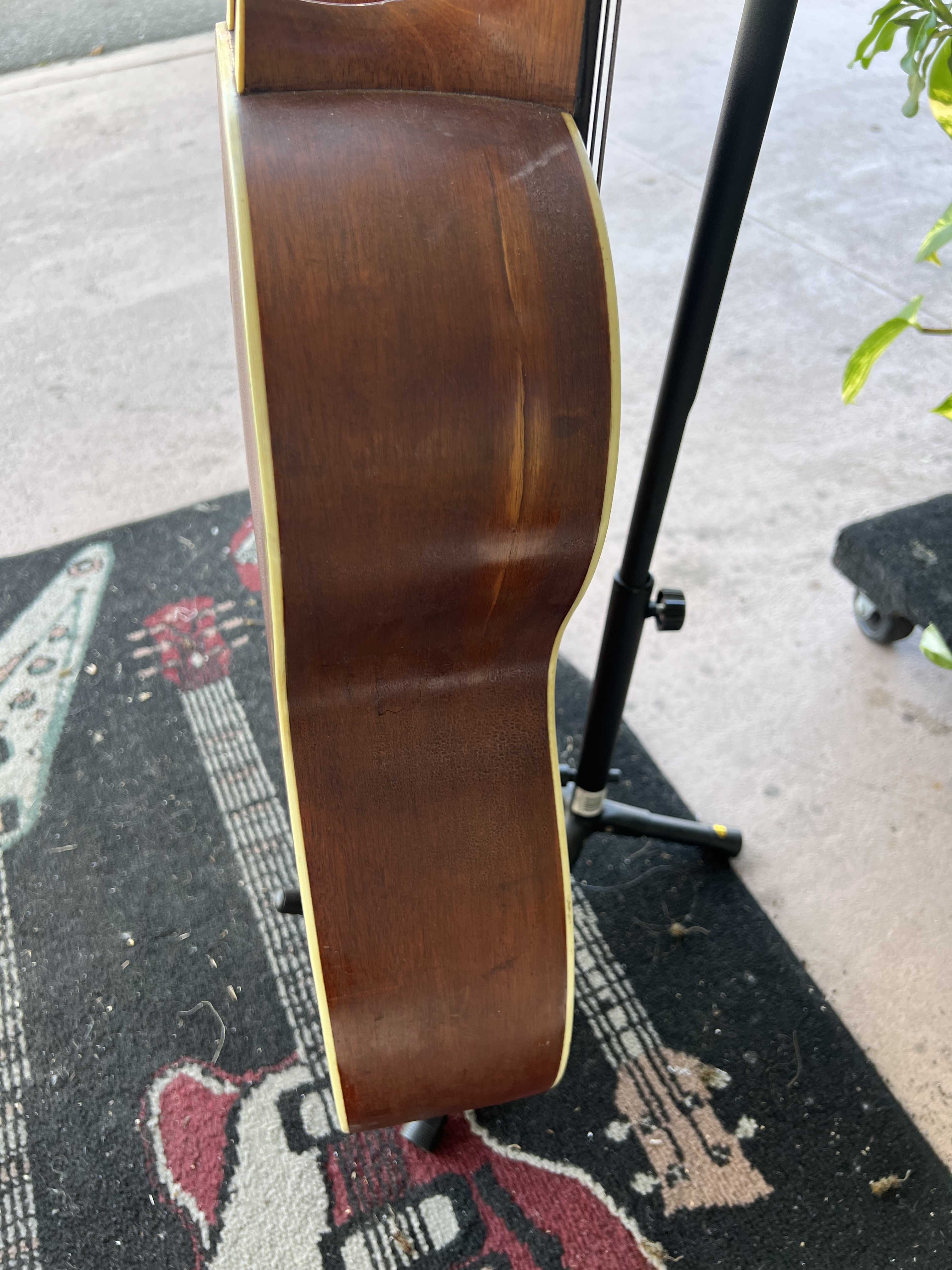 This guitar has a spruce top, mahogany back and sides with many cracks all of which have been glued up over time. It has a very straight neck, very playable, good intonation, frets are not worn, very mellow bass strings, bass string tuners have been changed to planetary banjo tuners and works great! This guitar also has two pickups, wired in stereo, one for bass side and one for the regular 6 string side and it is pre amped and uses a 9 volt battery. This is a very good beginner’s harp guitar. Does not come with a case. $5000.00 **tax and fees added in final price below. domestic shipping available please add an additional $95.00