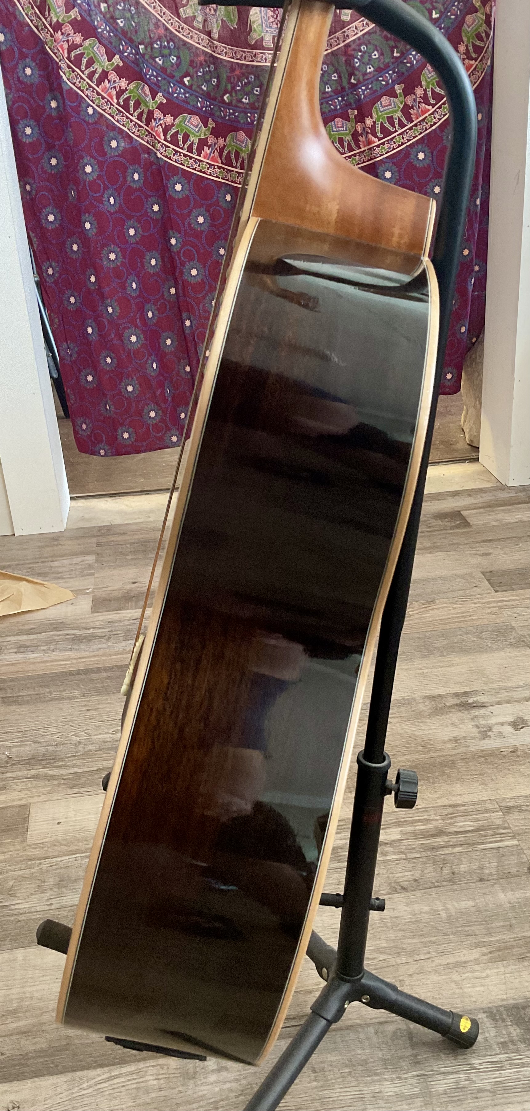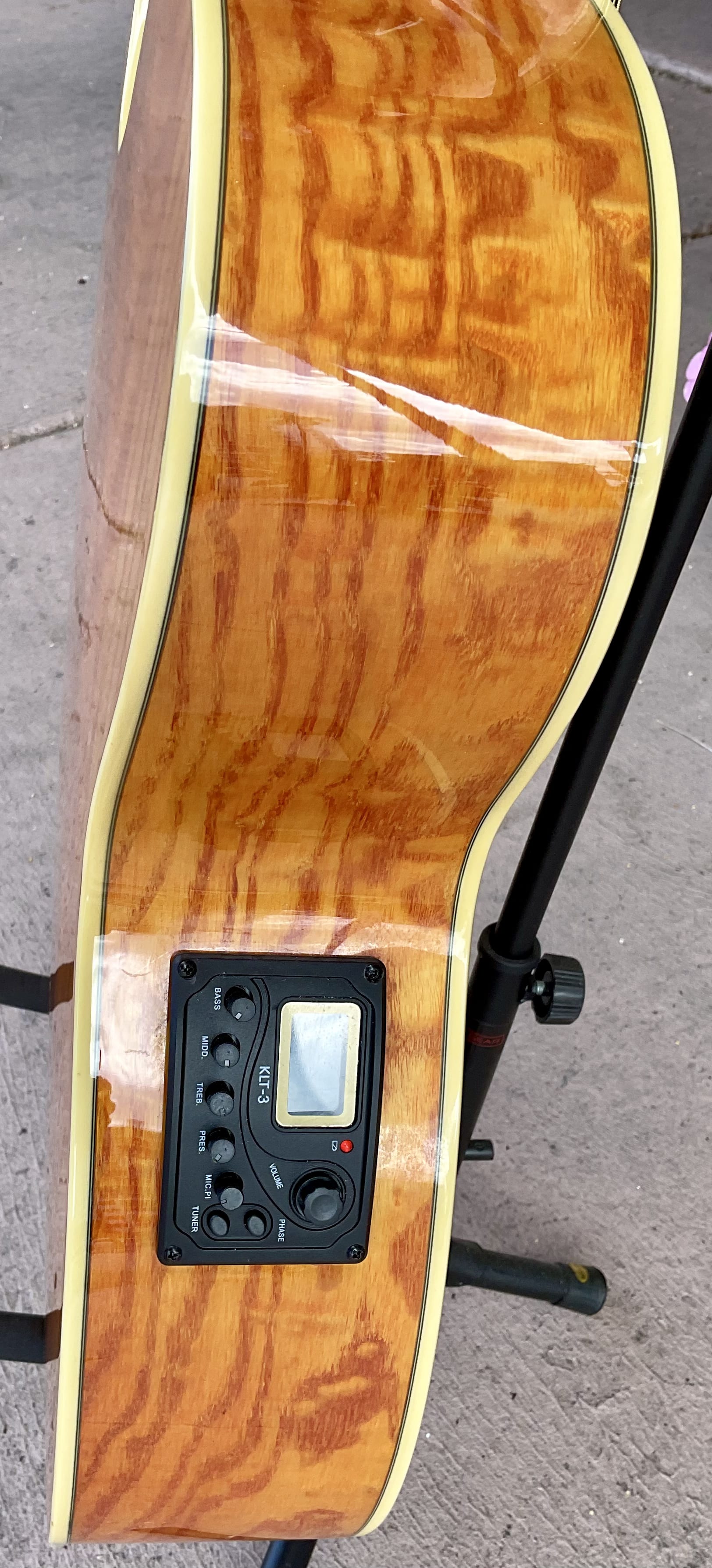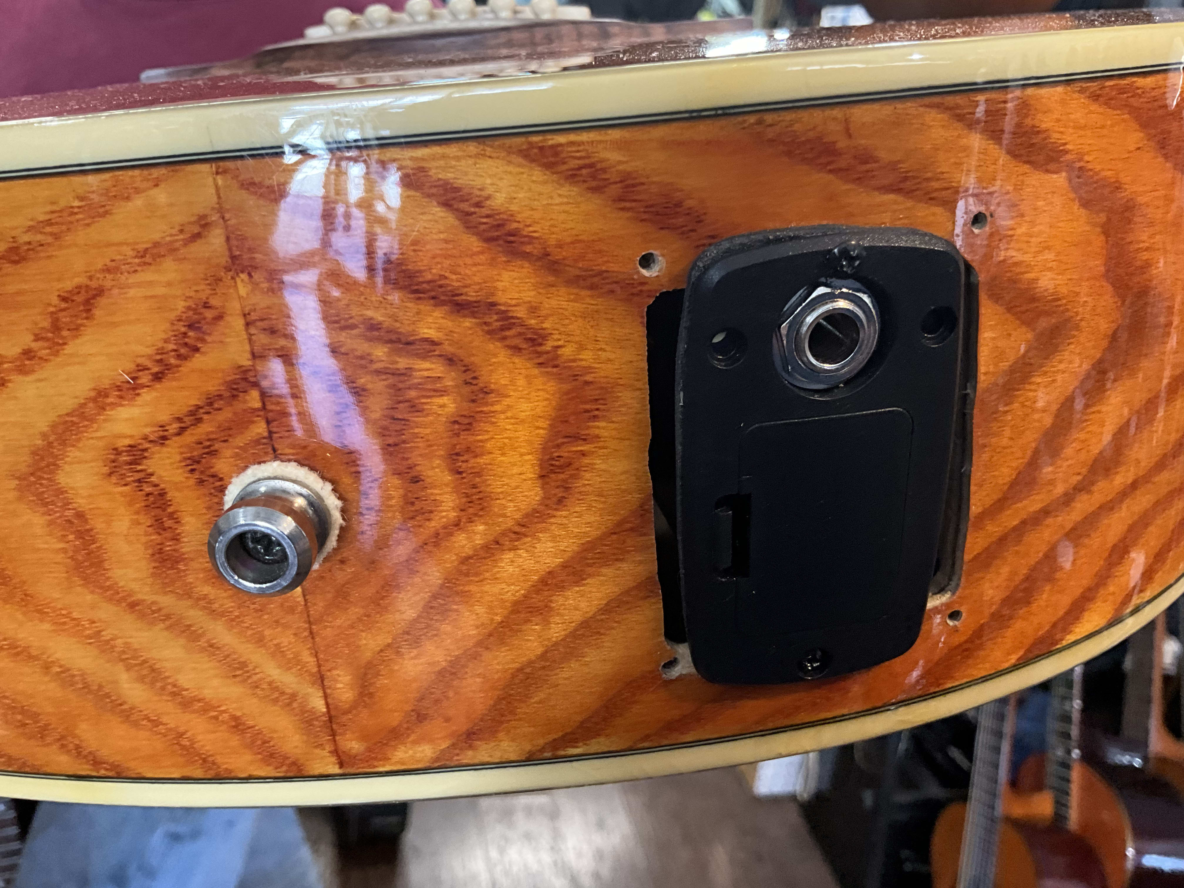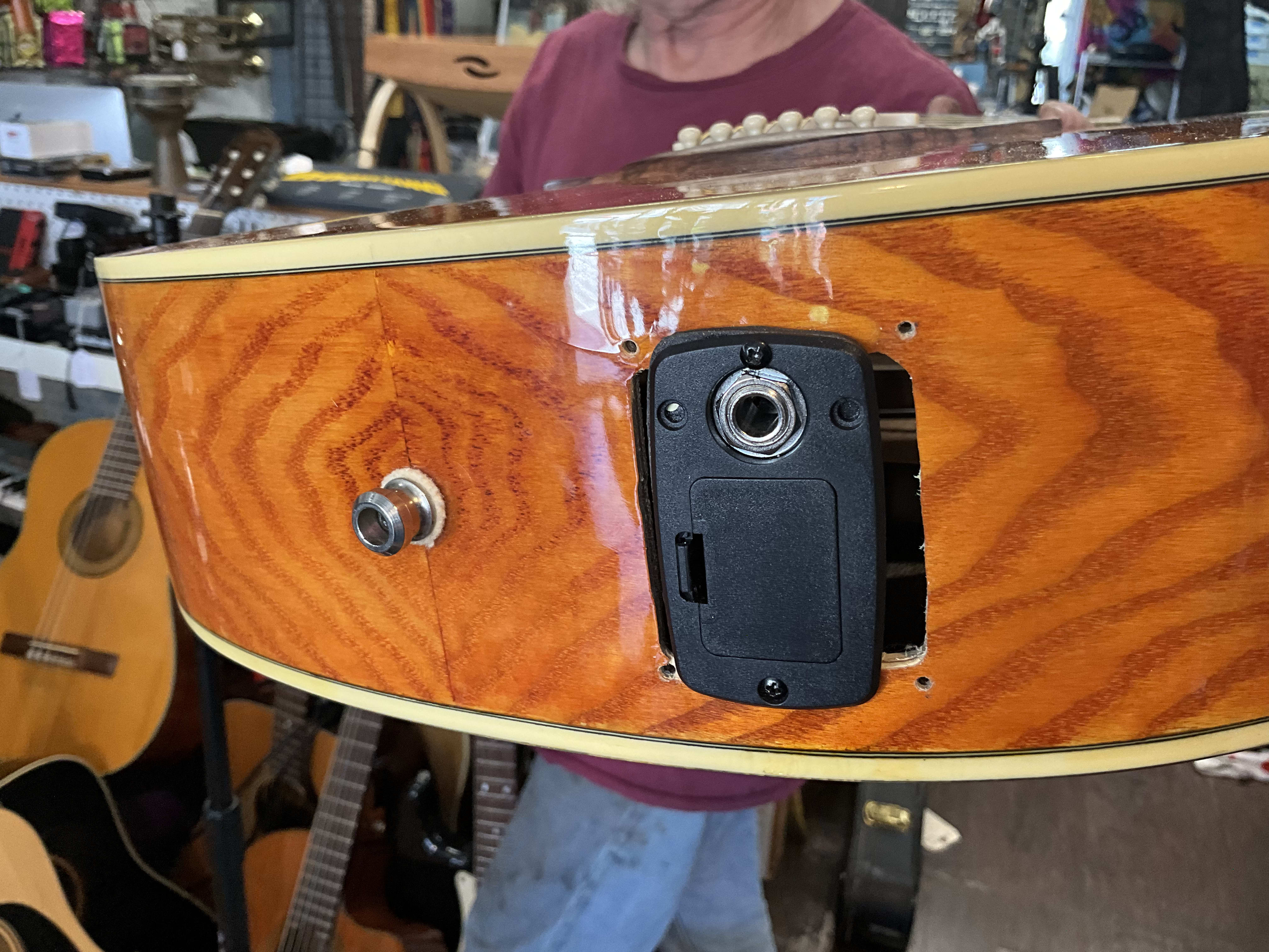 This guitar has a spruce top, mahogany back and sides with many cracks all of which have been glued up over time. It has a very straight neck, very playable, good intonation, frets are not worn, very mellow bass strings, bass string tuners have been changed to planetary banjo tuners and works great! This guitar also has two pickups, wired in stereo, one for bass side and one for the regular 6 string side and it is pre amped and uses a 9 volt battery. This is a very good beginner’s harp guitar. Does not come with a case. $5000.00 **tax and fees added in final price below. domestic shipping available please add an additional $95.00