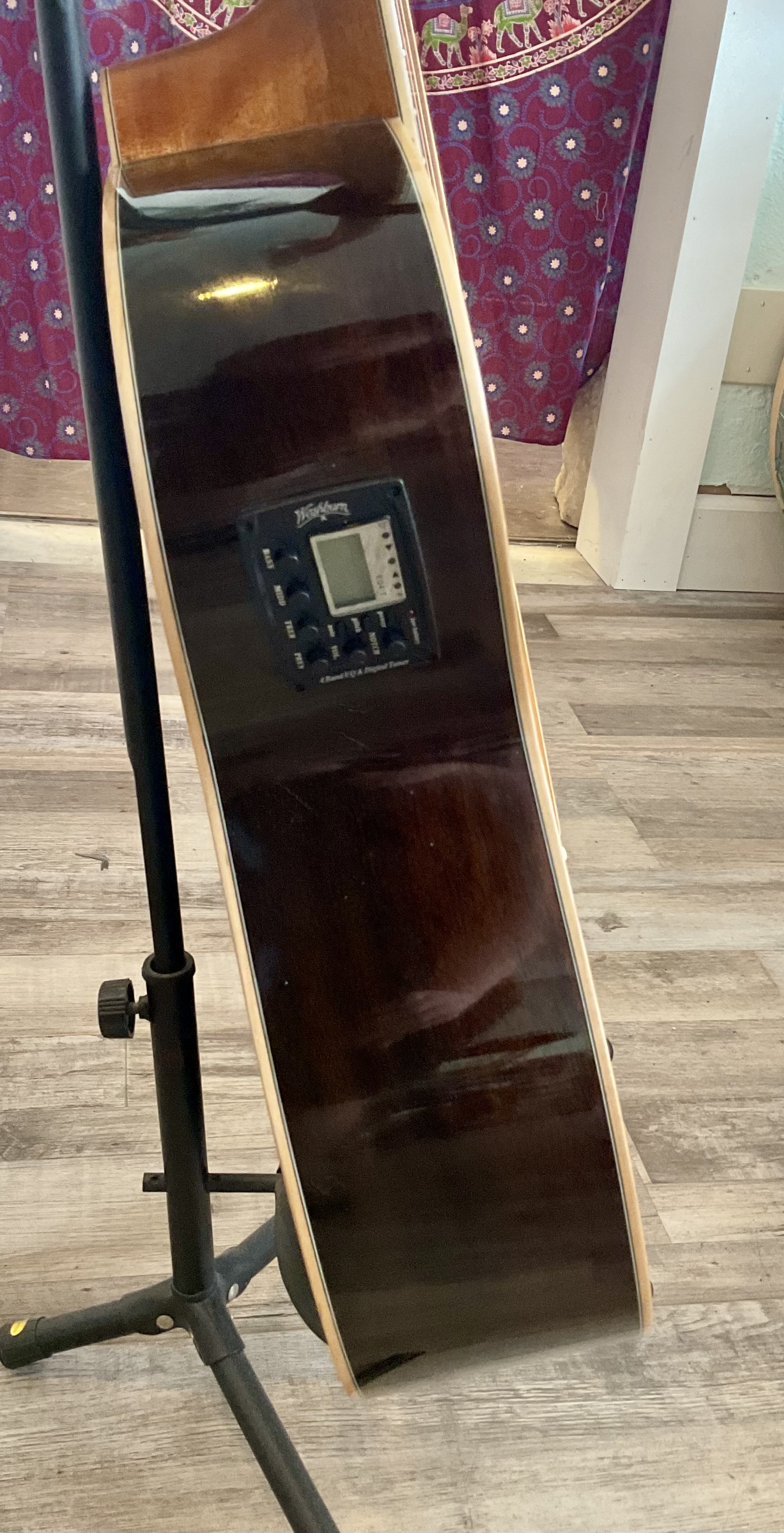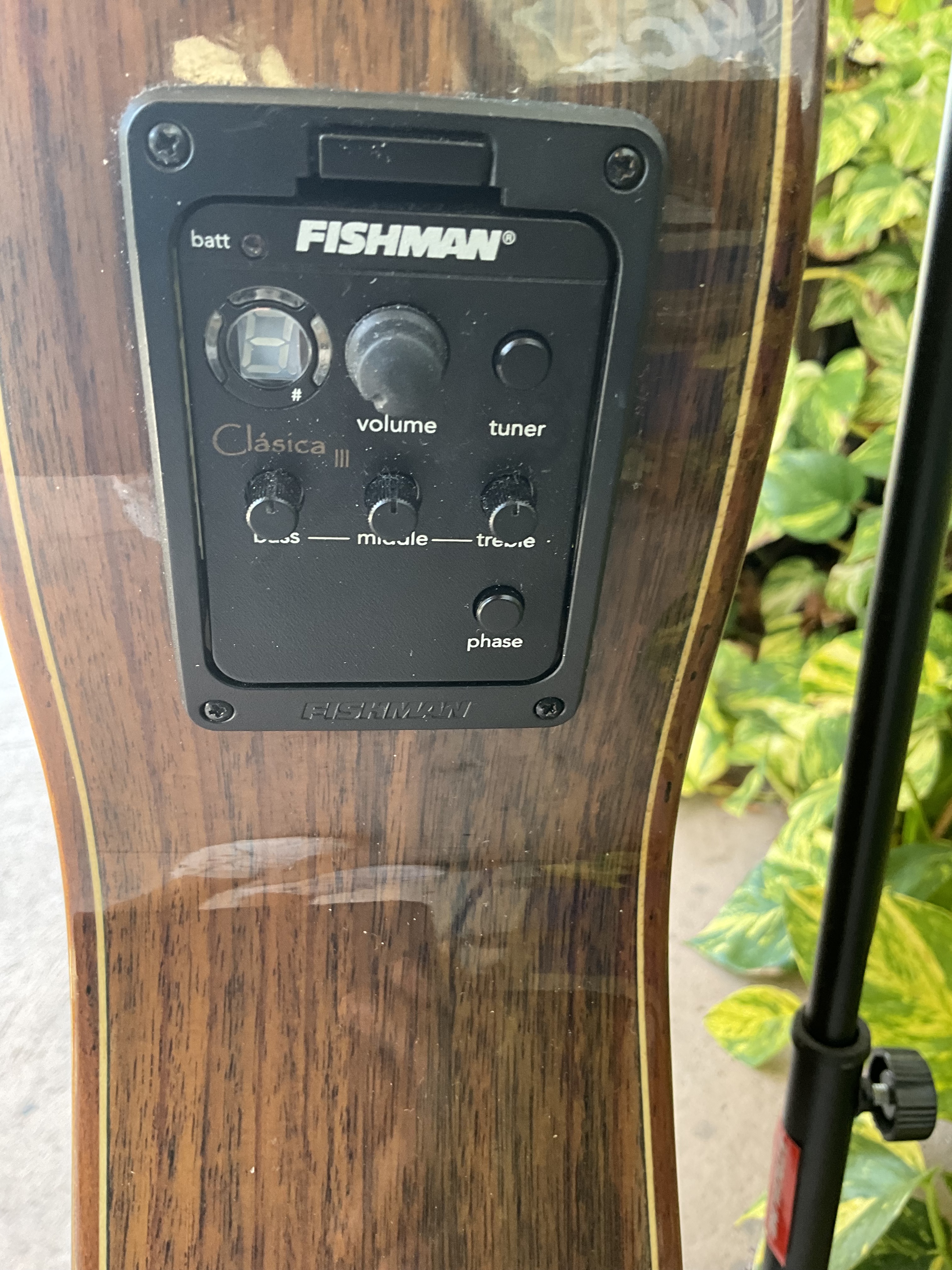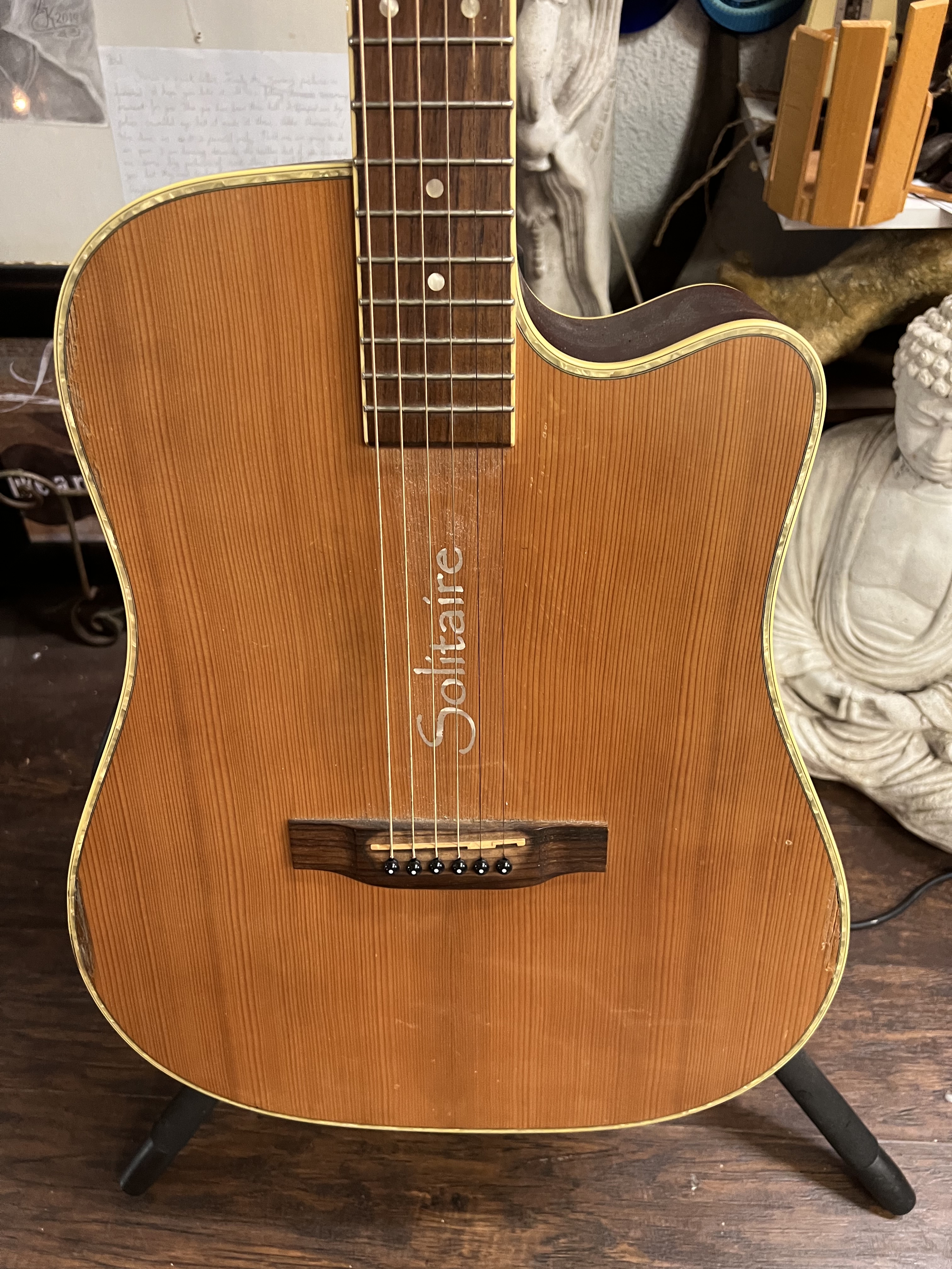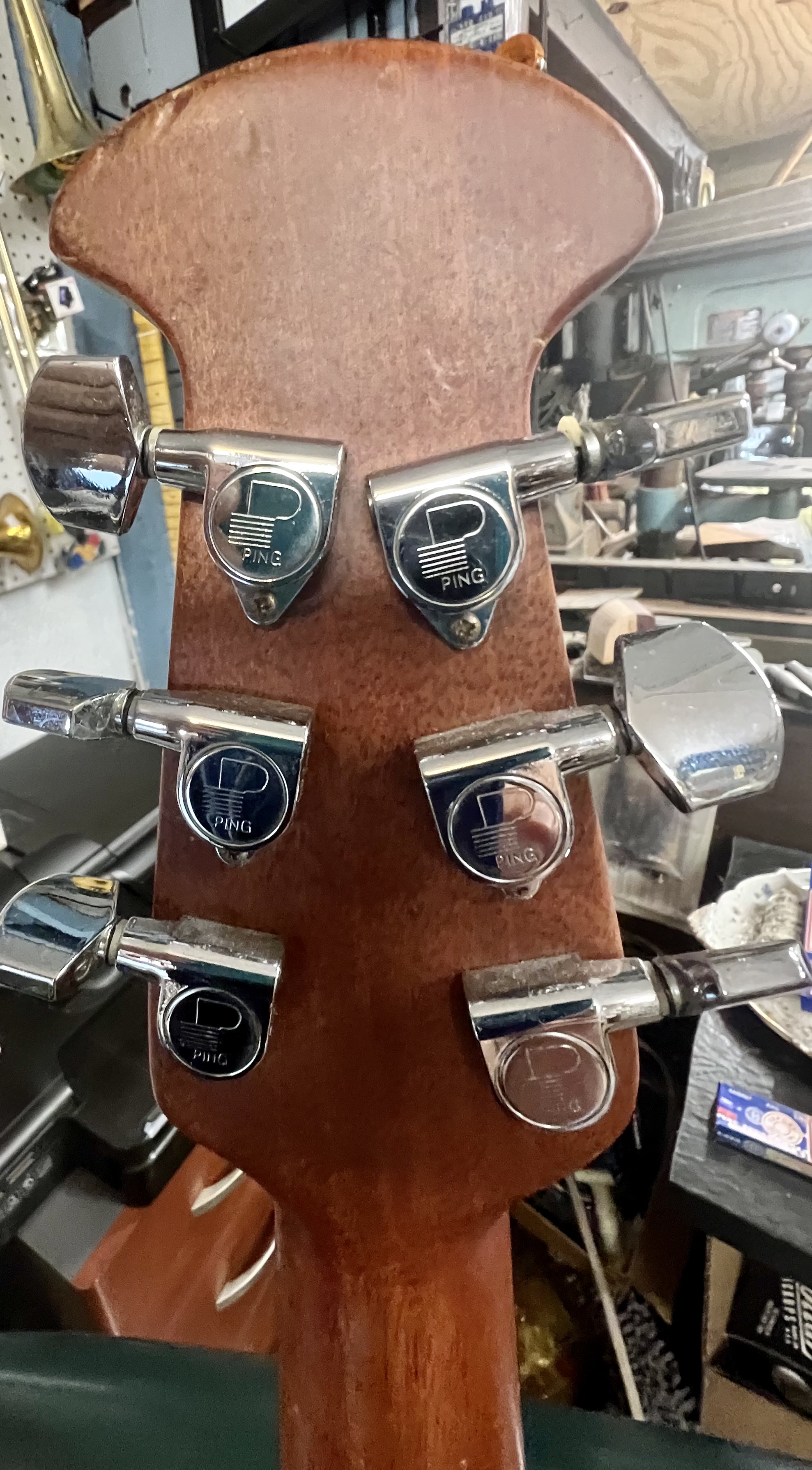 This guitar has a spruce top, mahogany back and sides with many cracks all of which have been glued up over time. It has a very straight neck, very playable, good intonation, frets are not worn, very mellow bass strings, bass string tuners have been changed to planetary banjo tuners and works great! This guitar also has two pickups, wired in stereo, one for bass side and one for the regular 6 string side and it is pre amped and uses a 9 volt battery. This is a very good beginner’s harp guitar. Does not come with a case. $5000.00 **tax and fees added in final price below. domestic shipping available please add an additional $95.00
