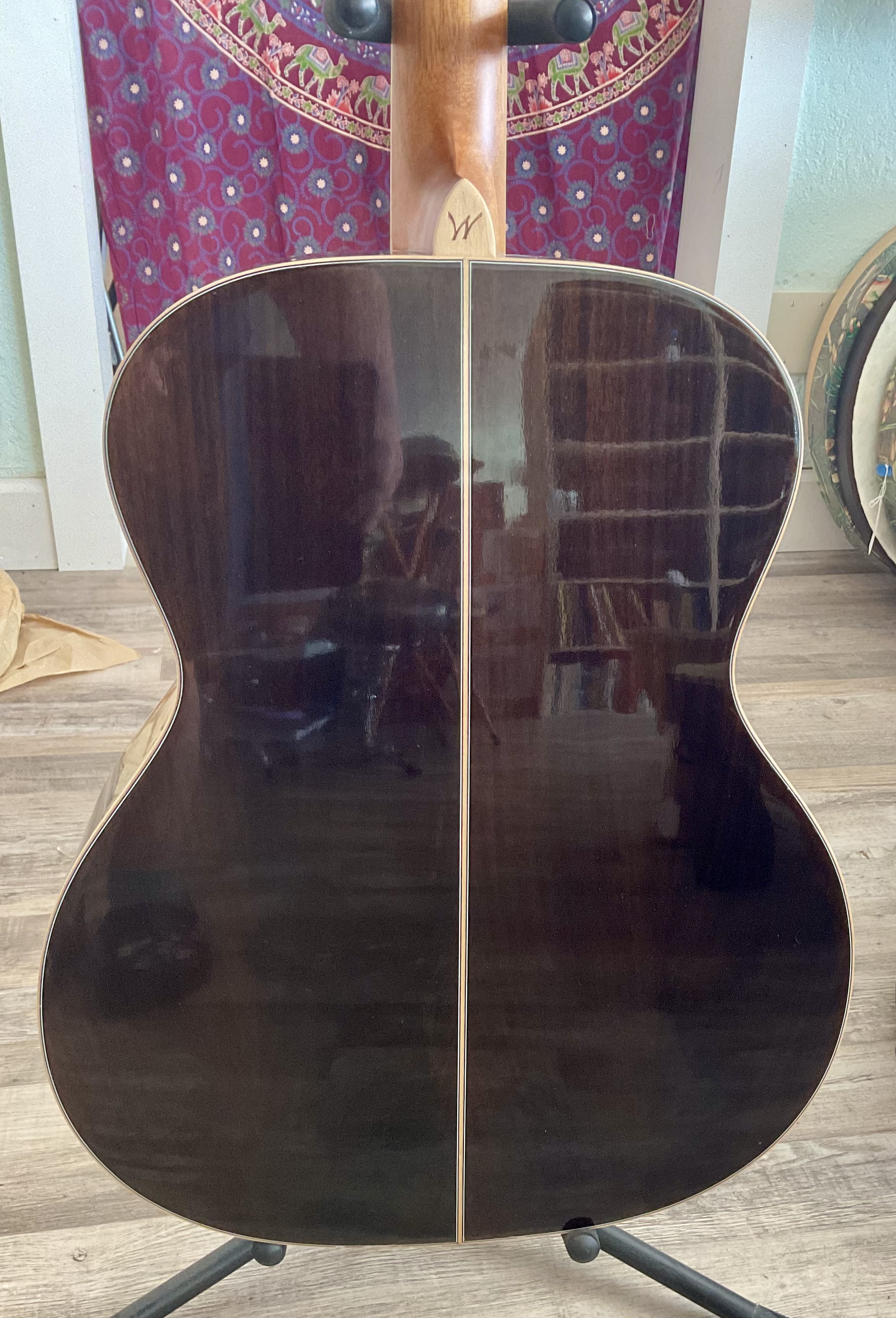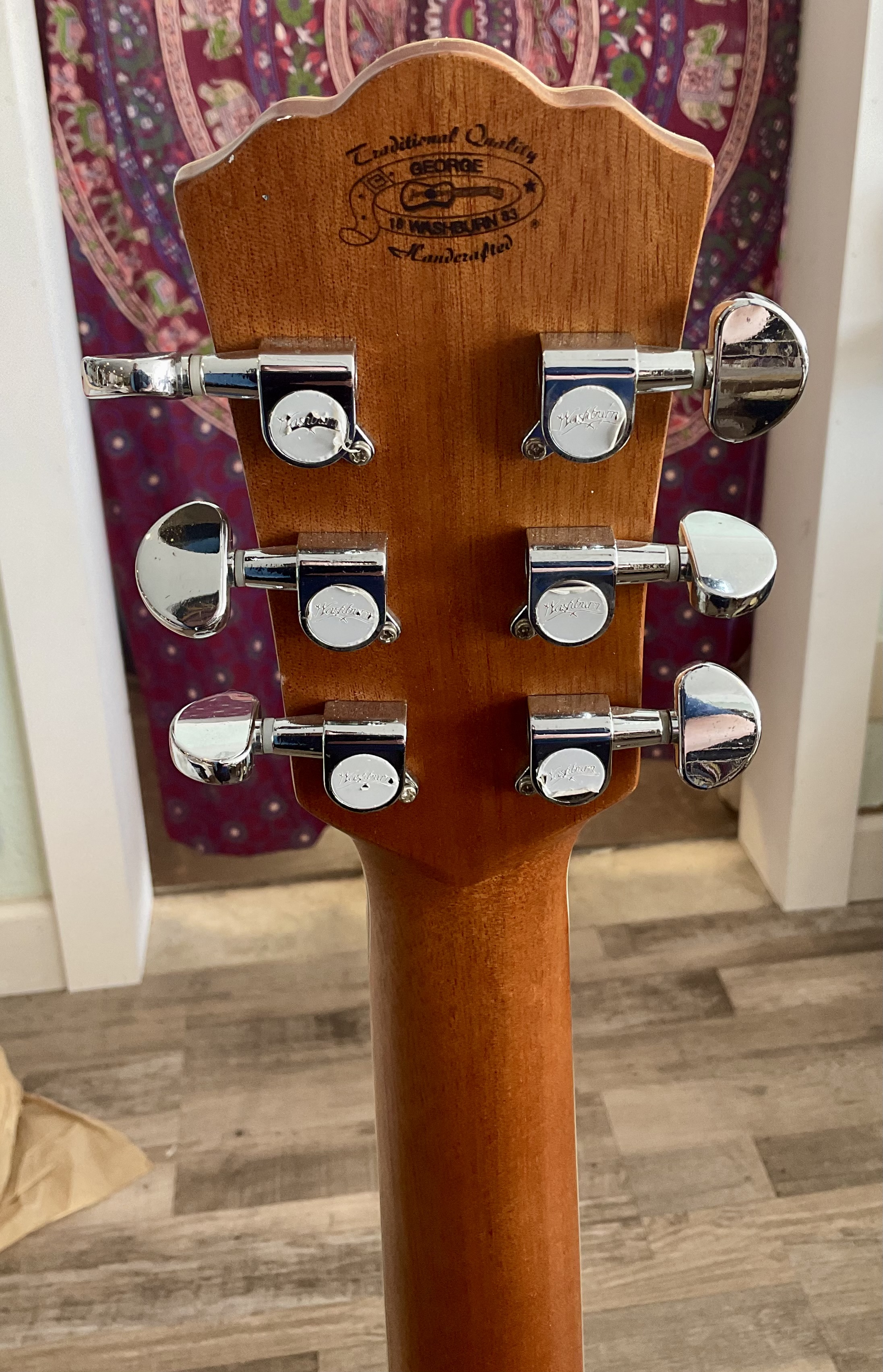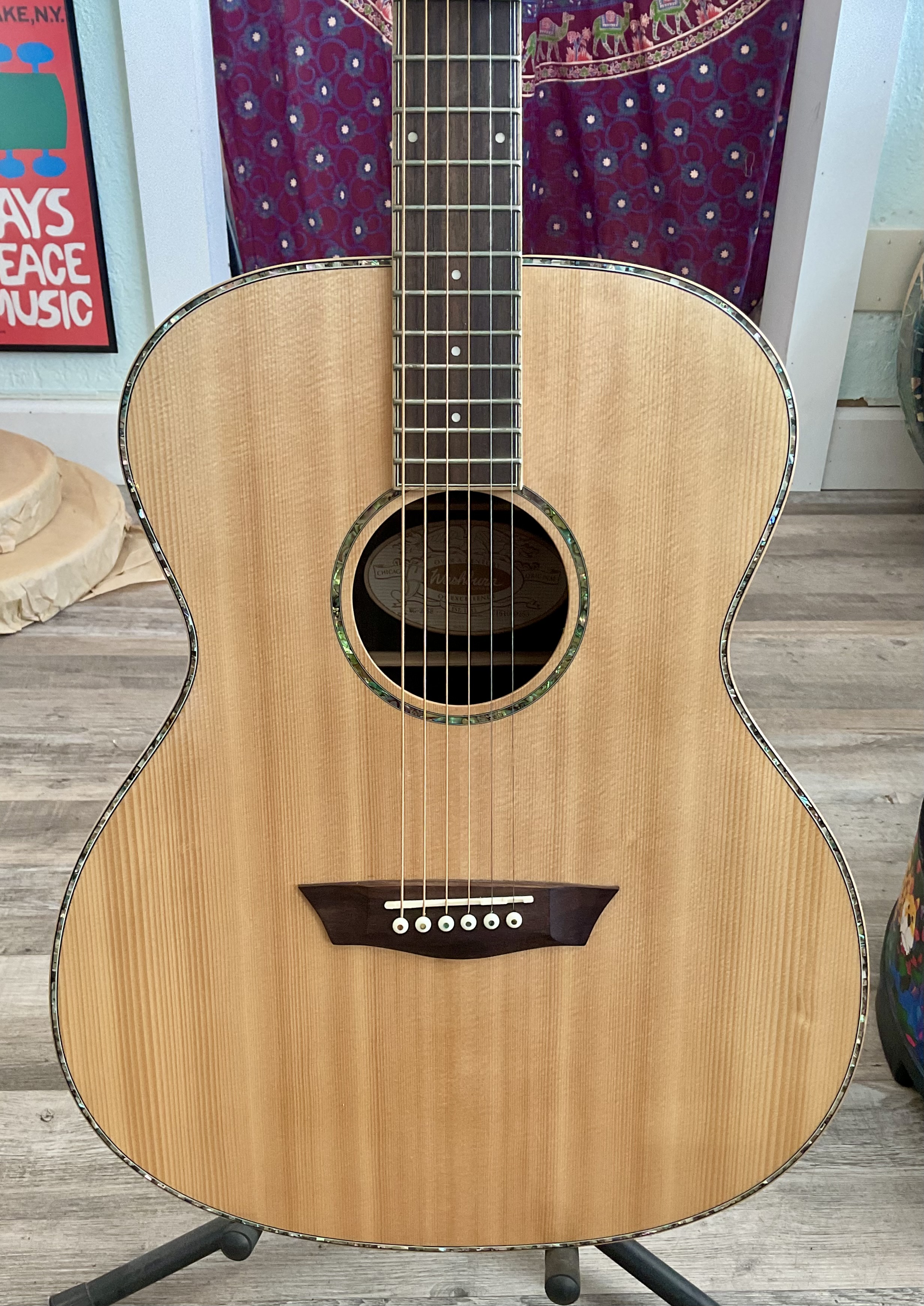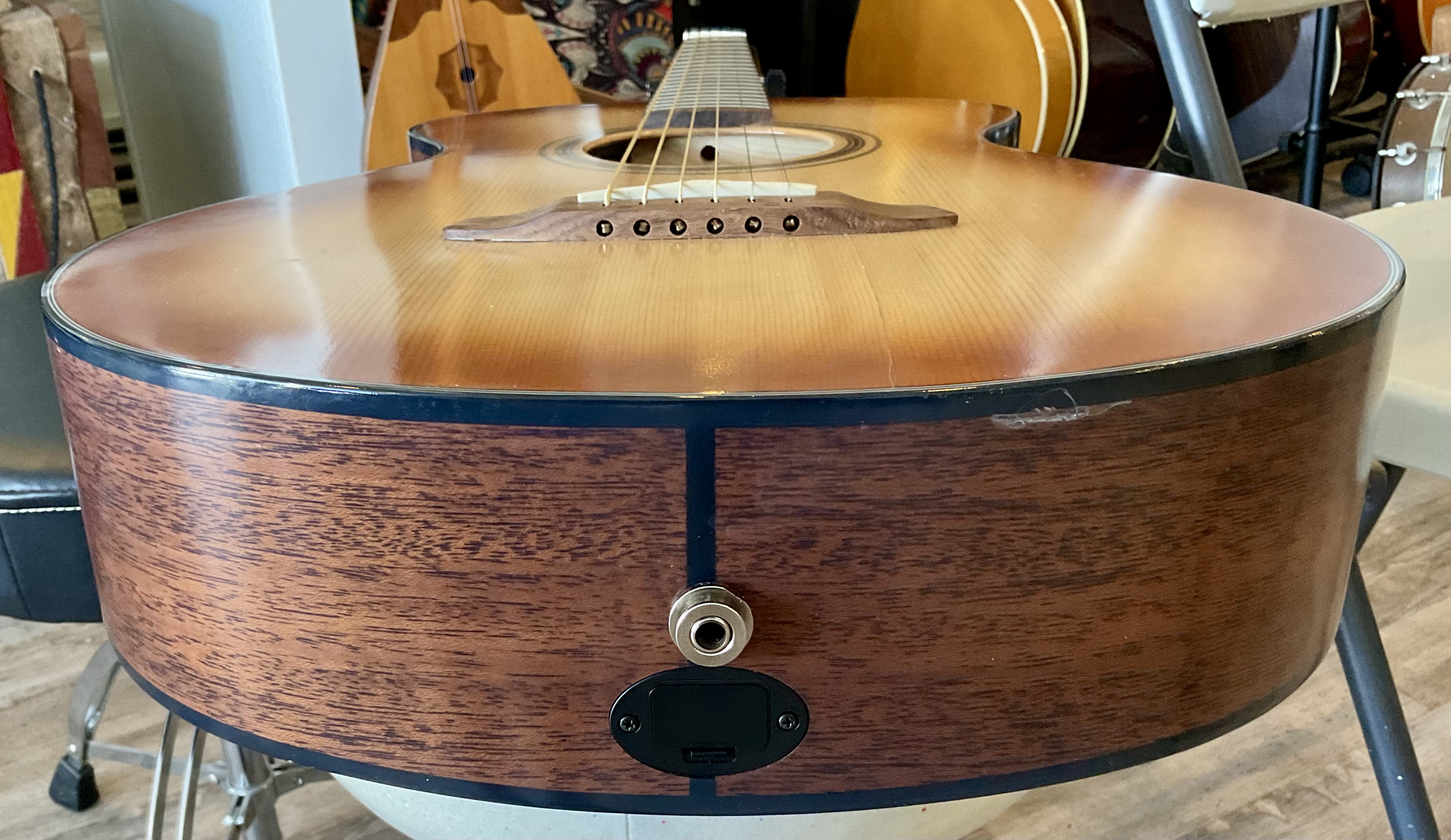 This guitar has a spruce top, mahogany back and sides with many cracks all of which have been glued up over time. It has a very straight neck, very playable, good intonation, frets are not worn, very mellow bass strings, bass string tuners have been changed to planetary banjo tuners and works great! This guitar also has two pickups, wired in stereo, one for bass side and one for the regular 6 string side and it is pre amped and uses a 9 volt battery. This is a very good beginner’s harp guitar. Does not come with a case. $5000.00 **tax and fees added in final price below. domestic shipping available please add an additional $95.00