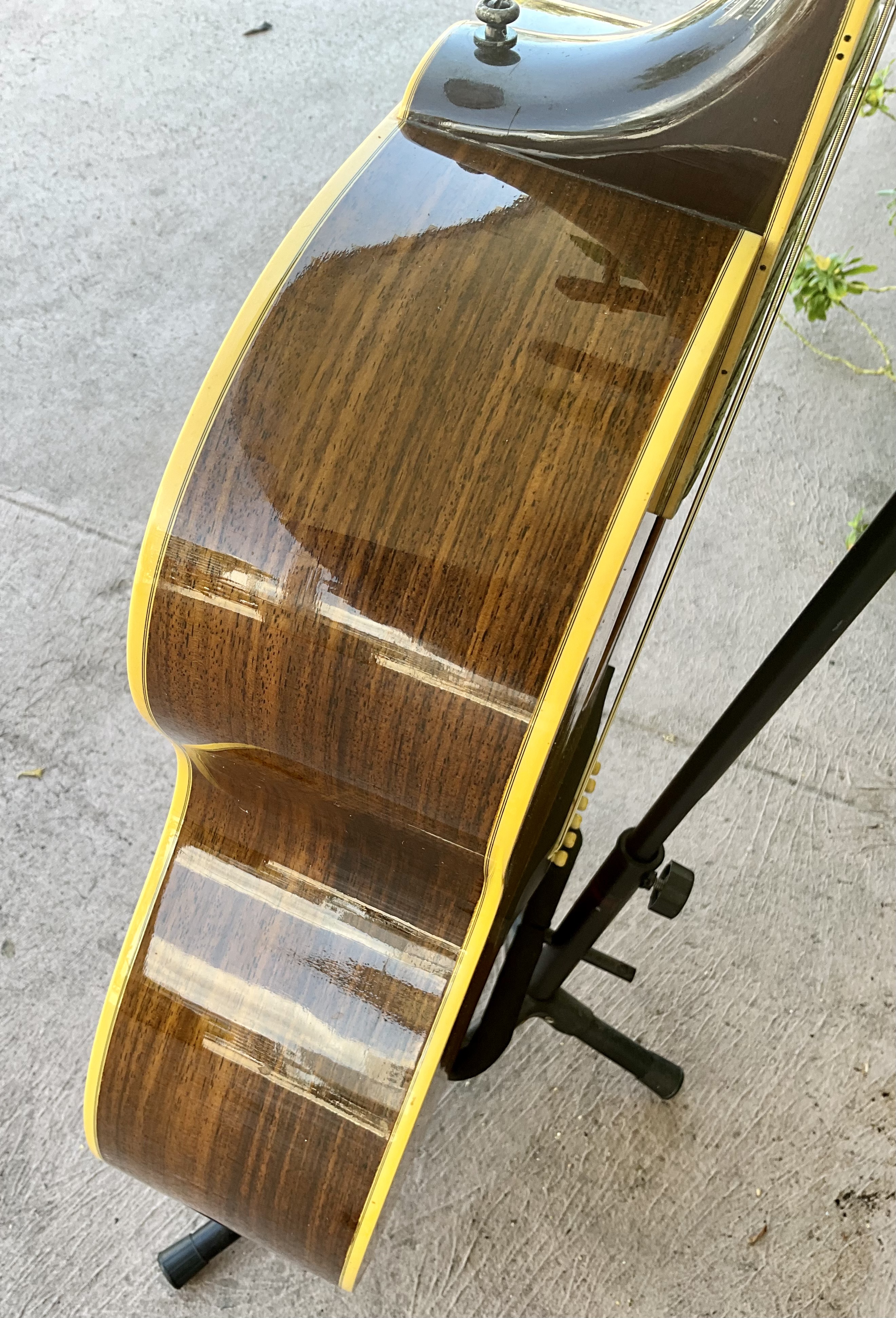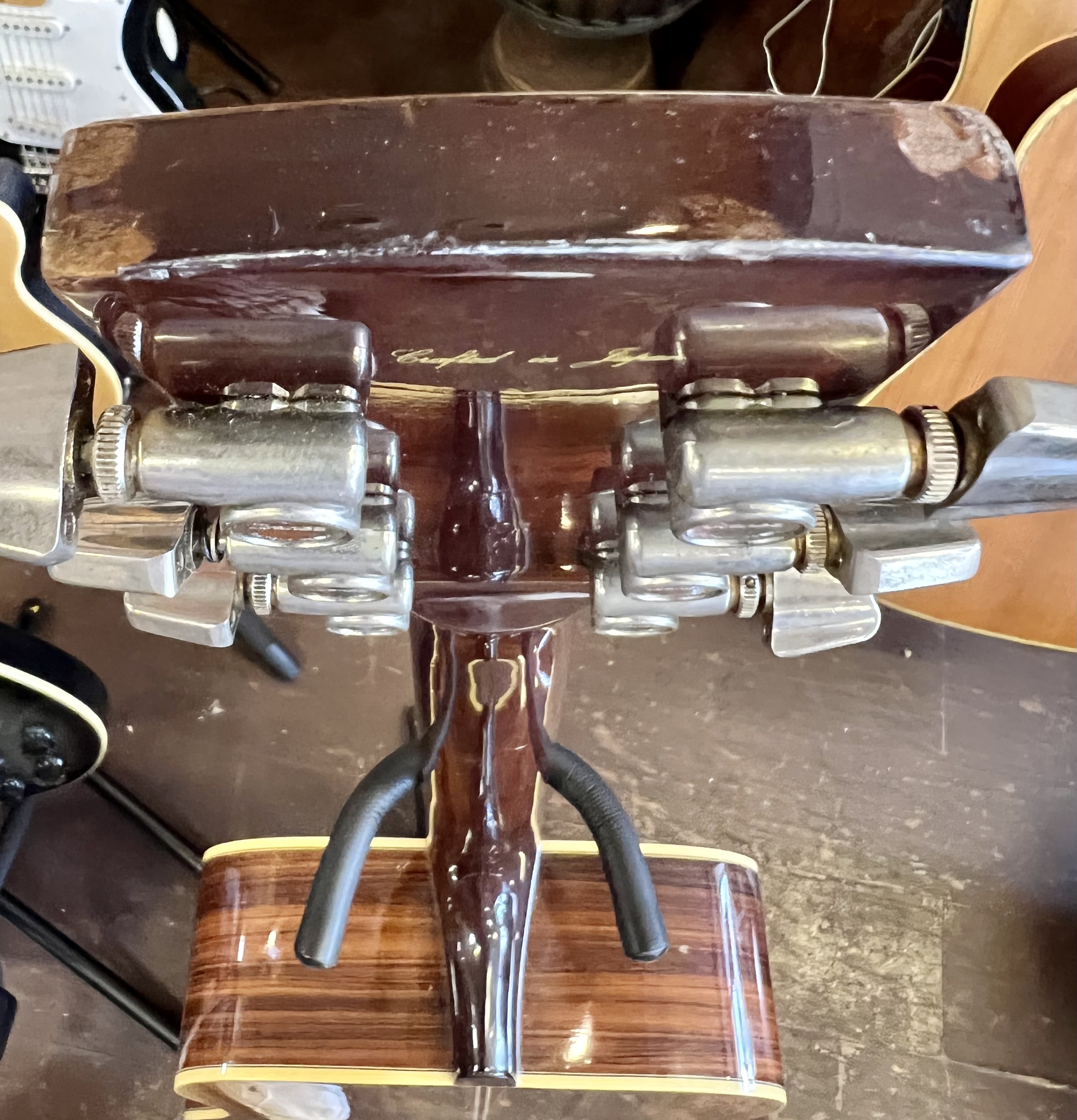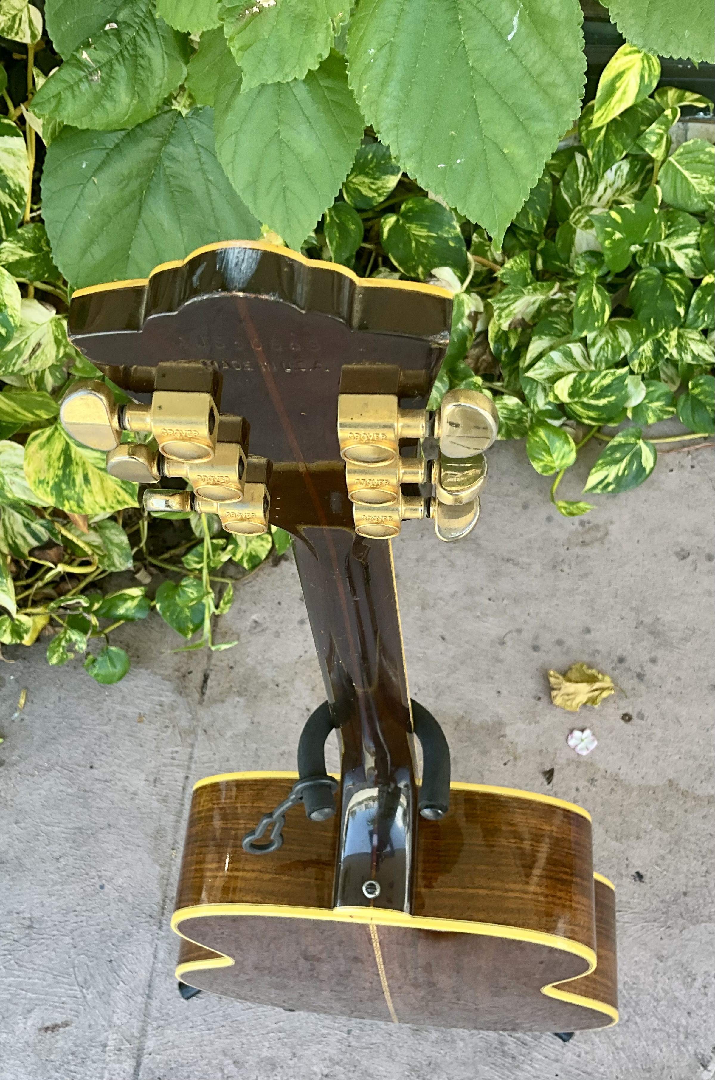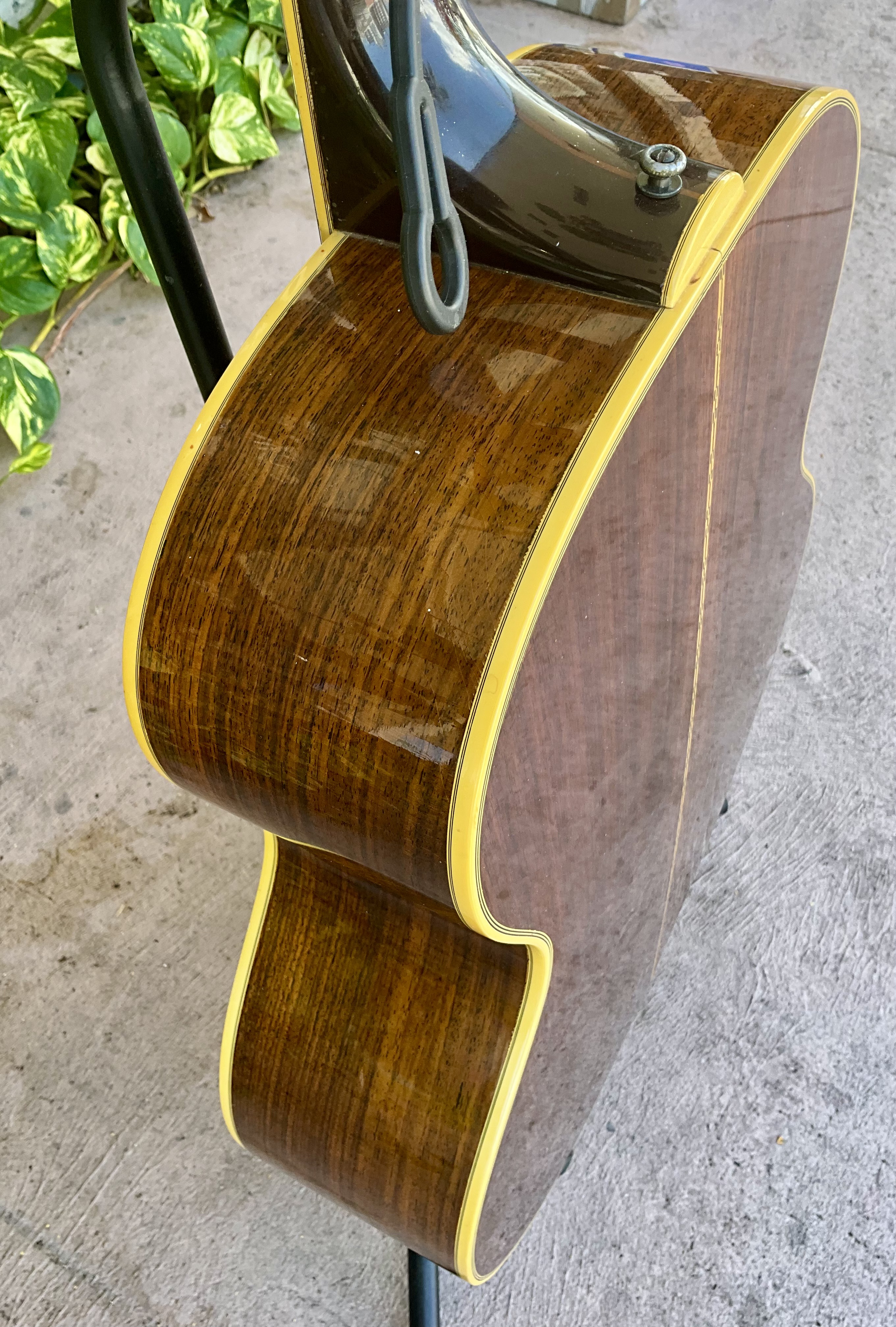 Beautiful Brazilian Rosewood ! there aren’t many like it around .comes with under the saddle pickup with an in-sound hole volume control also sold with original black case with dark green plush lining. This instrument has been lovingly played by a master , perfecting the tone . The lacquer has deepened into a beautiful amber color. $5,500 **tax and fees added in final price below. domestic shipping available please add an additional $70.00