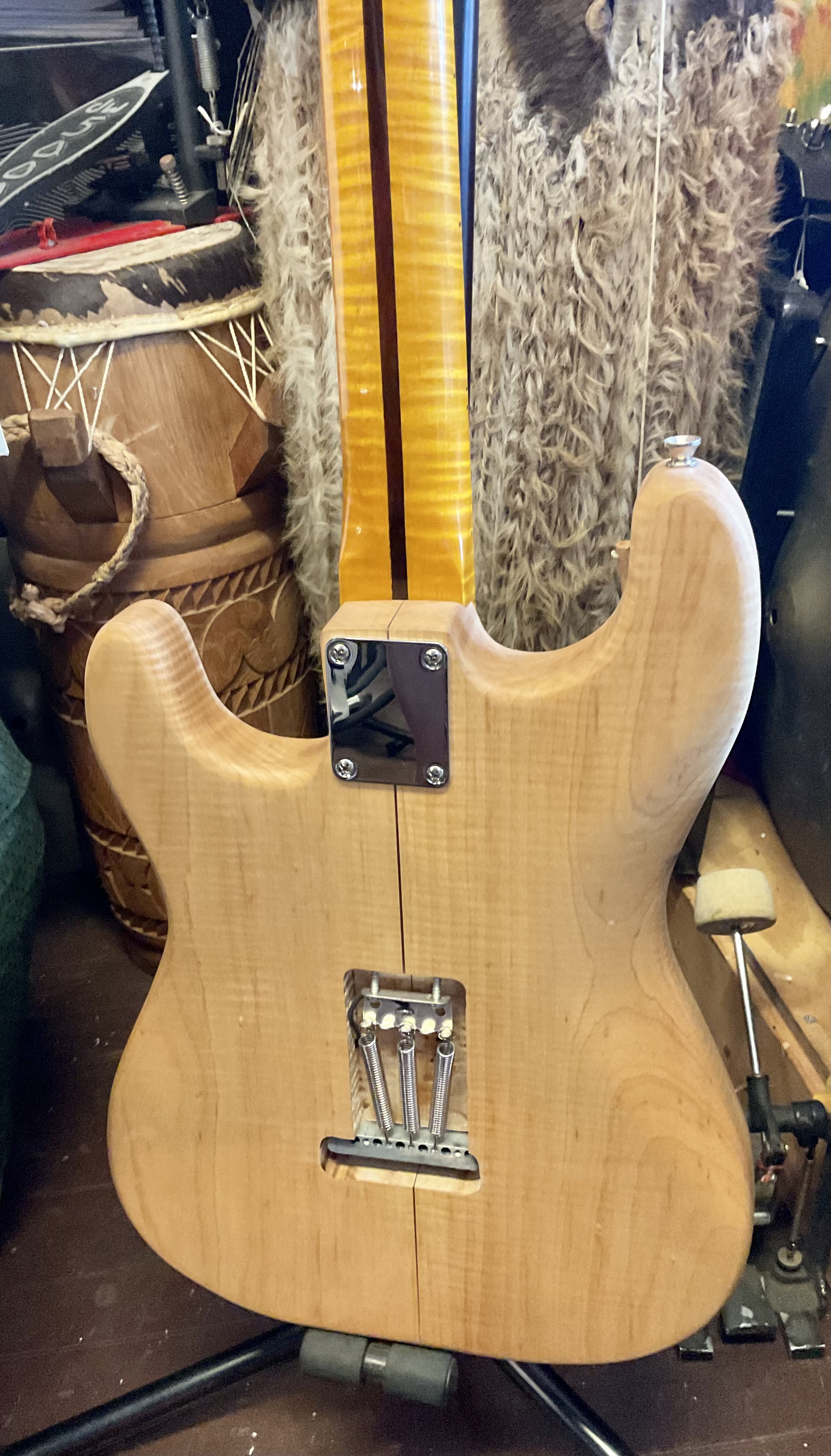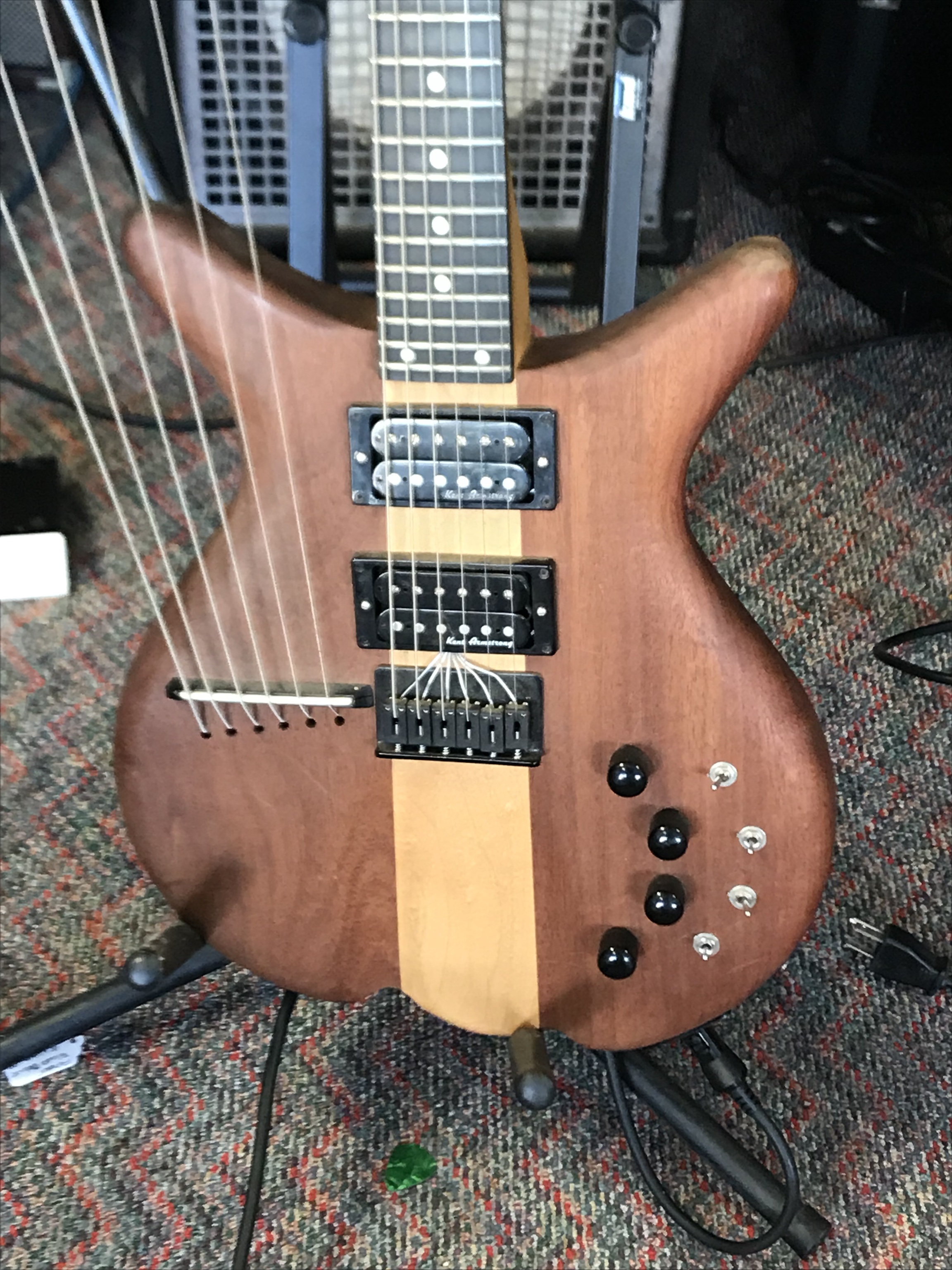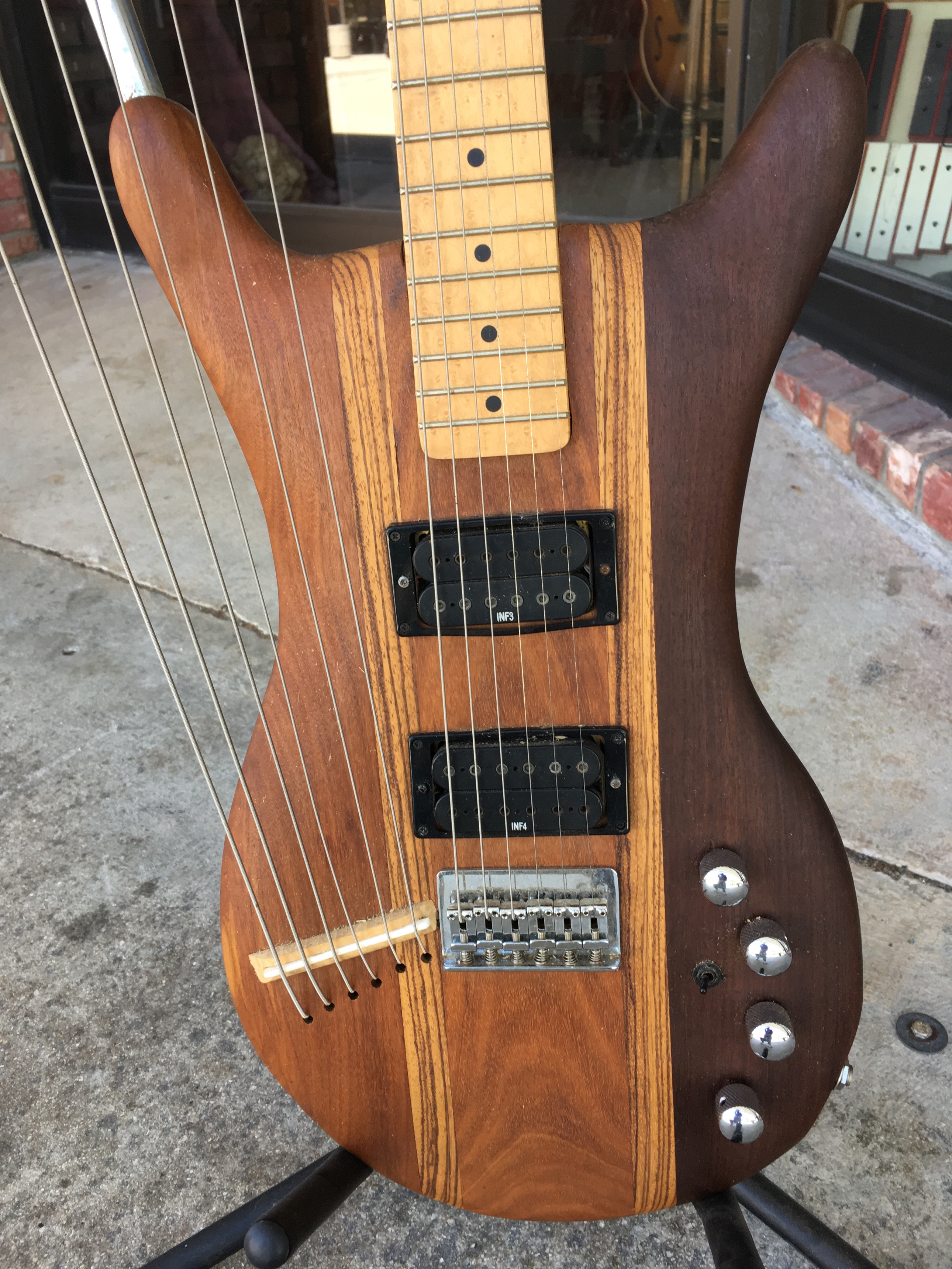 Maple neck with a maple fingerboard . the body is made out of black walnut and zebra wood , it has two Ibanez humbucking pick ups ,it works off a stereo cord and has a volume and tone for both the guitar and the six harp bass strings ..the stanchion is made of flamed maple and has violin pegs for the bass side, fender pegs for the guitar side. $1,800.00 **tax and fees added in final price below. domestic shipping available please add an additional $75.00