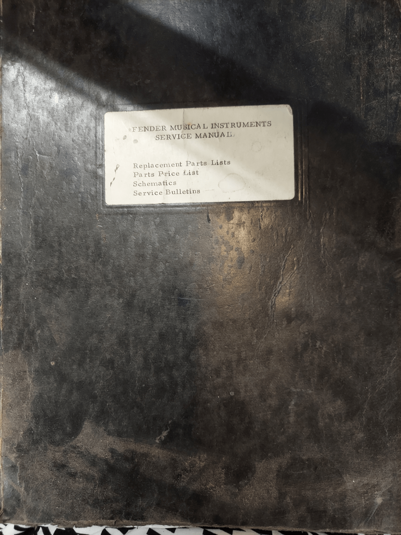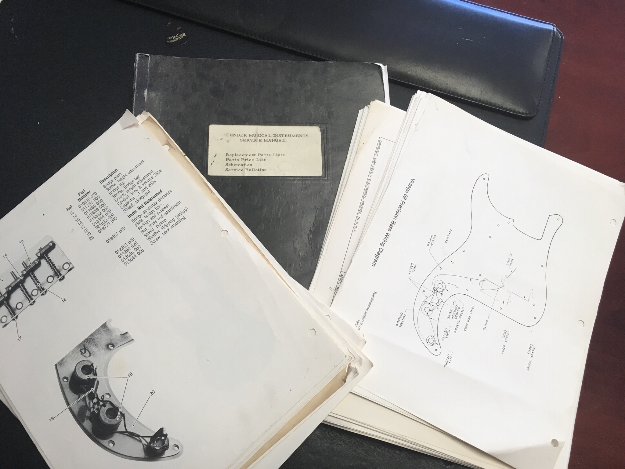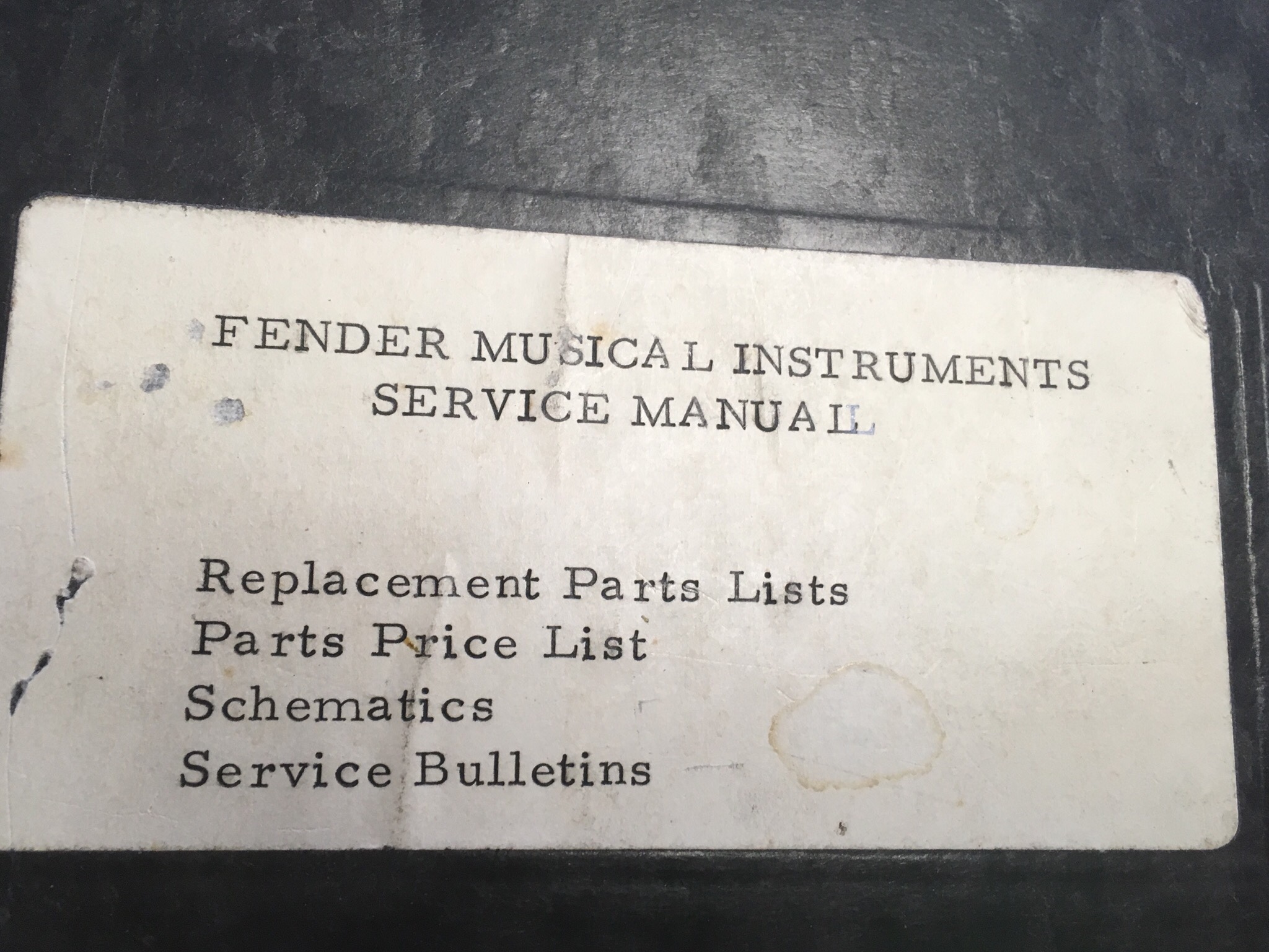 This is a cool collector’s item. This manual contains loose binding with papers of replacement parts lists, schematics, parts lists of all Fender instruments, and service bulletins Good condition $150 **tax and fees added in final price below domestic shipping available add additional $15