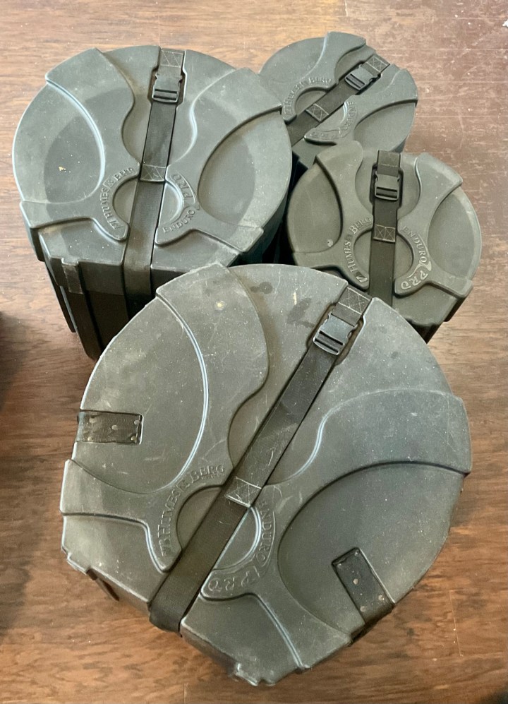 “Beatle-esque”! Includes: Bass drum 22” Aquarian head Floor Tom 18” retro fitted head with three legs Shock Mount -Tom 14” retro fitted head Shock Mount Tom 13” retro fitted head Humes & Berg Enduro Pro Cases for all 4 drums ccMG $2,500 **tax and fees added in final price below domestic shipping available add additional $350