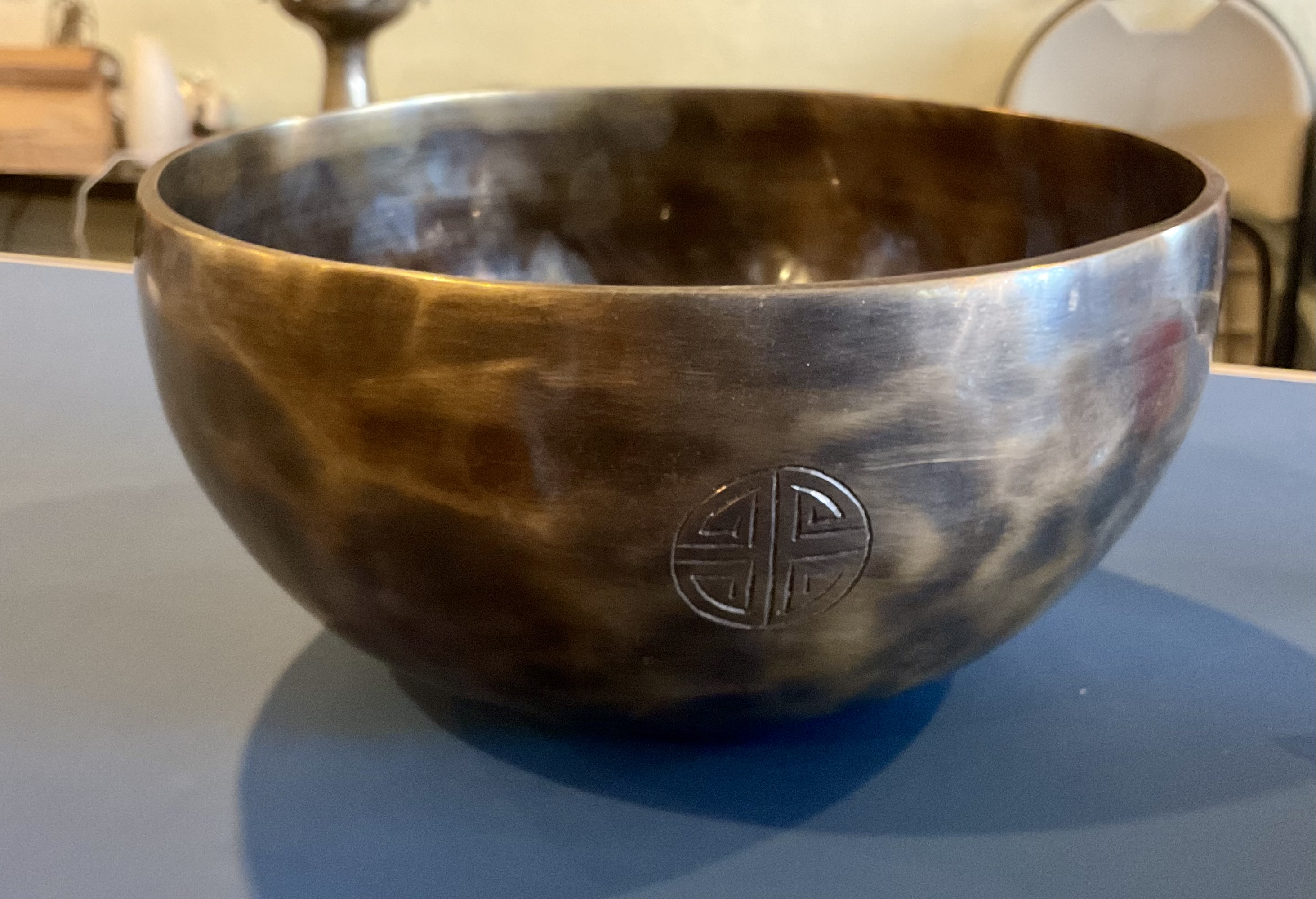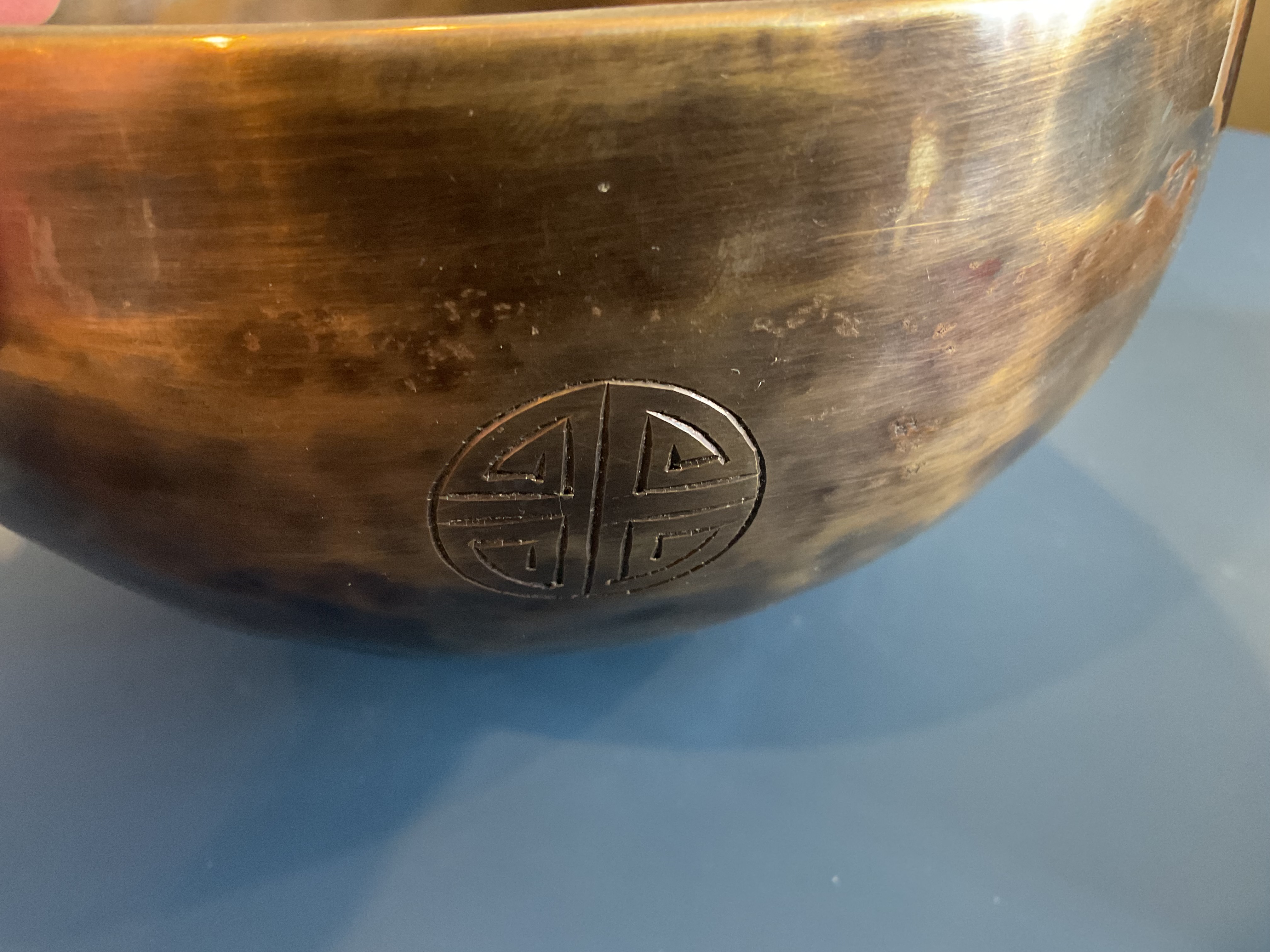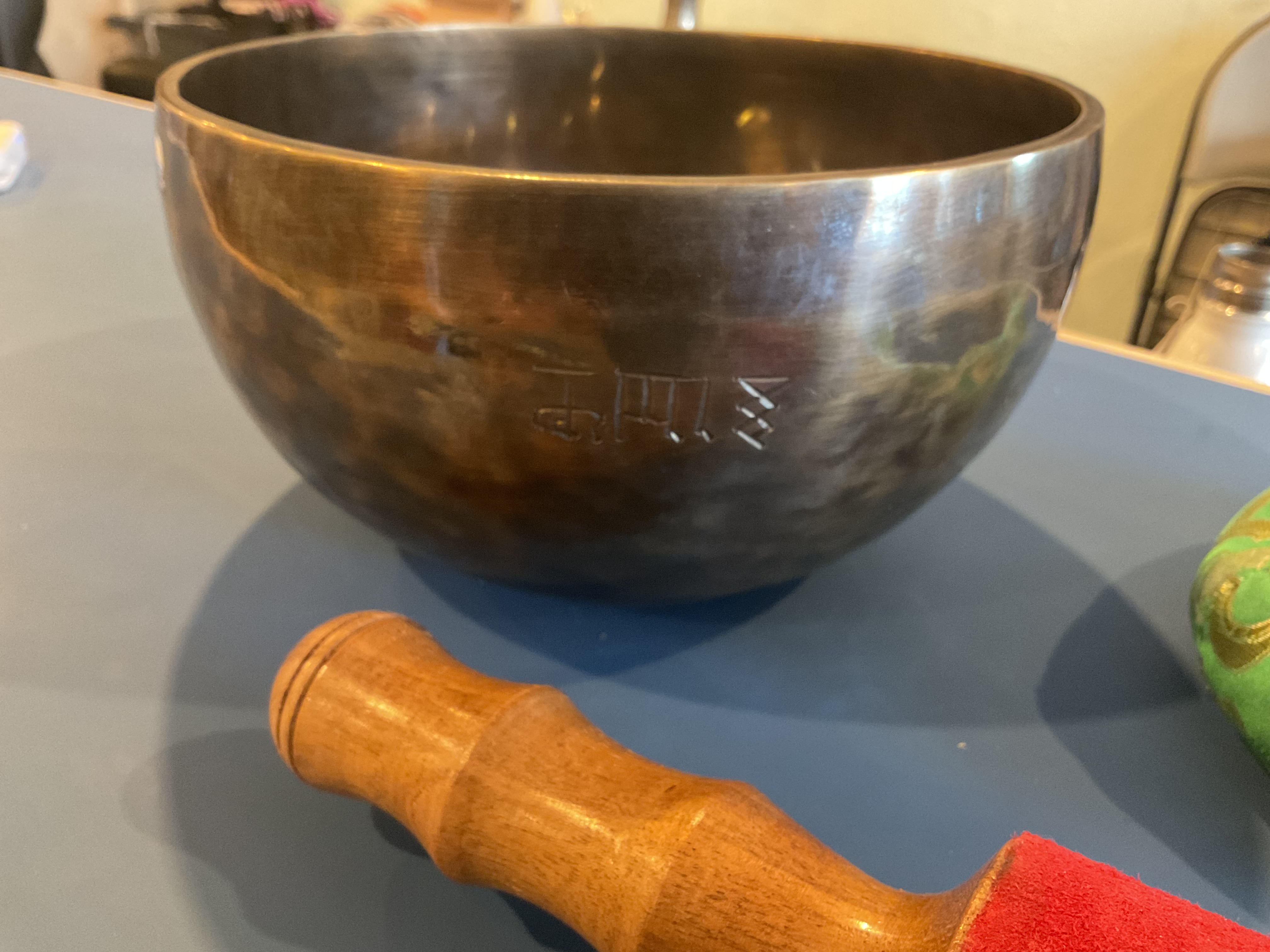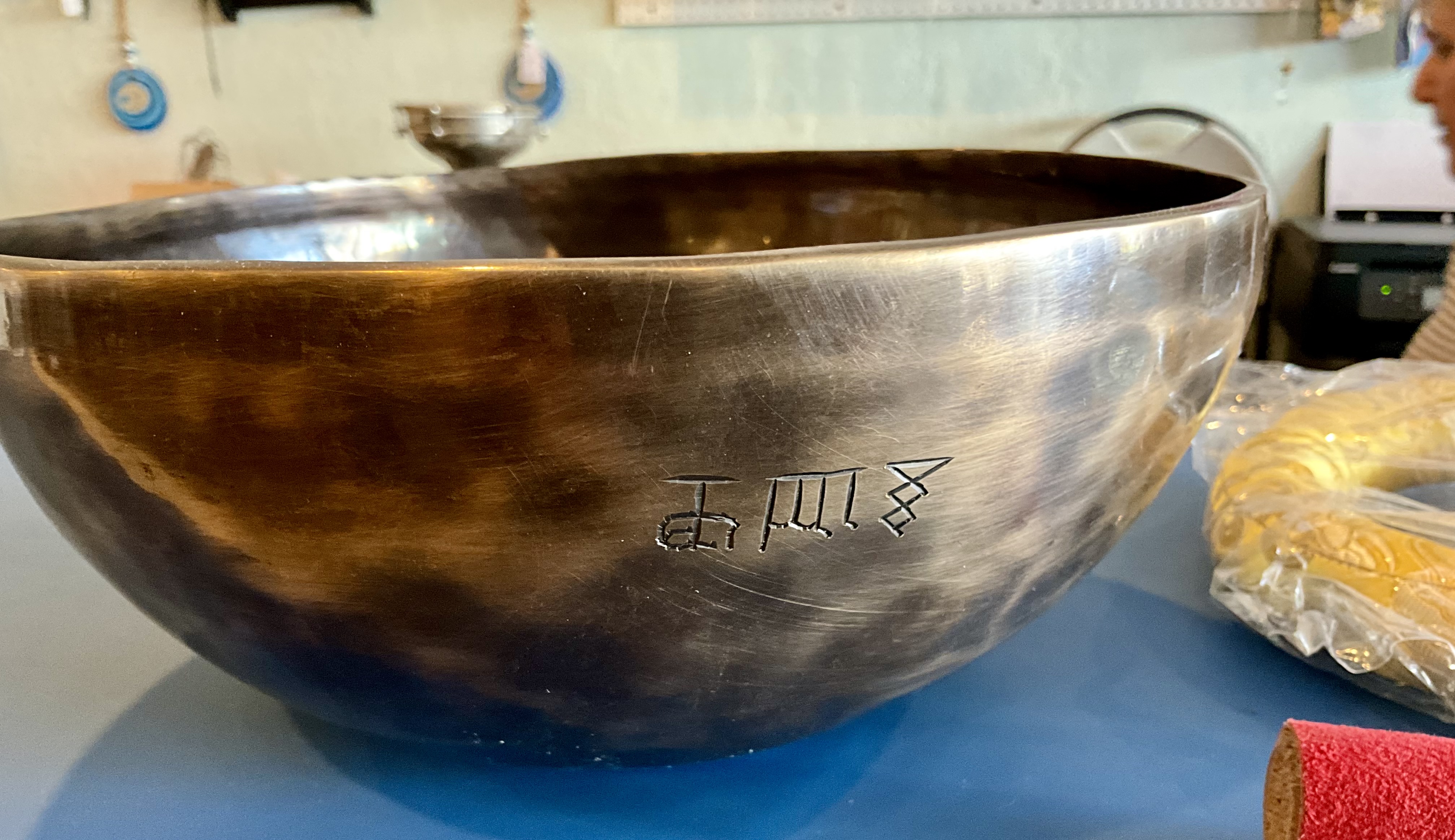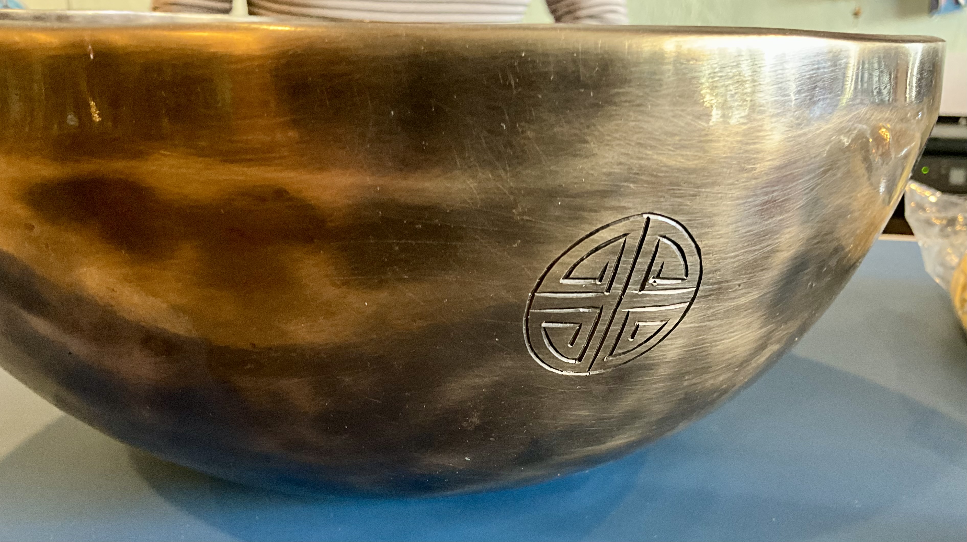 Master Healing Bowl 7.25 inches Tiger Eye Full Moon Singing Bowl-Tibetan Singing bowl From Nepal-Holistic Bowls- Harmonize Resonate SoundSinging bowls, also known as Himalayan bowls , are used in yoga, music therapy, sound healing, and religious ceremonies. In the Buddhist tradition, they are played to signal the beginning and the end of silent meditation cycles. Tibetan bowls emit very pure tones, close to sine waves. Their sound is a synonym of purity for our ears. Like a bell, the tone is produced by striking the side of the bowl with a wooden mallet. By running the mallet around the bowl – only with slight pressure – a pure tone will eventually rise. When this happens, the bowl is said to sing – hence its name. This is a 7 metal handmade Bronze sing bowl made by the process of hand Hammering. This singing bowl can be used for Meditation, sound therapy, Healing therapy, and chakra awakening. HANDMADE SINGING BOWLS Making a handmade bronze singing bowl is a time-honored tradition that involves several stages. The process starts with the creation of a metal alloy, which is typically made of copper and tin. The metal is then melted down and poured into a mold, where it is shaped into a bowl. Once the bowl has been formed, it is subjected to a series of hammering and shaping processes to refine its shape and thickness. This is where the expertise of the craftsman comes into play, as they use their skills to produce a bowl with a balanced tone and resonant sound.The finished bowl is then polished to a high shine and may be adorned with intricate designs and symbols that are significant in Buddhist or Hindu tradition. The use of handmade bronze singing bowls in healing, meditation, and chakra balancing is based on the idea that sound can have a profound impact on the body and mind. When played, the bowls produce a rich, harmonious sound that is said to stimulate the chakras and bring balance to the body’s energy centers. The sounds produced by the singing bowl are believed to help calm the mind, reduce stress, and promote relaxation, making them a valuable tool in meditation and mindfulness practices. In addition, the vibrations produced by the singing bowl are said to have therapeutic benefits, promoting physical and emotional healing by reducing tension, improving circulation, and promoting relaxation. Overall, the use of handmade bronze singing bowls can be an effective and enjoyable way to enhance spiritual and emotional well-being. HOW TO PLAY TIBETAN SINGING BOWLS 1. Hold the singing bowl on the palm of the left hand. For smaller bowls, seven inches and under, hold on your fingertips.2. Grasp the mallet about mid-length, with all the fingertips pointing downwards and touching the wood. (If you are using one of our padded mallets, the red wool should be on top.) Palm downward.3. Gently tap the mallet against the side of the bowl to “warm-up” the bell.4. With an even pressure, rub the mallet clockwise around the outside edge of the rim of the bowl. Use a full arm movement, just like stirring a big kettle of soup, and keep the mallet straight up and down! Again, it’s not a wrist movement, but a full-arm movement. Remember to apply pressure– the friction of the mallet against theouter rim produces vibrations which result in sound. Experiment with your speed. Usually people go too fast! Let the sound build up slowly as the singing bowl picks up the vibration $249 **tax and fees added in final price below domestic shipping available add additional $45