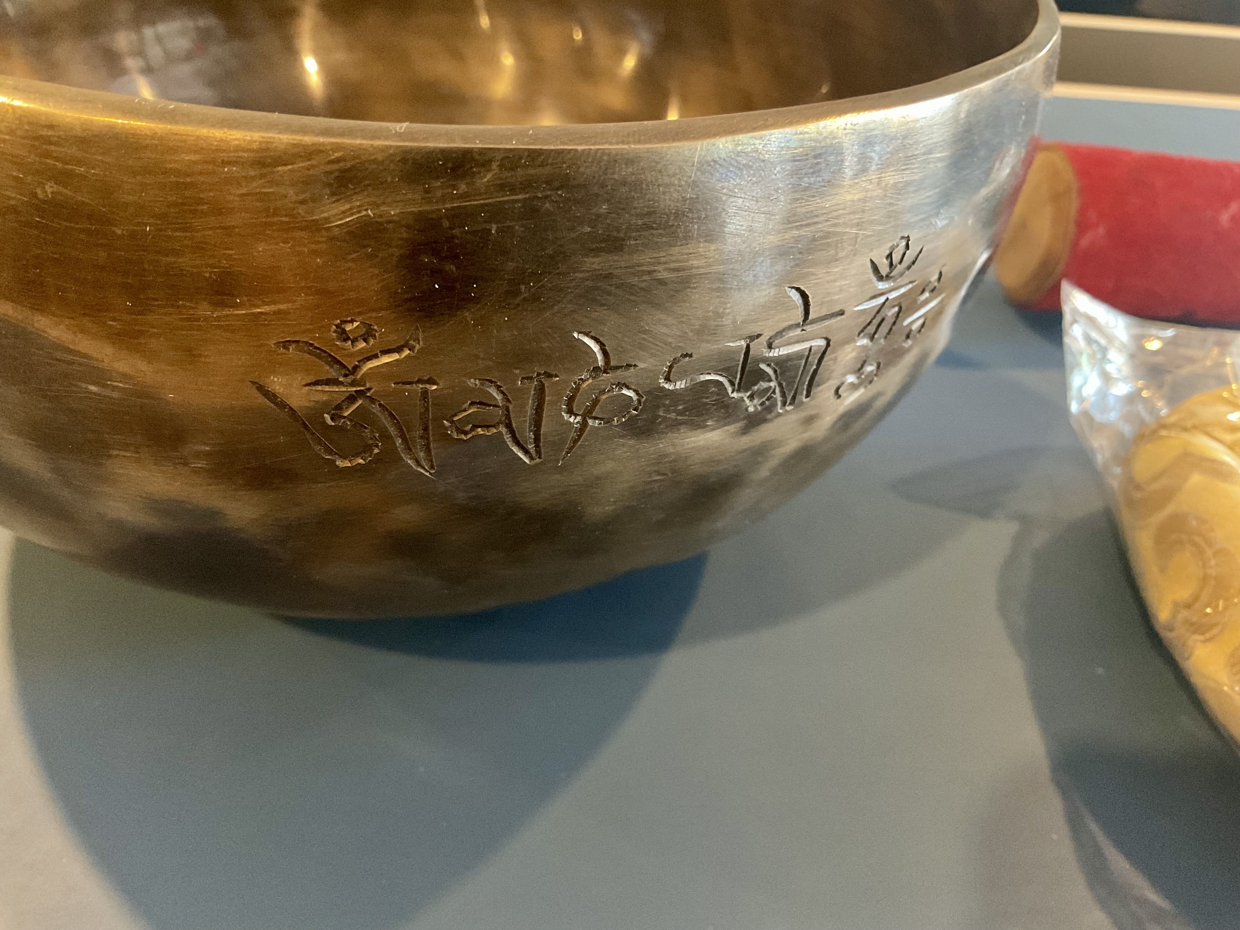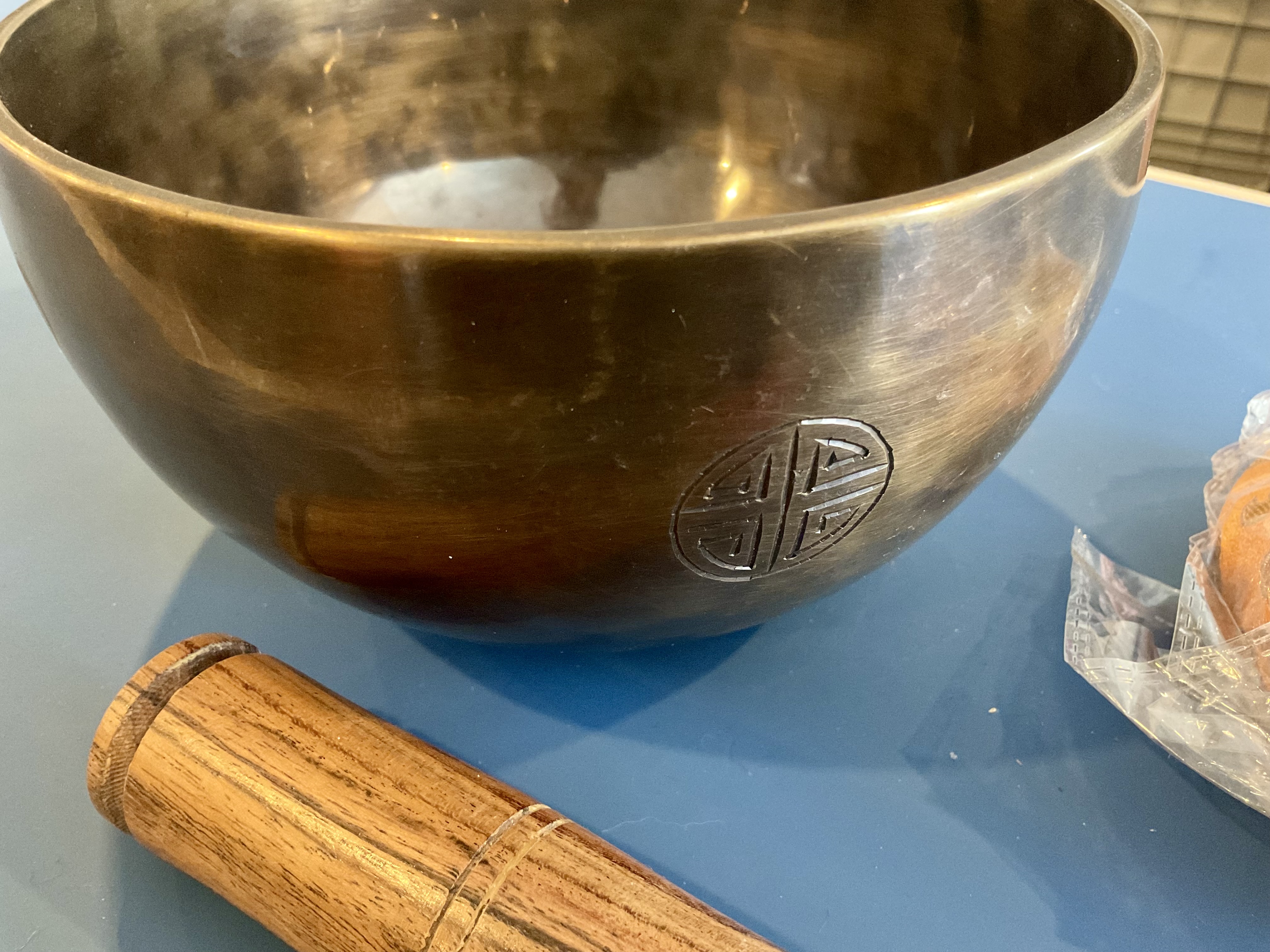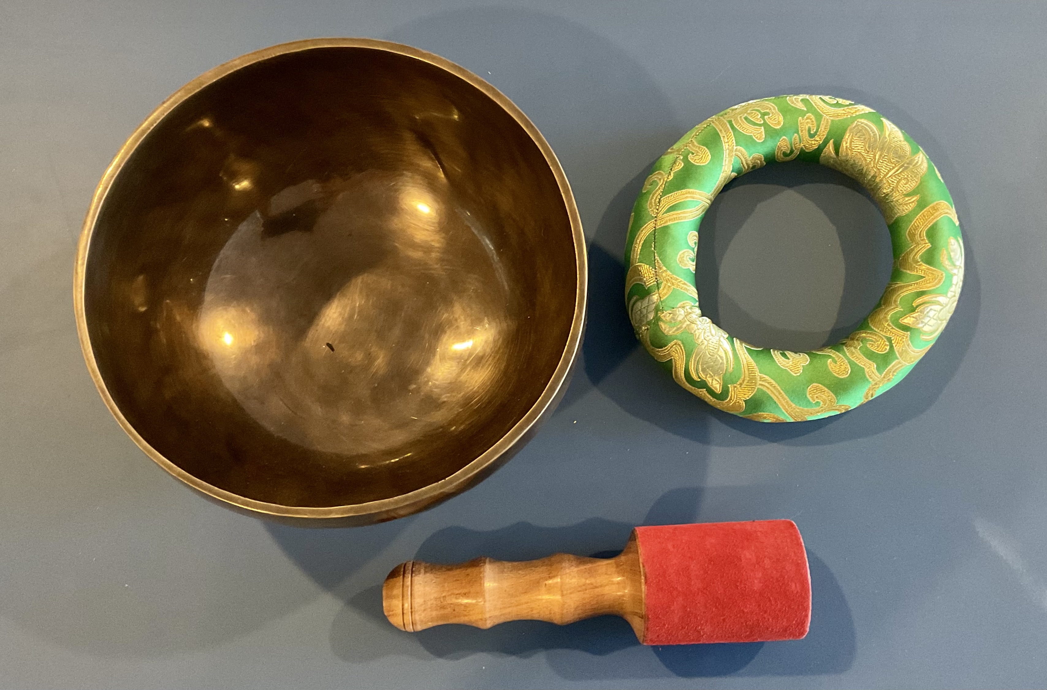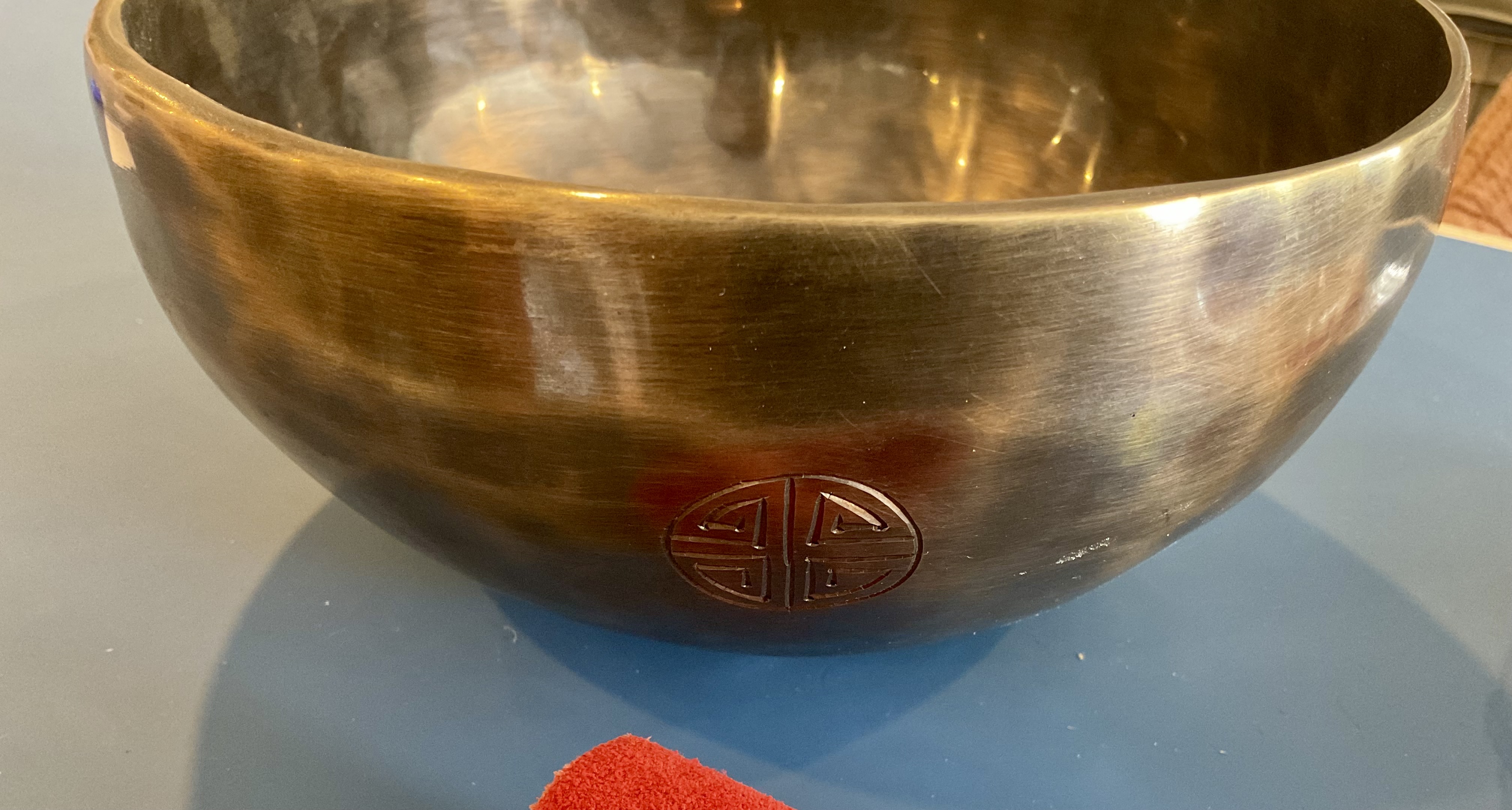 Master Healing Bowl 7.25 inches Tiger Eye Full Moon Singing Bowl-Tibetan Singing bowl From Nepal-Holistic Bowls- Harmonize Resonate SoundSinging bowls, also known as Himalayan bowls , are used in yoga, music therapy, sound healing, and religious ceremonies. In the Buddhist tradition, they are played to signal the beginning and the end of silent meditation cycles. Tibetan bowls emit very pure tones, close to sine waves. Their sound is a synonym of purity for our ears. Like a bell, the tone is produced by striking the side of the bowl with a wooden mallet. By running the mallet around the bowl – only with slight pressure – a pure tone will eventually rise. When this happens, the bowl is said to sing – hence its name. This is a 7 metal handmade Bronze sing bowl made by the process of hand Hammering. This singing bowl can be used for Meditation, sound therapy, Healing therapy, and chakra awakening. HANDMADE SINGING BOWLS Making a handmade bronze singing bowl is a time-honored tradition that involves several stages. The process starts with the creation of a metal alloy, which is typically made of copper and tin. The metal is then melted down and poured into a mold, where it is shaped into a bowl. Once the bowl has been formed, it is subjected to a series of hammering and shaping processes to refine its shape and thickness. This is where the expertise of the craftsman comes into play, as they use their skills to produce a bowl with a balanced tone and resonant sound.The finished bowl is then polished to a high shine and may be adorned with intricate designs and symbols that are significant in Buddhist or Hindu tradition. The use of handmade bronze singing bowls in healing, meditation, and chakra balancing is based on the idea that sound can have a profound impact on the body and mind. When played, the bowls produce a rich, harmonious sound that is said to stimulate the chakras and bring balance to the body’s energy centers. The sounds produced by the singing bowl are believed to help calm the mind, reduce stress, and promote relaxation, making them a valuable tool in meditation and mindfulness practices. In addition, the vibrations produced by the singing bowl are said to have therapeutic benefits, promoting physical and emotional healing by reducing tension, improving circulation, and promoting relaxation. Overall, the use of handmade bronze singing bowls can be an effective and enjoyable way to enhance spiritual and emotional well-being. HOW TO PLAY TIBETAN SINGING BOWLS 1. Hold the singing bowl on the palm of the left hand. For smaller bowls, seven inches and under, hold on your fingertips.2. Grasp the mallet about mid-length, with all the fingertips pointing downwards and touching the wood. (If you are using one of our padded mallets, the red wool should be on top.) Palm downward.3. Gently tap the mallet against the side of the bowl to “warm-up” the bell.4. With an even pressure, rub the mallet clockwise around the outside edge of the rim of the bowl. Use a full arm movement, just like stirring a big kettle of soup, and keep the mallet straight up and down! Again, it’s not a wrist movement, but a full-arm movement. Remember to apply pressure– the friction of the mallet against theouter rim produces vibrations which result in sound. Experiment with your speed. Usually people go too fast! Let the sound build up slowly as the singing bowl picks up the vibration $249 **tax and fees added in final price below domestic shipping available add additional $45