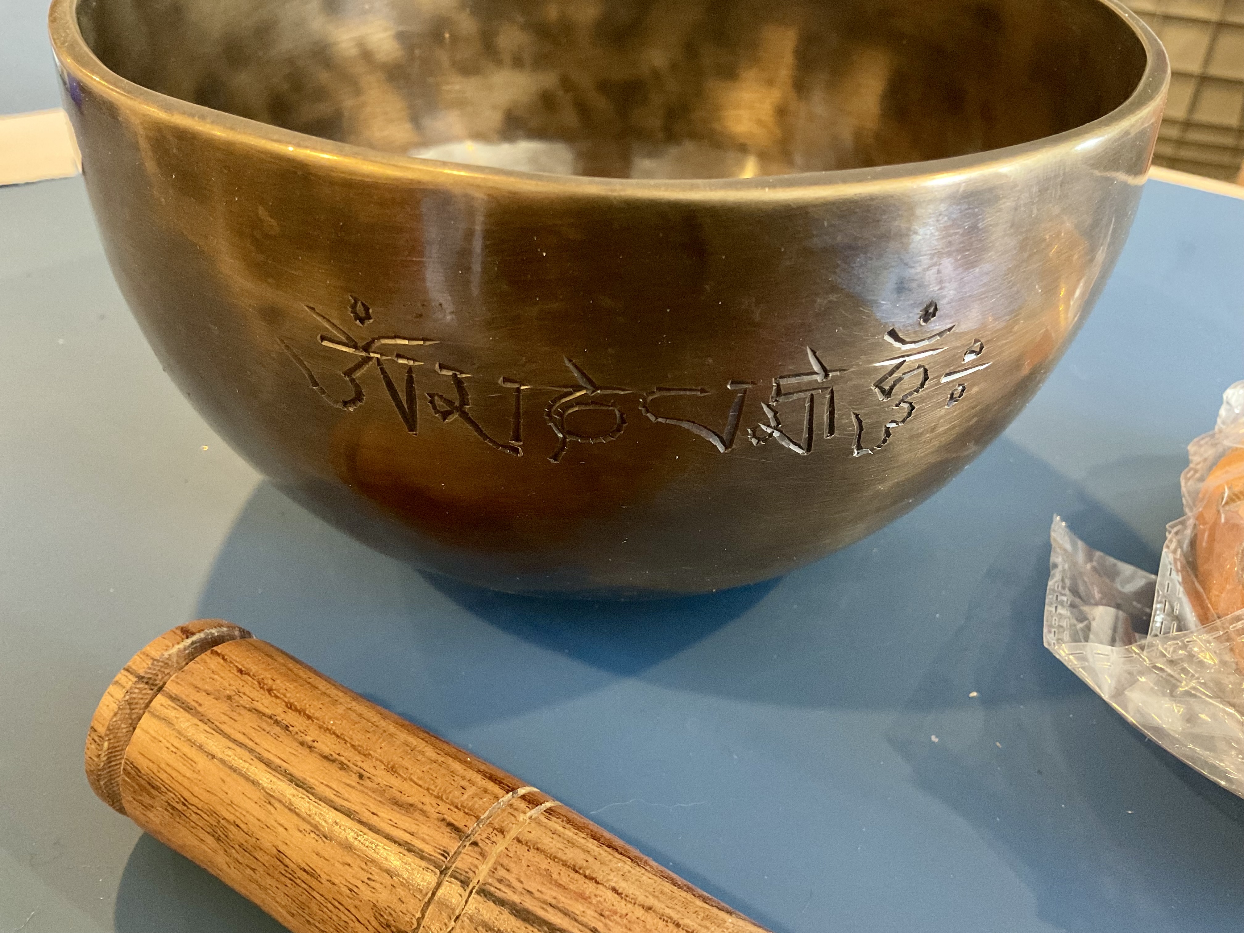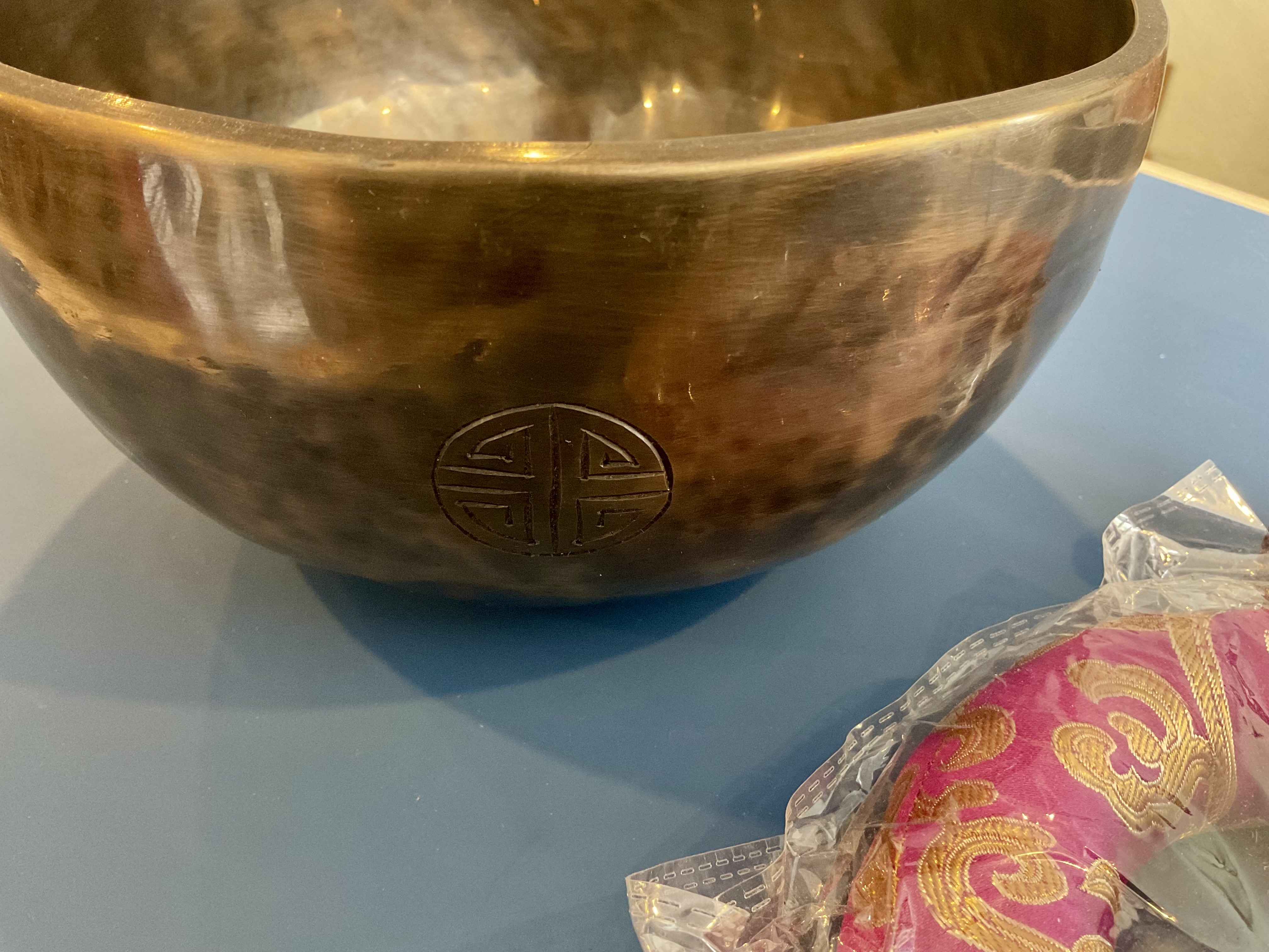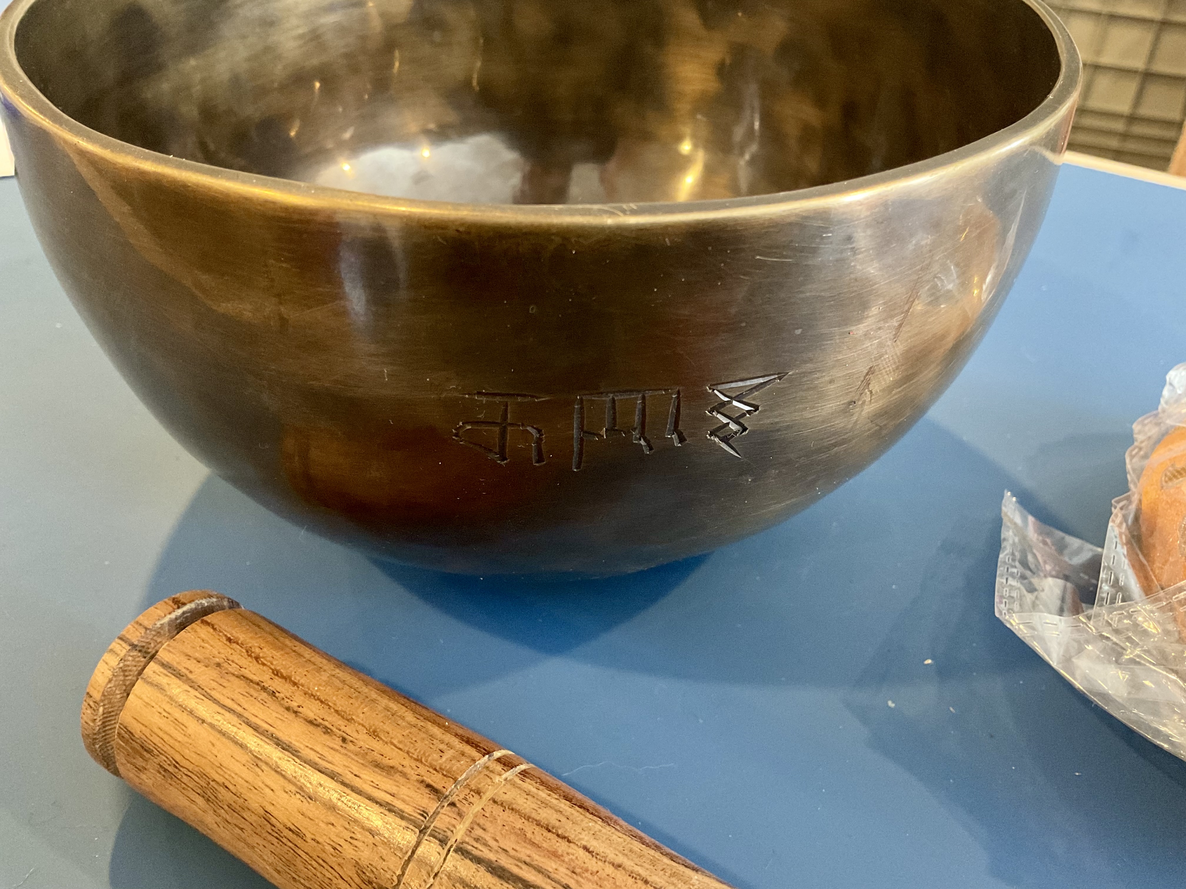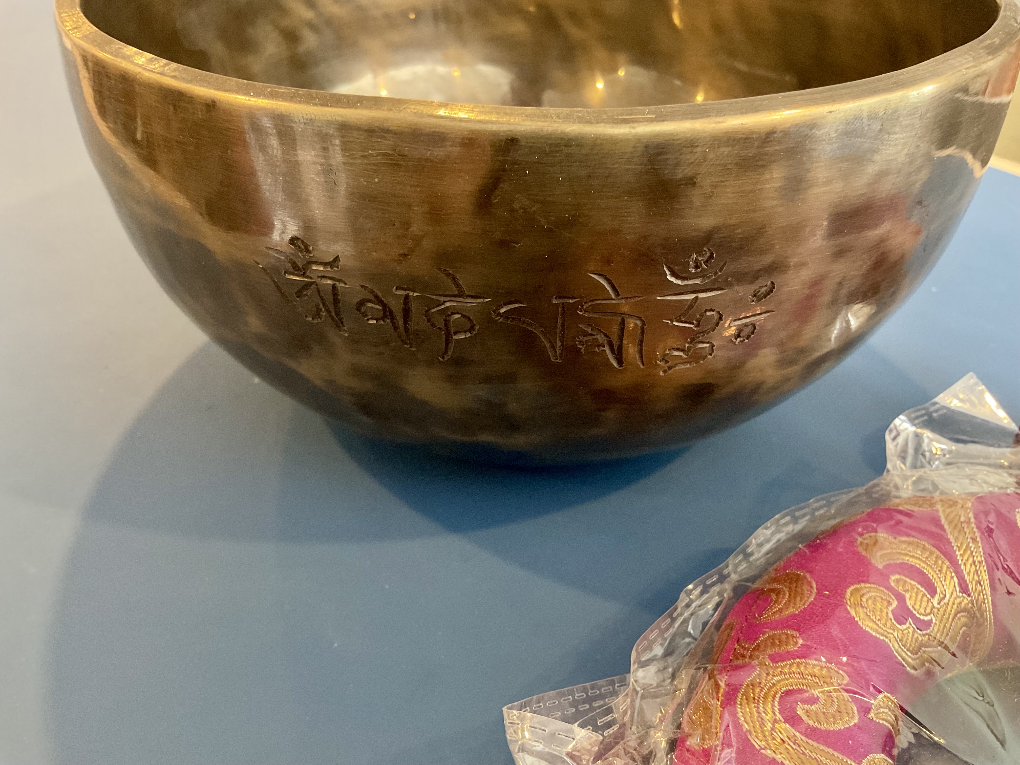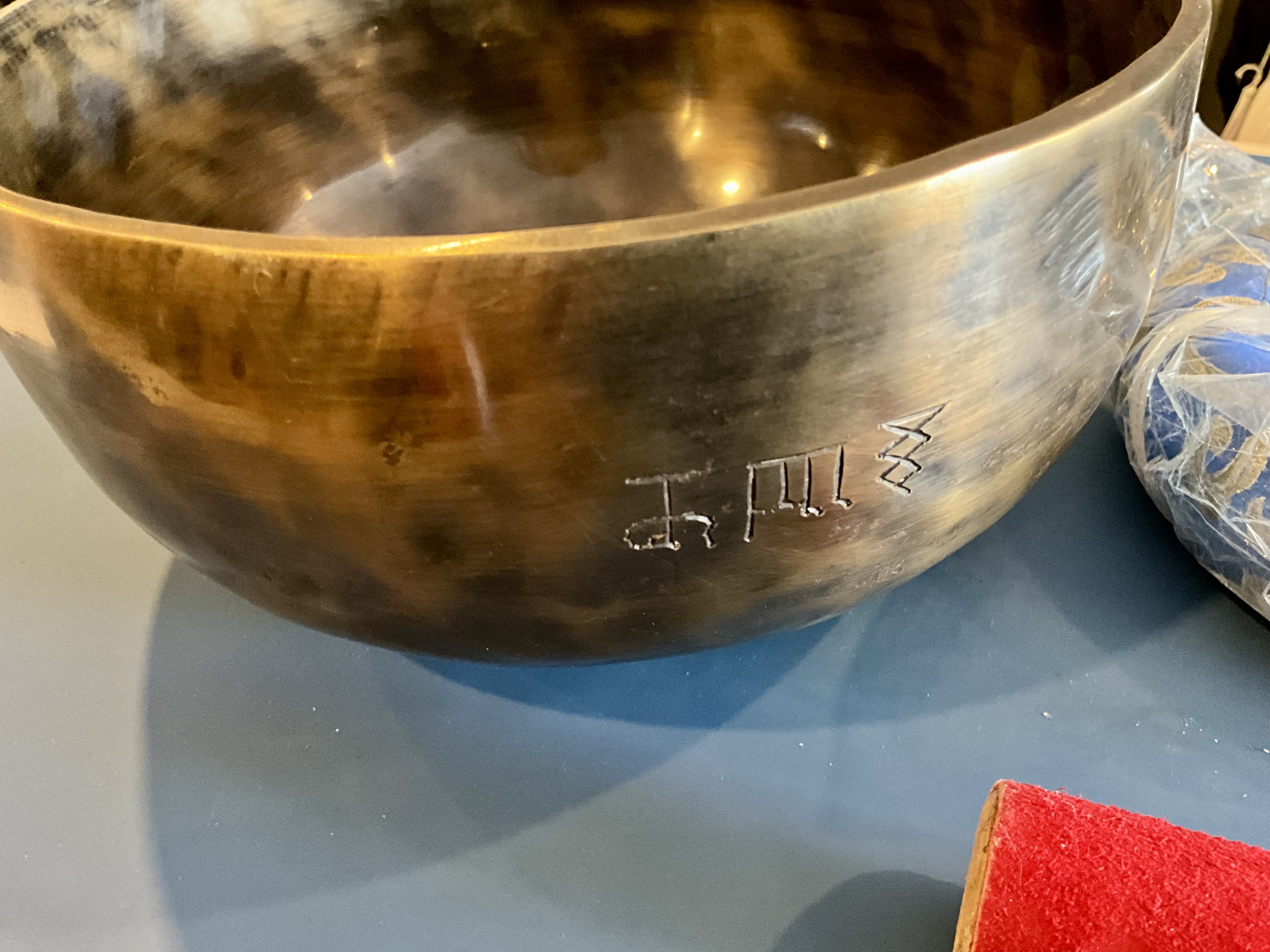 Master Healing Bowl 7.25 inches Tiger Eye Full Moon Singing Bowl-Tibetan Singing bowl From Nepal-Holistic Bowls- Harmonize Resonate SoundSinging bowls, also known as Himalayan bowls , are used in yoga, music therapy, sound healing, and religious ceremonies. In the Buddhist tradition, they are played to signal the beginning and the end of silent meditation cycles. Tibetan bowls emit very pure tones, close to sine waves. Their sound is a synonym of purity for our ears. Like a bell, the tone is produced by striking the side of the bowl with a wooden mallet. By running the mallet around the bowl – only with slight pressure – a pure tone will eventually rise. When this happens, the bowl is said to sing – hence its name. This is a 7 metal handmade Bronze sing bowl made by the process of hand Hammering. This singing bowl can be used for Meditation, sound therapy, Healing therapy, and chakra awakening. HANDMADE SINGING BOWLS Making a handmade bronze singing bowl is a time-honored tradition that involves several stages. The process starts with the creation of a metal alloy, which is typically made of copper and tin. The metal is then melted down and poured into a mold, where it is shaped into a bowl. Once the bowl has been formed, it is subjected to a series of hammering and shaping processes to refine its shape and thickness. This is where the expertise of the craftsman comes into play, as they use their skills to produce a bowl with a balanced tone and resonant sound.The finished bowl is then polished to a high shine and may be adorned with intricate designs and symbols that are significant in Buddhist or Hindu tradition. The use of handmade bronze singing bowls in healing, meditation, and chakra balancing is based on the idea that sound can have a profound impact on the body and mind. When played, the bowls produce a rich, harmonious sound that is said to stimulate the chakras and bring balance to the body’s energy centers. The sounds produced by the singing bowl are believed to help calm the mind, reduce stress, and promote relaxation, making them a valuable tool in meditation and mindfulness practices. In addition, the vibrations produced by the singing bowl are said to have therapeutic benefits, promoting physical and emotional healing by reducing tension, improving circulation, and promoting relaxation. Overall, the use of handmade bronze singing bowls can be an effective and enjoyable way to enhance spiritual and emotional well-being. HOW TO PLAY TIBETAN SINGING BOWLS 1. Hold the singing bowl on the palm of the left hand. For smaller bowls, seven inches and under, hold on your fingertips.2. Grasp the mallet about mid-length, with all the fingertips pointing downwards and touching the wood. (If you are using one of our padded mallets, the red wool should be on top.) Palm downward.3. Gently tap the mallet against the side of the bowl to “warm-up” the bell.4. With an even pressure, rub the mallet clockwise around the outside edge of the rim of the bowl. Use a full arm movement, just like stirring a big kettle of soup, and keep the mallet straight up and down! Again, it’s not a wrist movement, but a full-arm movement. Remember to apply pressure– the friction of the mallet against theouter rim produces vibrations which result in sound. Experiment with your speed. Usually people go too fast! Let the sound build up slowly as the singing bowl picks up the vibration $249 **tax and fees added in final price below domestic shipping available add additional $45