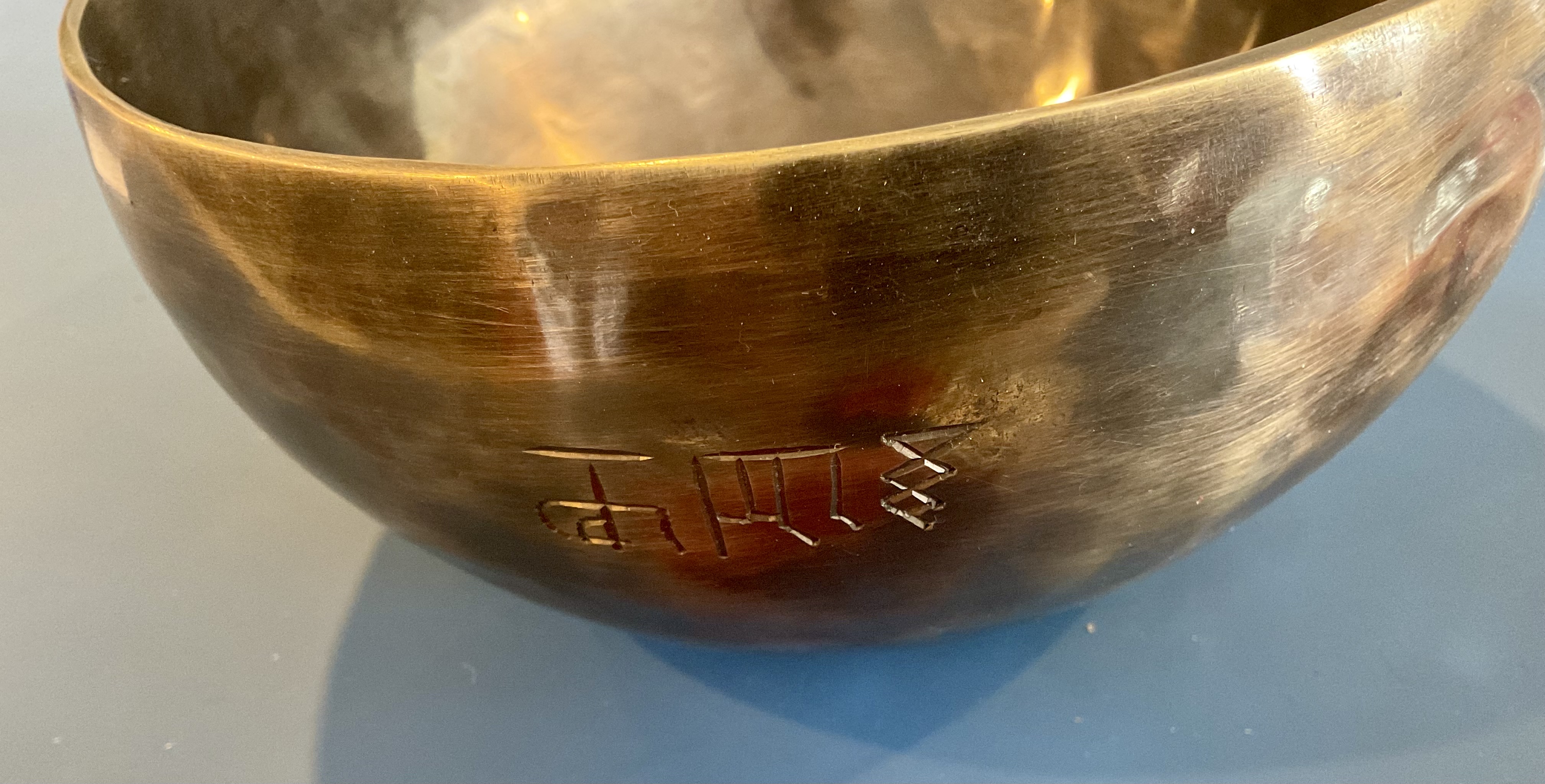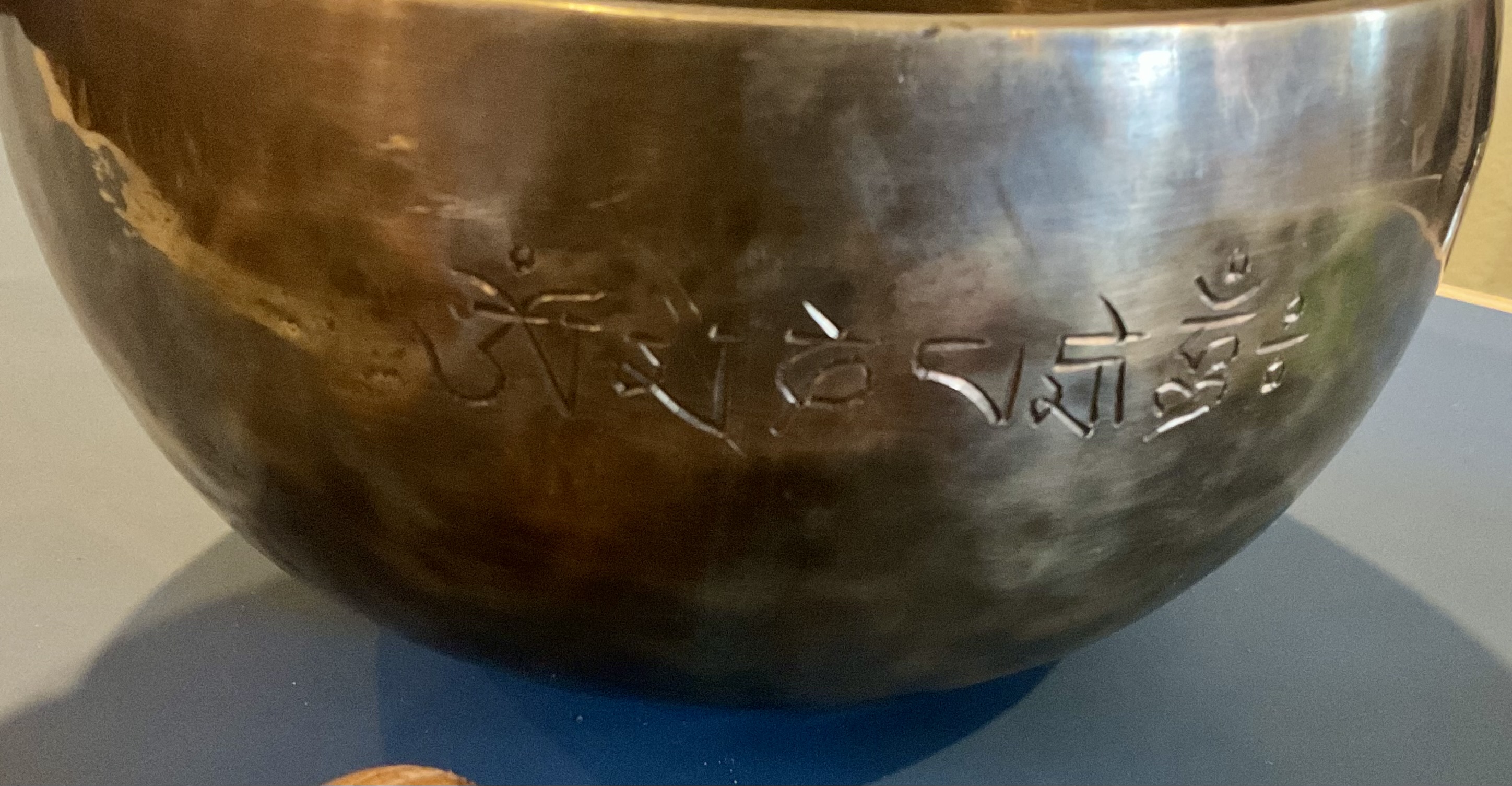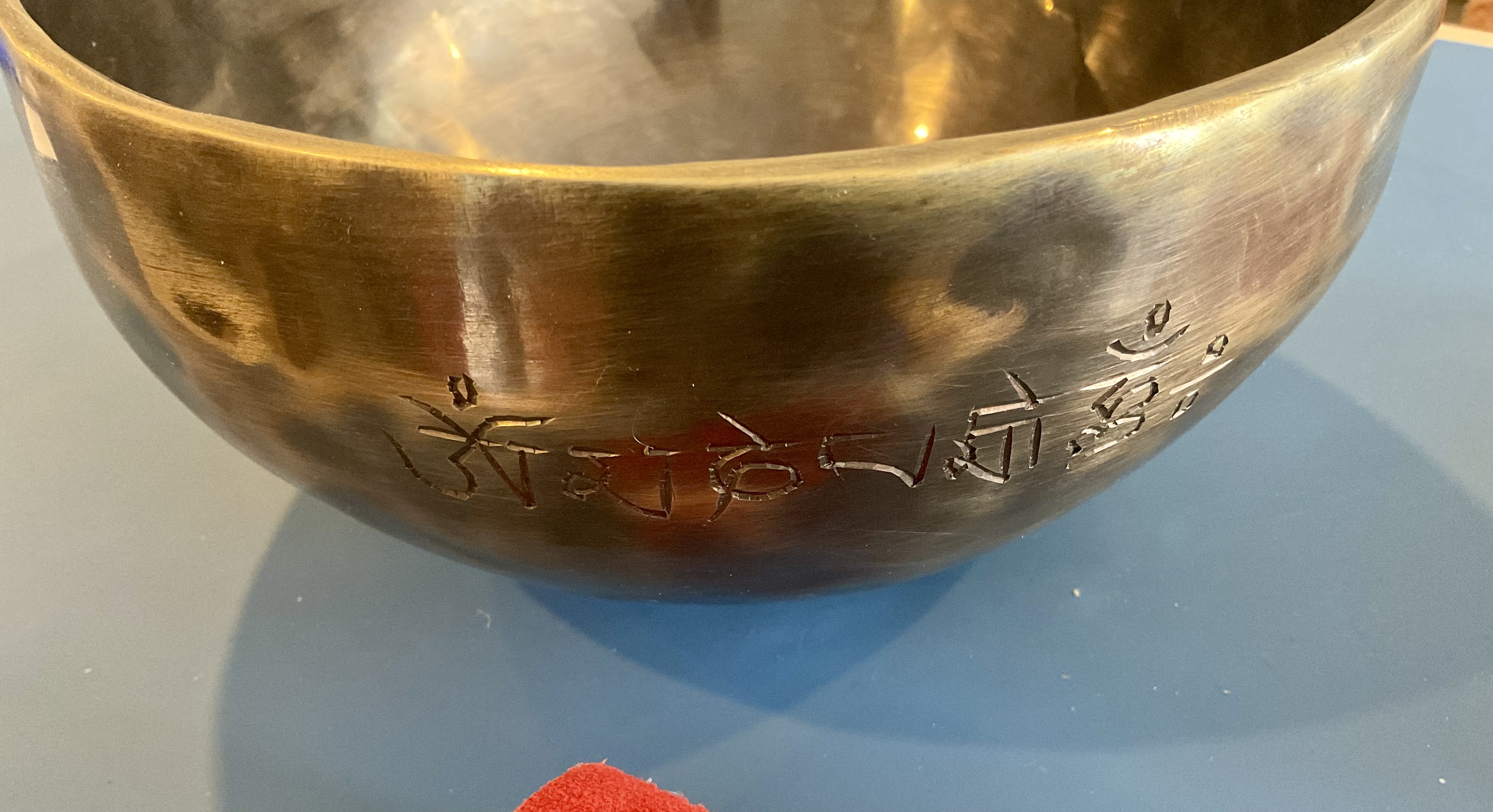 7″ Hammered Bronze Etched Tibetan Tiger’s Eye Full Moon Singing Bowl w/ Striker Key of D Master Healing Bowl 6 inches Tiger Eye Full Moon Singing Bowl-Tibetan Singing bowl From Nepal-Holistic Bowls- Harmonize Resonate SoundSinging bowls, also known as Himalayan bowls , are used in yoga, music therapy, sound healing, and religious ceremonies. In the Buddhist tradition, they are played to signal the beginning and the end of silent meditation cycles. Tibetan bowls emit very pure tones, close to sine waves. Their sound is a synonym of purity for our ears. Like a bell, the tone is produced by striking the side of the bowl with a wooden mallet. By running the mallet around the bowl – only with slight pressure – a pure tone will eventually rise. When this happens, the bowl is said to sing – hence its name. This is a 7 metal handmade Bronze sing bowl made by the process of hand Hammering. This singing bowl can be used for Meditation, sound therapy, Healing therapy, and chakra awakening. HANDMADE SINGING BOWLS Making a handmade bronze singing bowl is a time-honored tradition that involves several stages. The process starts with the creation of a metal alloy, which is typically made of copper and tin. The metal is then melted down and poured into a mold, where it is shaped into a bowl. Once the bowl has been formed, it is subjected to a series of hammering and shaping processes to refine its shape and thickness. This is where the expertise of the craftsman comes into play, as they use their skills to produce a bowl with a balanced tone and resonant sound.The finished bowl is then polished to a high shine and may be adorned with intricate designs and symbols that are significant in Buddhist or Hindu tradition. The use of handmade bronze singing bowls in healing, meditation, and chakra balancing is based on the idea that sound can have a profound impact on the body and mind. When played, the bowls produce a rich, harmonious sound that is said to stimulate the chakras and bring balance to the body’s energy centers. The sounds produced by the singing bowl are believed to help calm the mind, reduce stress, and promote relaxation, making them a valuable tool in meditation and mindfulness practices. In addition, the vibrations produced by the singing bowl are said to have therapeutic benefits, promoting physical and emotional healing by reducing tension, improving circulation, and promoting relaxation. Overall, the use of handmade bronze singing bowls can be an effective and enjoyable way to enhance spiritual and emotional well-being. HOW TO PLAY TIBETAN SINGING BOWLS 1. Hold the singing bowl on the palm of the left hand. For smaller bowls, seven inches and under, hold on your fingertips.2. Grasp the mallet about mid-length, with all the fingertips pointing downwards and touching the wood. (If you are using one of our padded mallets, the red wool should be on top.) Palm downward.3. Gently tap the mallet against the side of the bowl to “warm-up” the bell.4. With an even pressure, rub the mallet clockwise around the outside edge of the rim of the bowl. Use a full arm movement, just like stirring a big kettle of soup, and keep the mallet straight up and down! Again, it’s not a wrist movement, but a full-arm movement. Remember to apply pressure– the friction of the mallet against theouter rim produces vibrations which result in sound. Experiment with your speed. Usually people go too fast! Let the sound build up slowly as the singing bowl picks up the vibration $249 **tax and fees added in final price below domestic shipping available add additional $40