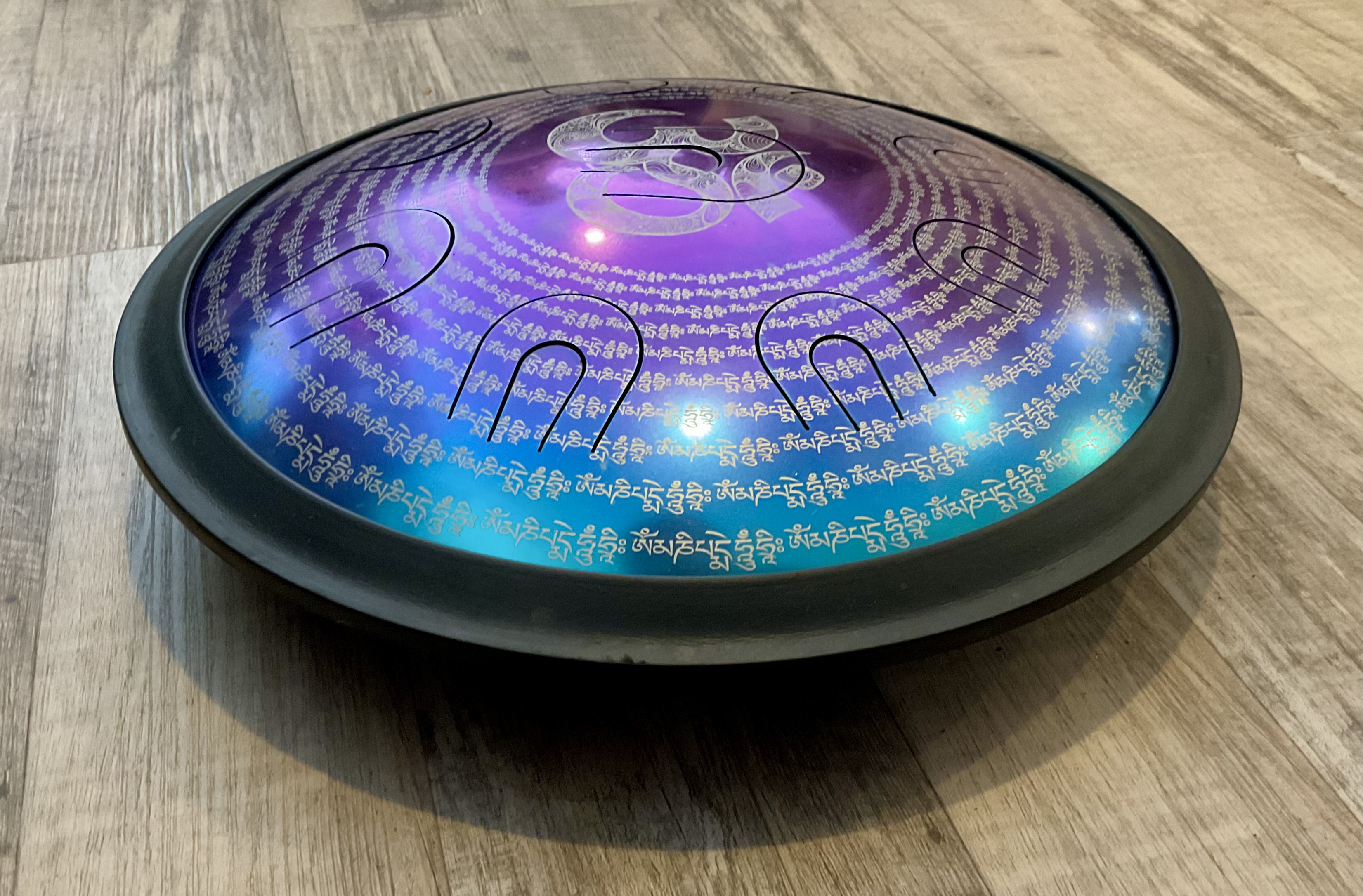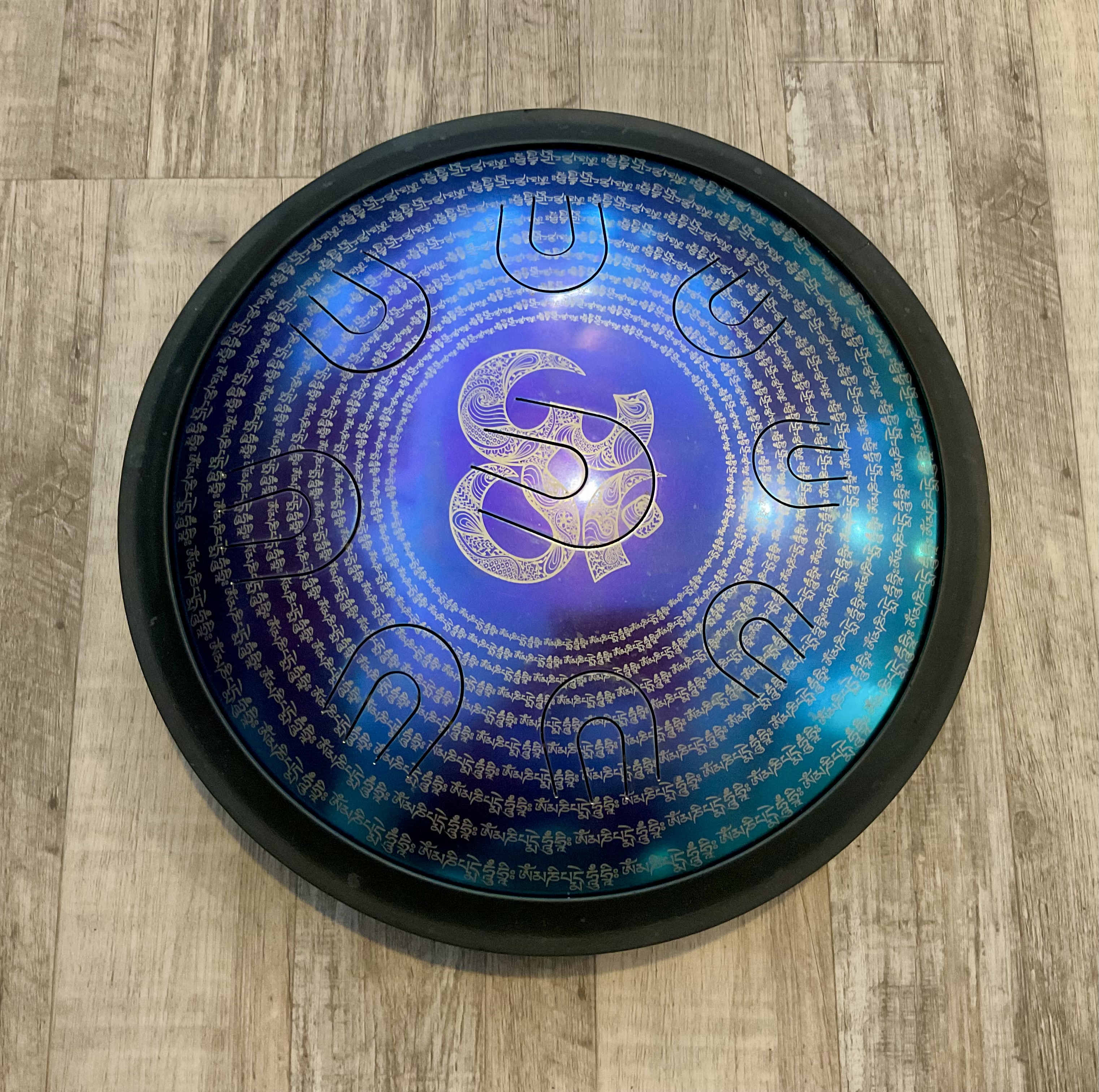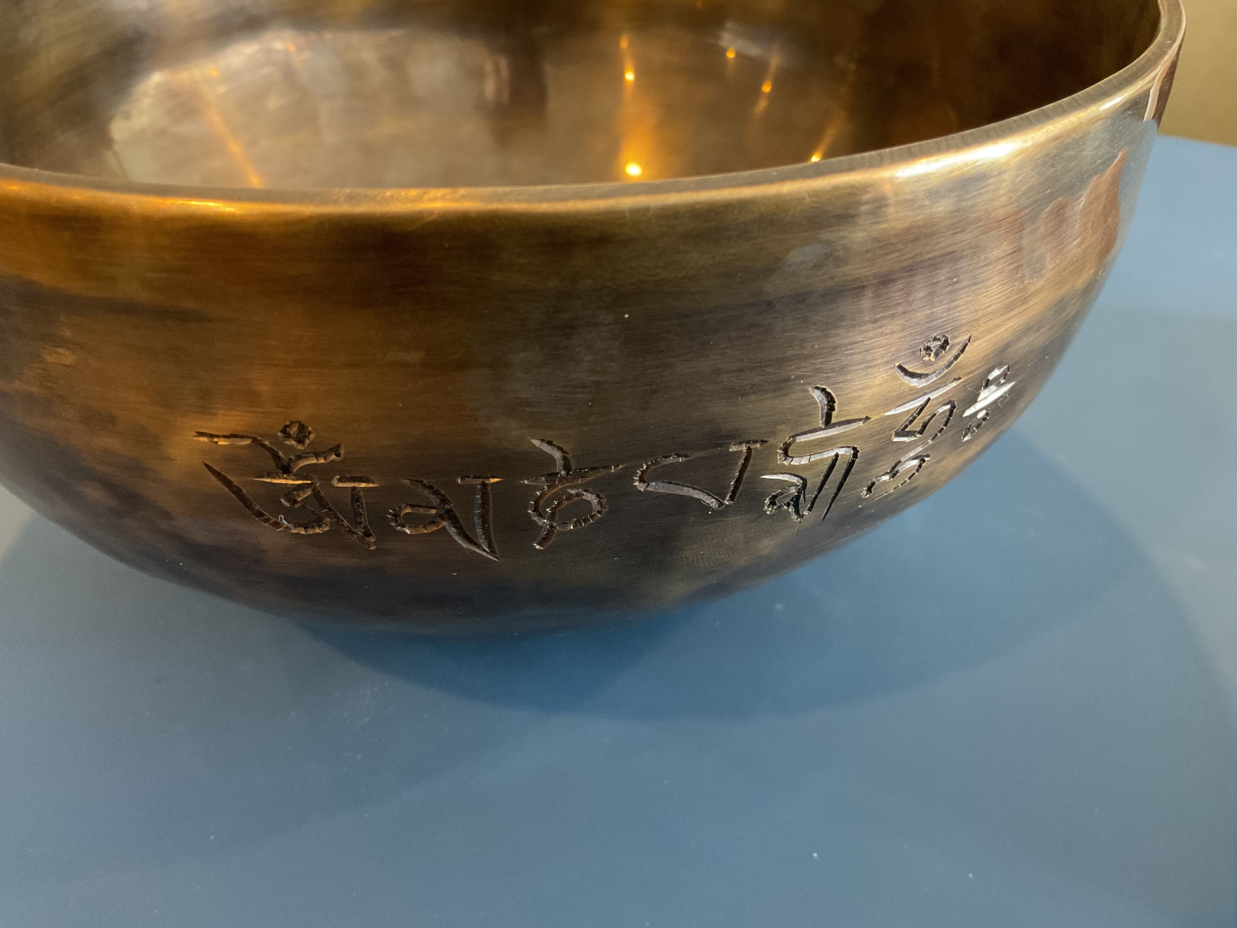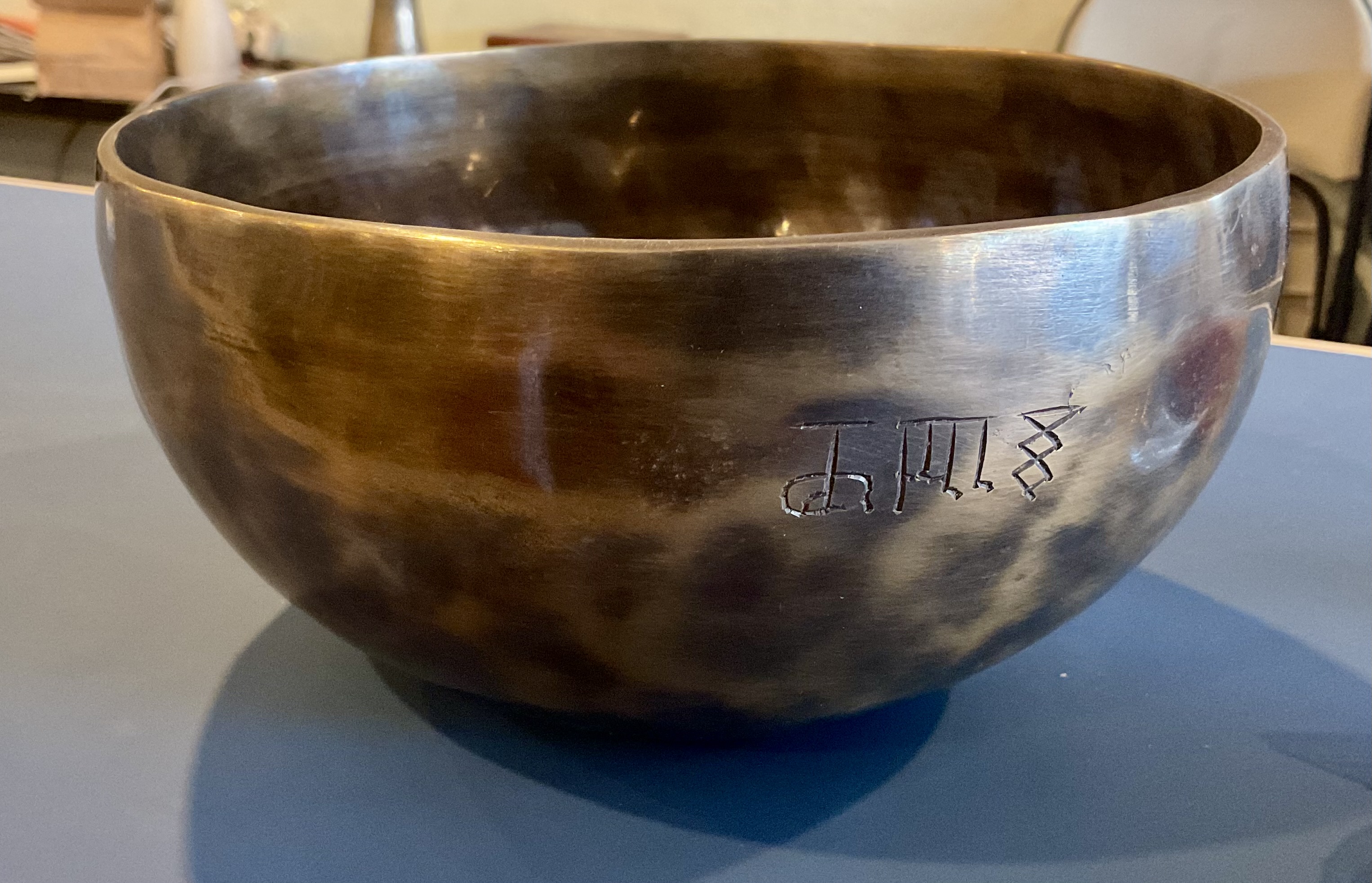 7″ Hammered Bronze Etched Tibetan Tiger’s Eye Full Moon Singing Bowl w/ Striker Key of D Master Healing Bowl 6 inches Tiger Eye Full Moon Singing Bowl-Tibetan Singing bowl From Nepal-Holistic Bowls- Harmonize Resonate SoundSinging bowls, also known as Himalayan bowls , are used in yoga, music therapy, sound healing, and religious ceremonies. In the Buddhist tradition, they are played to signal the beginning and the end of silent meditation cycles. Tibetan bowls emit very pure tones, close to sine waves. Their sound is a synonym of purity for our ears. Like a bell, the tone is produced by striking the side of the bowl with a wooden mallet. By running the mallet around the bowl – only with slight pressure – a pure tone will eventually rise. When this happens, the bowl is said to sing – hence its name. This is a 7 metal handmade Bronze sing bowl made by the process of hand Hammering. This singing bowl can be used for Meditation, sound therapy, Healing therapy, and chakra awakening. HANDMADE SINGING BOWLS Making a handmade bronze singing bowl is a time-honored tradition that involves several stages. The process starts with the creation of a metal alloy, which is typically made of copper and tin. The metal is then melted down and poured into a mold, where it is shaped into a bowl. Once the bowl has been formed, it is subjected to a series of hammering and shaping processes to refine its shape and thickness. This is where the expertise of the craftsman comes into play, as they use their skills to produce a bowl with a balanced tone and resonant sound.The finished bowl is then polished to a high shine and may be adorned with intricate designs and symbols that are significant in Buddhist or Hindu tradition. The use of handmade bronze singing bowls in healing, meditation, and chakra balancing is based on the idea that sound can have a profound impact on the body and mind. When played, the bowls produce a rich, harmonious sound that is said to stimulate the chakras and bring balance to the body’s energy centers. The sounds produced by the singing bowl are believed to help calm the mind, reduce stress, and promote relaxation, making them a valuable tool in meditation and mindfulness practices. In addition, the vibrations produced by the singing bowl are said to have therapeutic benefits, promoting physical and emotional healing by reducing tension, improving circulation, and promoting relaxation. Overall, the use of handmade bronze singing bowls can be an effective and enjoyable way to enhance spiritual and emotional well-being. HOW TO PLAY TIBETAN SINGING BOWLS 1. Hold the singing bowl on the palm of the left hand. For smaller bowls, seven inches and under, hold on your fingertips.2. Grasp the mallet about mid-length, with all the fingertips pointing downwards and touching the wood. (If you are using one of our padded mallets, the red wool should be on top.) Palm downward.3. Gently tap the mallet against the side of the bowl to “warm-up” the bell.4. With an even pressure, rub the mallet clockwise around the outside edge of the rim of the bowl. Use a full arm movement, just like stirring a big kettle of soup, and keep the mallet straight up and down! Again, it’s not a wrist movement, but a full-arm movement. Remember to apply pressure– the friction of the mallet against theouter rim produces vibrations which result in sound. Experiment with your speed. Usually people go too fast! Let the sound build up slowly as the singing bowl picks up the vibration $249 **tax and fees added in final price below domestic shipping available add additional $40