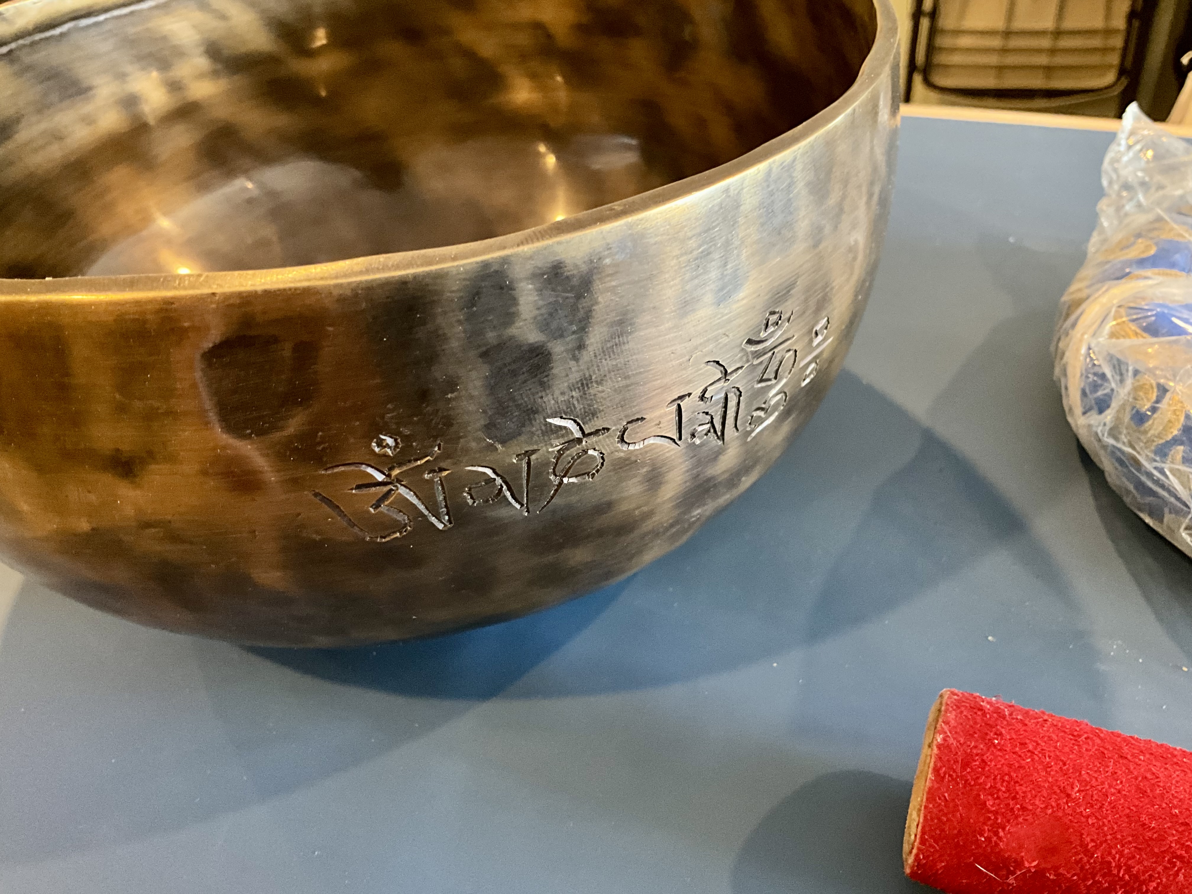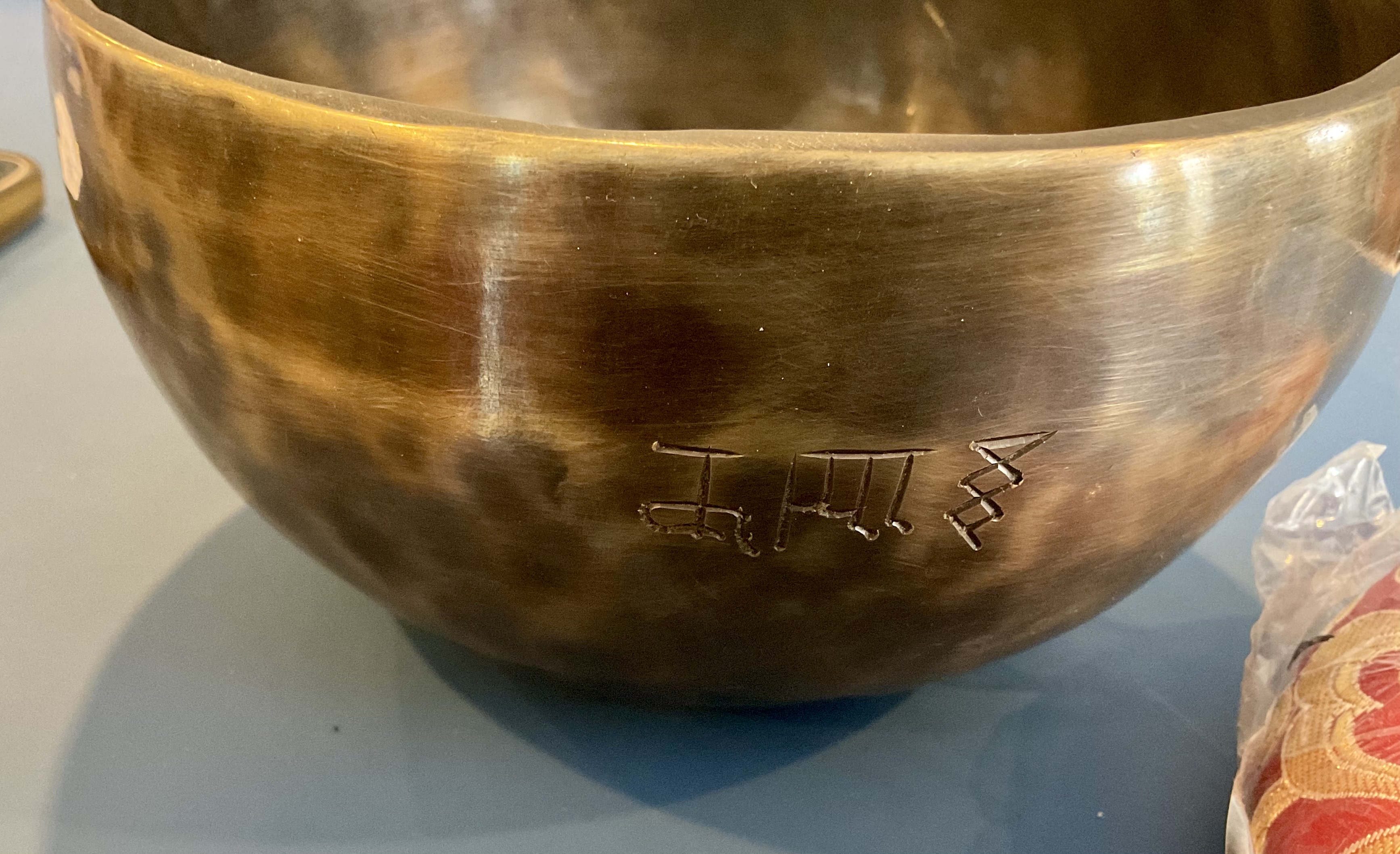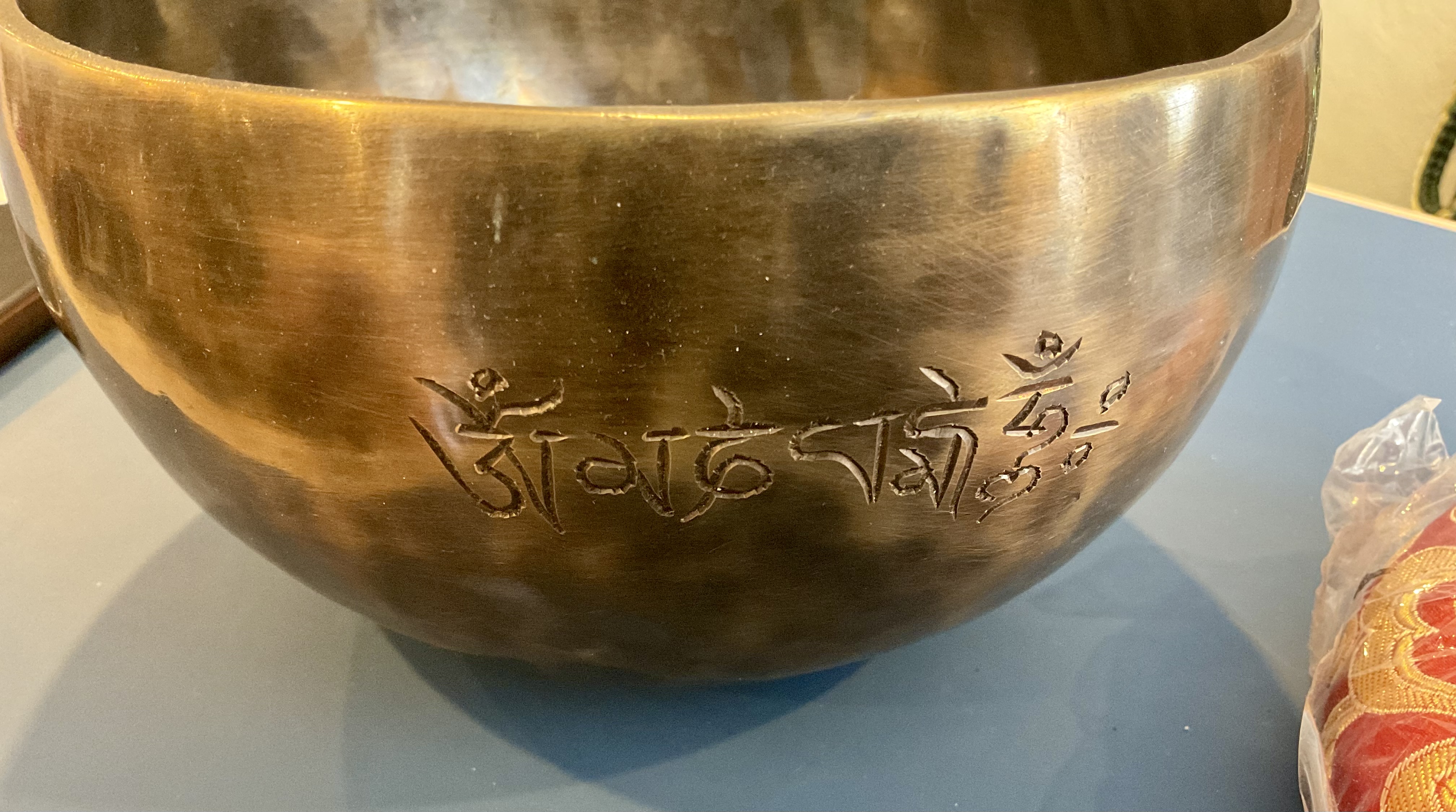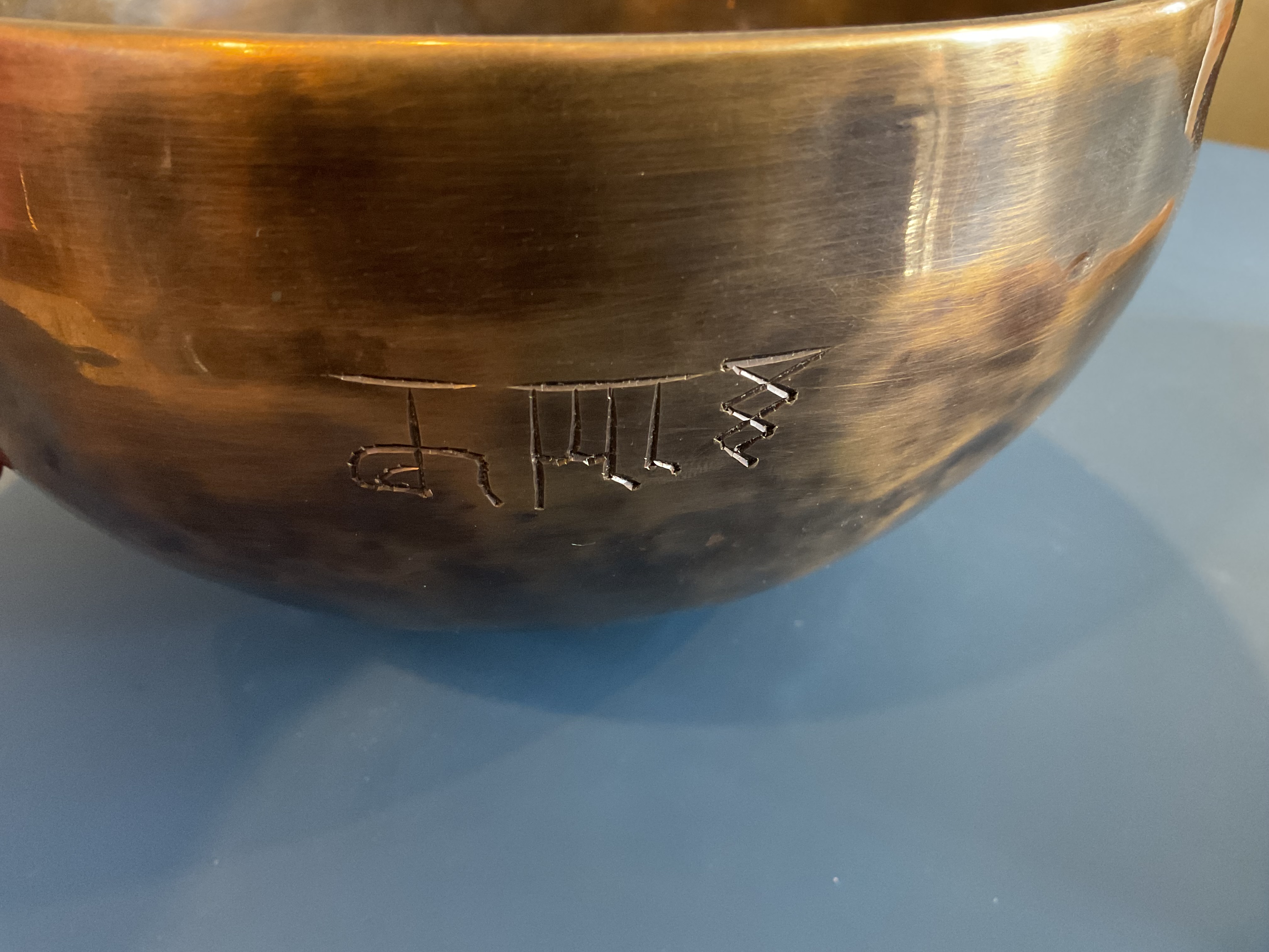 8″ Hammered Bronze Etched Tibetan Tiger’s Eye Full Moon Singing Bowl w/ Striker Master Healing Bowl 6 inches Tiger Eye Full Moon Singing Bowl-Tibetan Singing bowl From Nepal-Holistic Bowls- Harmonize Resonate SoundSinging bowls, also known as Himalayan bowls , are used in yoga, music therapy, sound healing, and religious ceremonies. In the Buddhist tradition, they are played to signal the beginning and the end of silent meditation cycles. Tibetan bowls emit very pure tones, close to sine waves. Their sound is a synonym of purity for our ears. Like a bell, the tone is produced by striking the side of the bowl with a wooden mallet. By running the mallet around the bowl – only with slight pressure – a pure tone will eventually rise. When this happens, the bowl is said to sing – hence its name. This is a 7 metal handmade Bronze sing bowl made by the process of hand Hammering. This singing bowl can be used for Meditation, sound therapy, Healing therapy, and chakra awakening. HANDMADE SINGING BOWLS Making a handmade bronze singing bowl is a time-honored tradition that involves several stages. The process starts with the creation of a metal alloy, which is typically made of copper and tin. The metal is then melted down and poured into a mold, where it is shaped into a bowl. Once the bowl has been formed, it is subjected to a series of hammering and shaping processes to refine its shape and thickness. This is where the expertise of the craftsman comes into play, as they use their skills to produce a bowl with a balanced tone and resonant sound.The finished bowl is then polished to a high shine and may be adorned with intricate designs and symbols that are significant in Buddhist or Hindu tradition. The use of handmade bronze singing bowls in healing, meditation, and chakra balancing is based on the idea that sound can have a profound impact on the body and mind. When played, the bowls produce a rich, harmonious sound that is said to stimulate the chakras and bring balance to the body’s energy centers. The sounds produced by the singing bowl are believed to help calm the mind, reduce stress, and promote relaxation, making them a valuable tool in meditation and mindfulness practices. In addition, the vibrations produced by the singing bowl are said to have therapeutic benefits, promoting physical and emotional healing by reducing tension, improving circulation, and promoting relaxation. Overall, the use of handmade bronze singing bowls can be an effective and enjoyable way to enhance spiritual and emotional well-being. HOW TO PLAY TIBETAN SINGING BOWLS 1. Hold the singing bowl on the palm of the left hand. For smaller bowls, seven inches and under, hold on your fingertips.2. Grasp the mallet about mid-length, with all the fingertips pointing downwards and touching the wood. (If you are using one of our padded mallets, the red wool should be on top.) Palm downward.3. Gently tap the mallet against the side of the bowl to “warm-up” the bell.4. With an even pressure, rub the mallet clockwise around the outside edge of the rim of the bowl. Use a full arm movement, just like stirring a big kettle of soup, and keep the mallet straight up and down! Again, it’s not a wrist movement, but a full-arm movement. Remember to apply pressure– the friction of the mallet against theouter rim produces vibrations which result in sound. Experiment with your speed. Usually people go too fast! Let the sound build up slowly as the singing bowl picks up the vibration $279 **tax and fees added in final price below domestic shipping available add additional $45