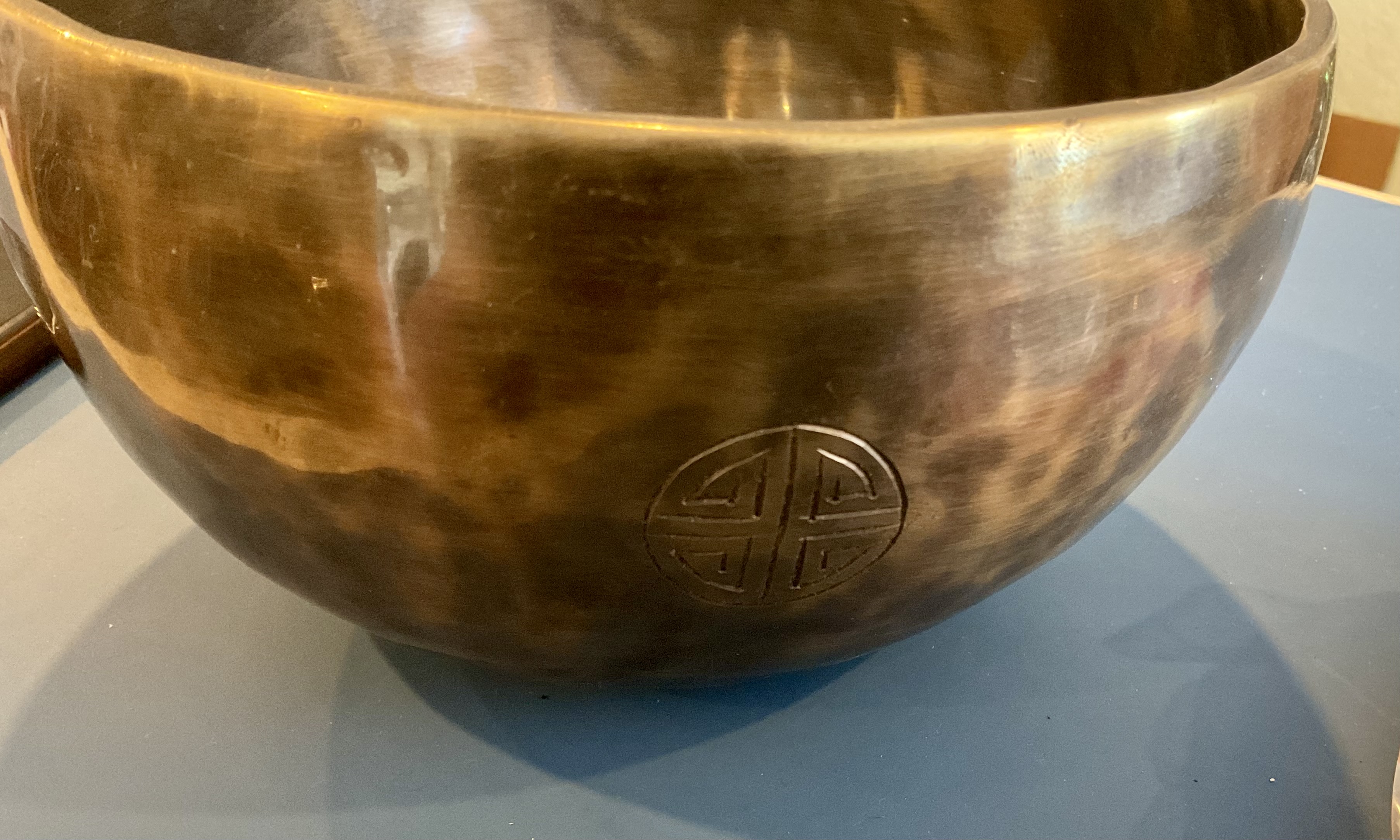 10″ Hammered Bronze Etched Tibetan Tiger’s Eye Full Moon Singing Bowl in the Key F# w/ Striker-