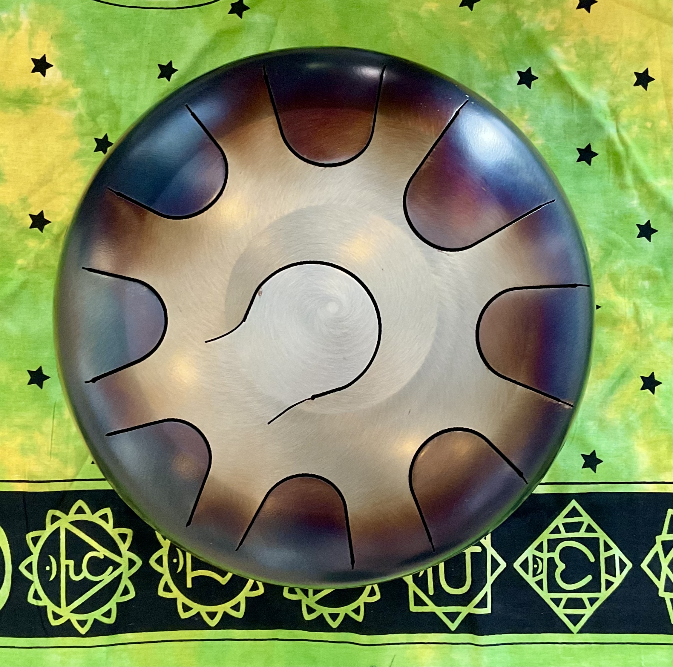 10″ Hammered Bronze Etched Tibetan Tiger’s Eye Full Moon Singing Bowl in the Key F# w/ Striker