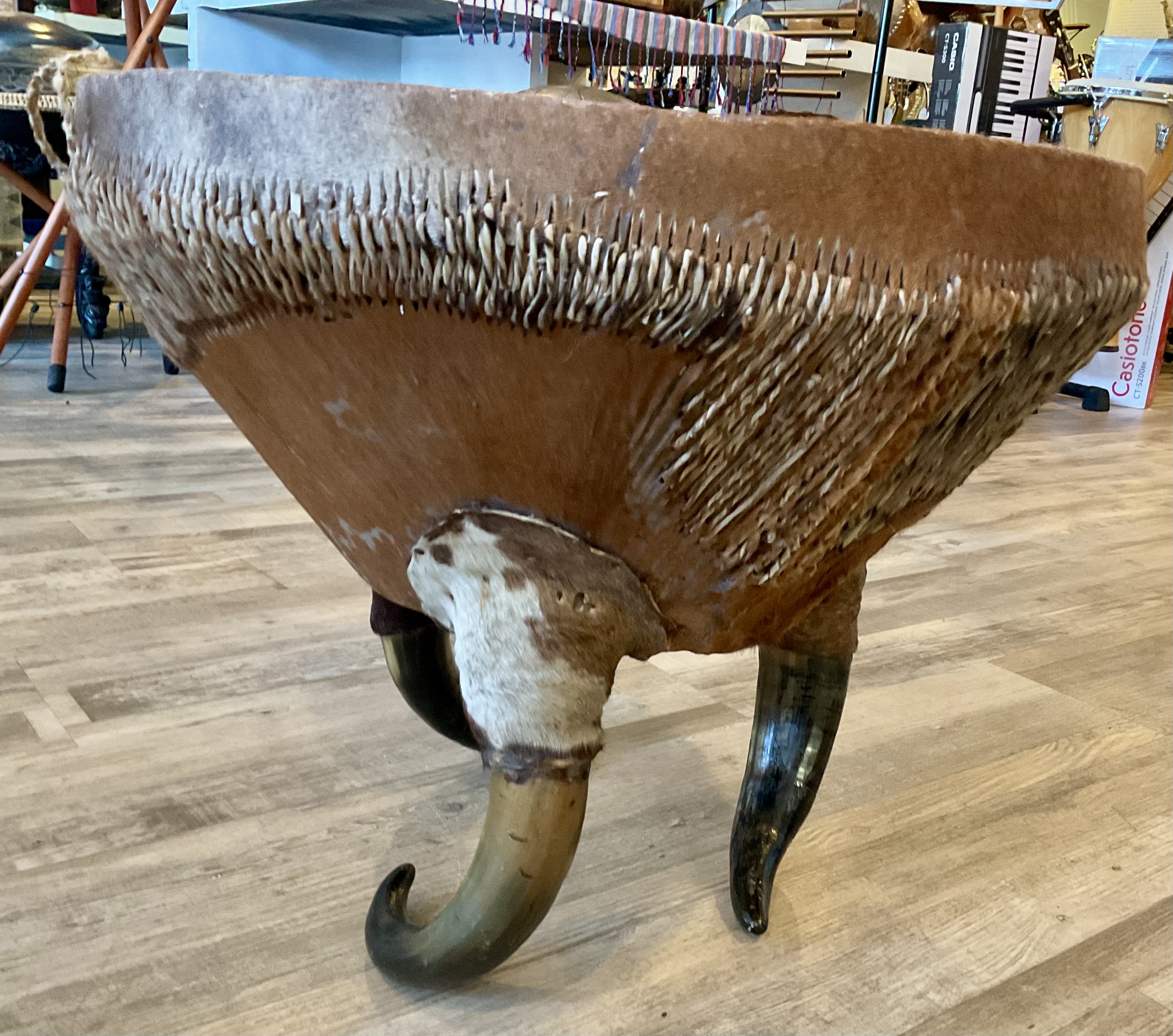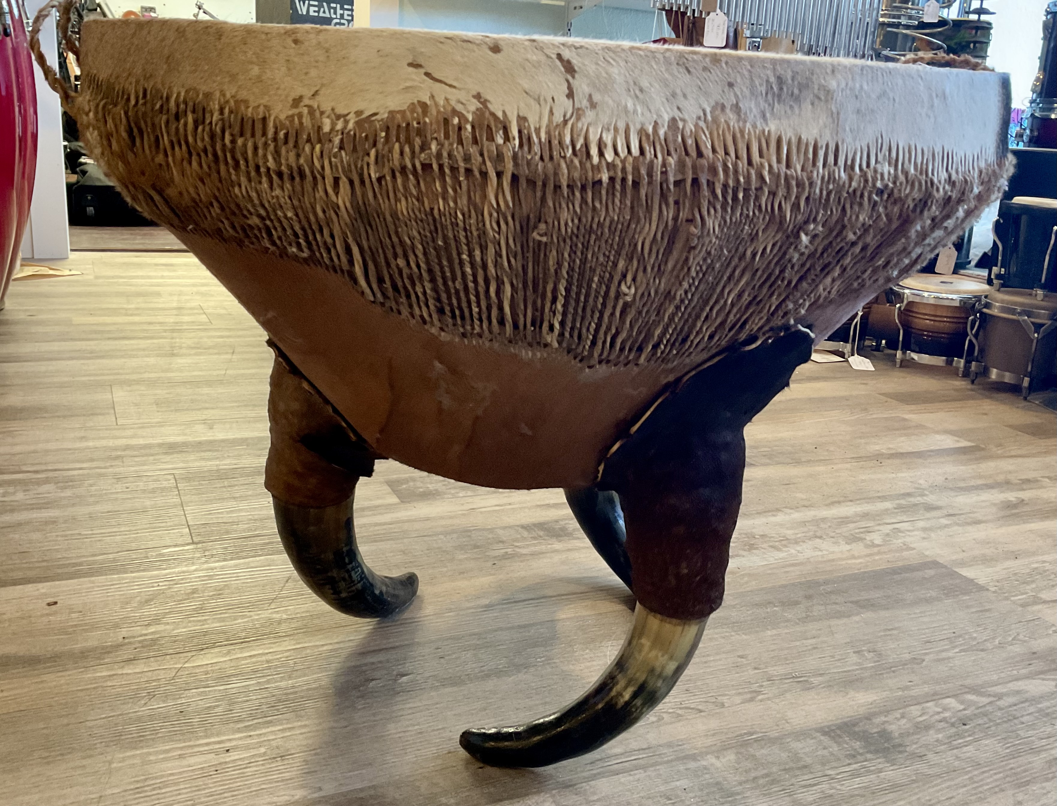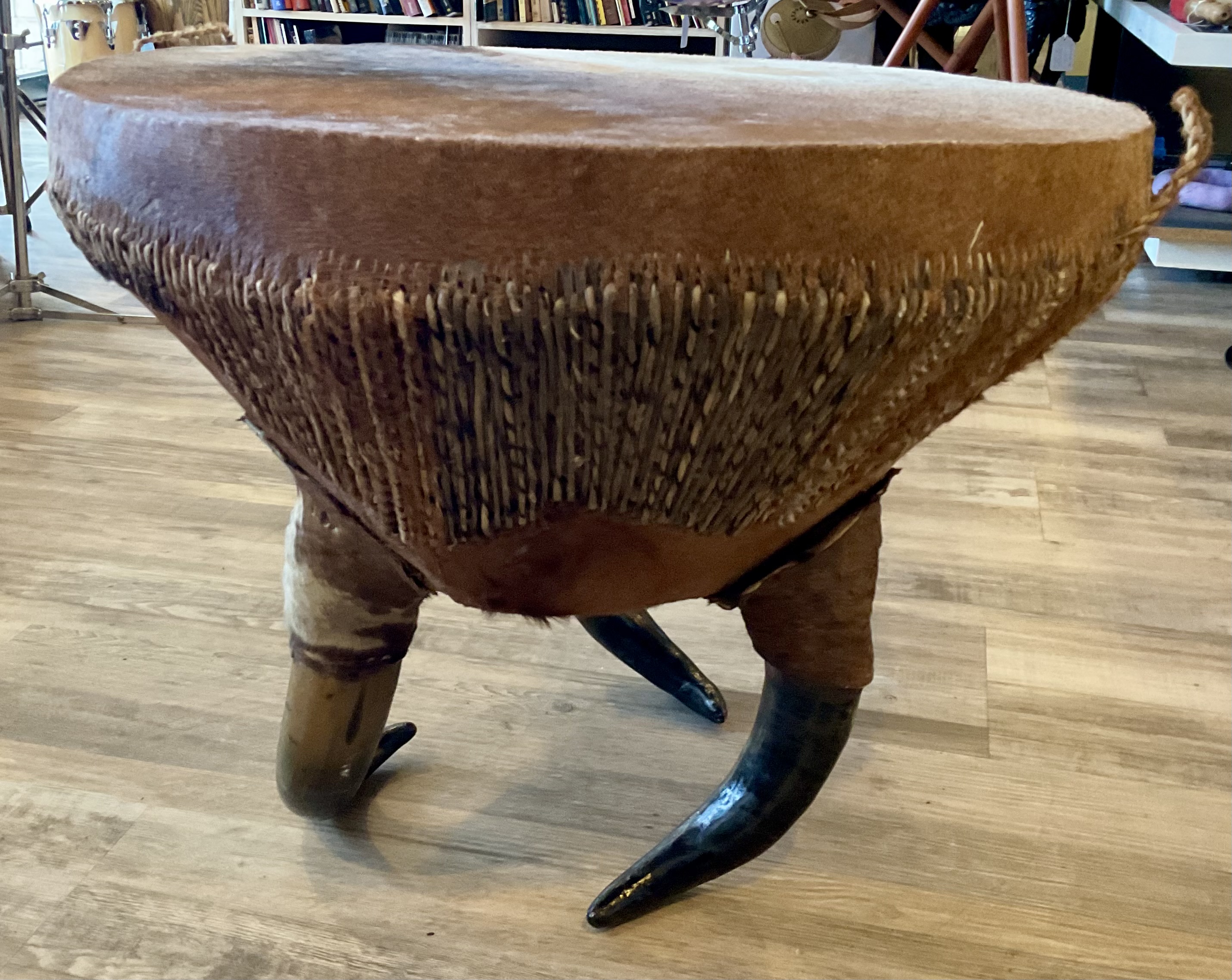Doubles as a unique coffee table and drum. Cowhide top and horn table legs. 21” in height and diameter/tabletop length of 25.5” Mallets not included. $499 **tax and fees added in final price below domestic shipping available add additional $150
