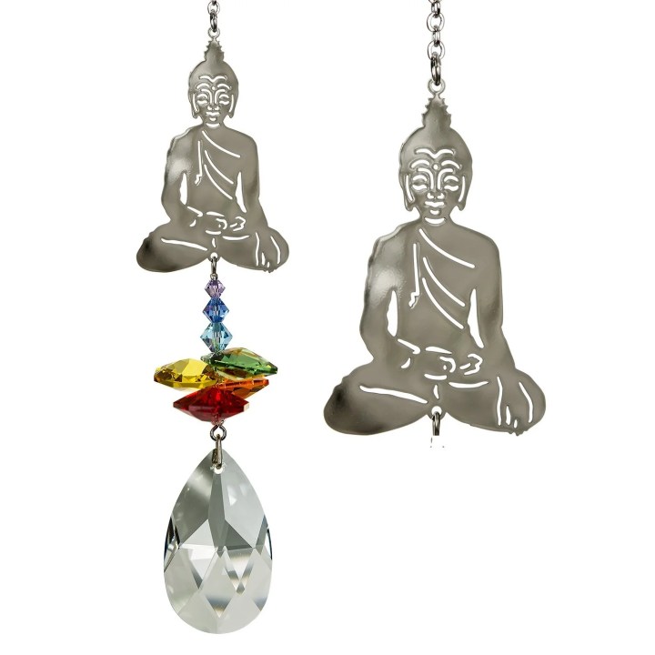 A large crystal is topped by smaller crystals and a silver seated Buddha. The serene Buddha tops a cluster of crystals that sparkle and shine in the sun. Works equally well as a sun catcher or Christmas ornament or hung in an office or dorm room. It’s especially beautiful when hanging in the window or in front of a light. Recommended for indoor use. This product is handcrafted with pride in the U.K., therefore sizes can vary. Not boxed, this crystal suncatcher comes ready to give with a sheer organza bag. $25 **tax and fees added in final price below. Shipping may be available please inquire (BB)