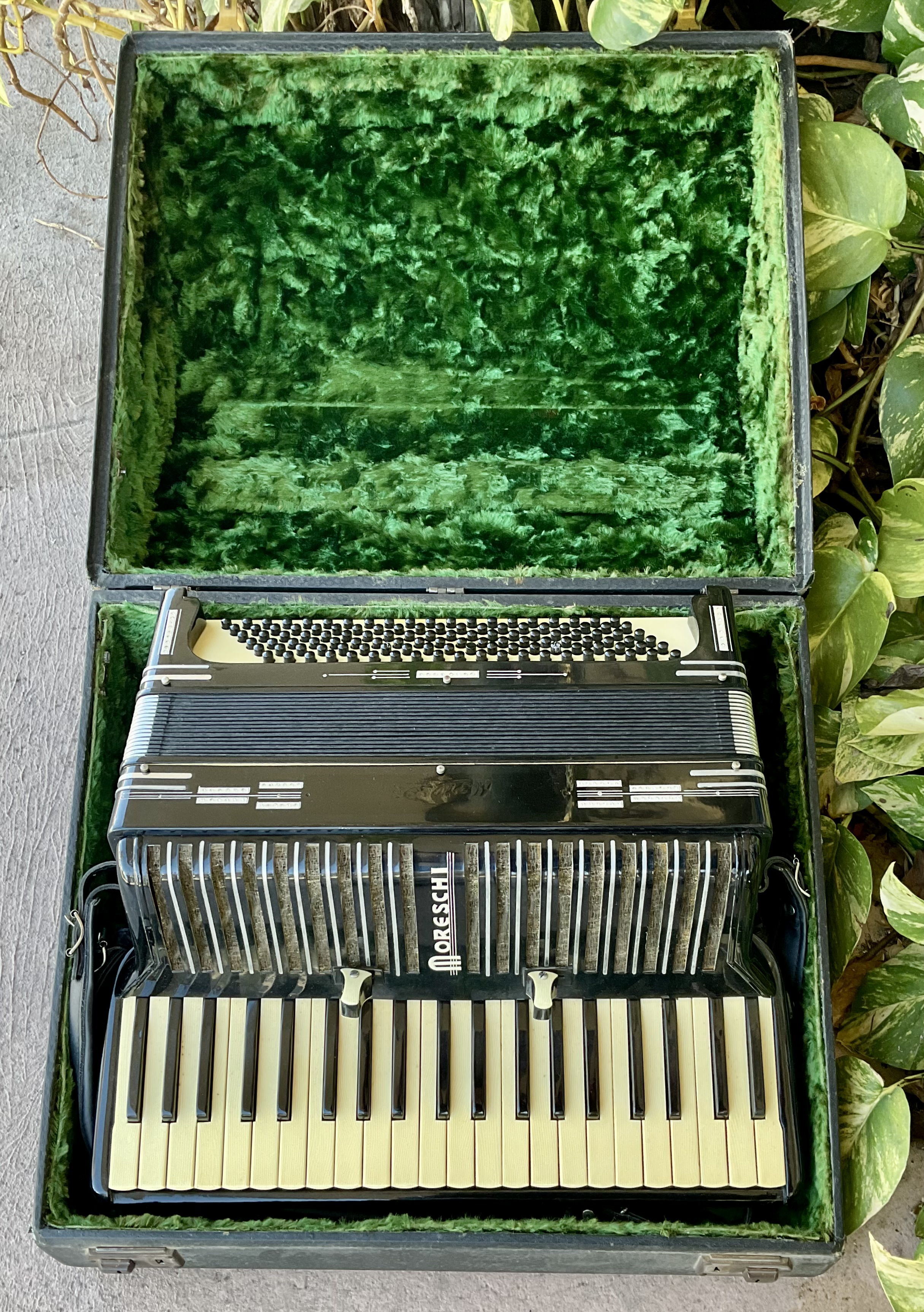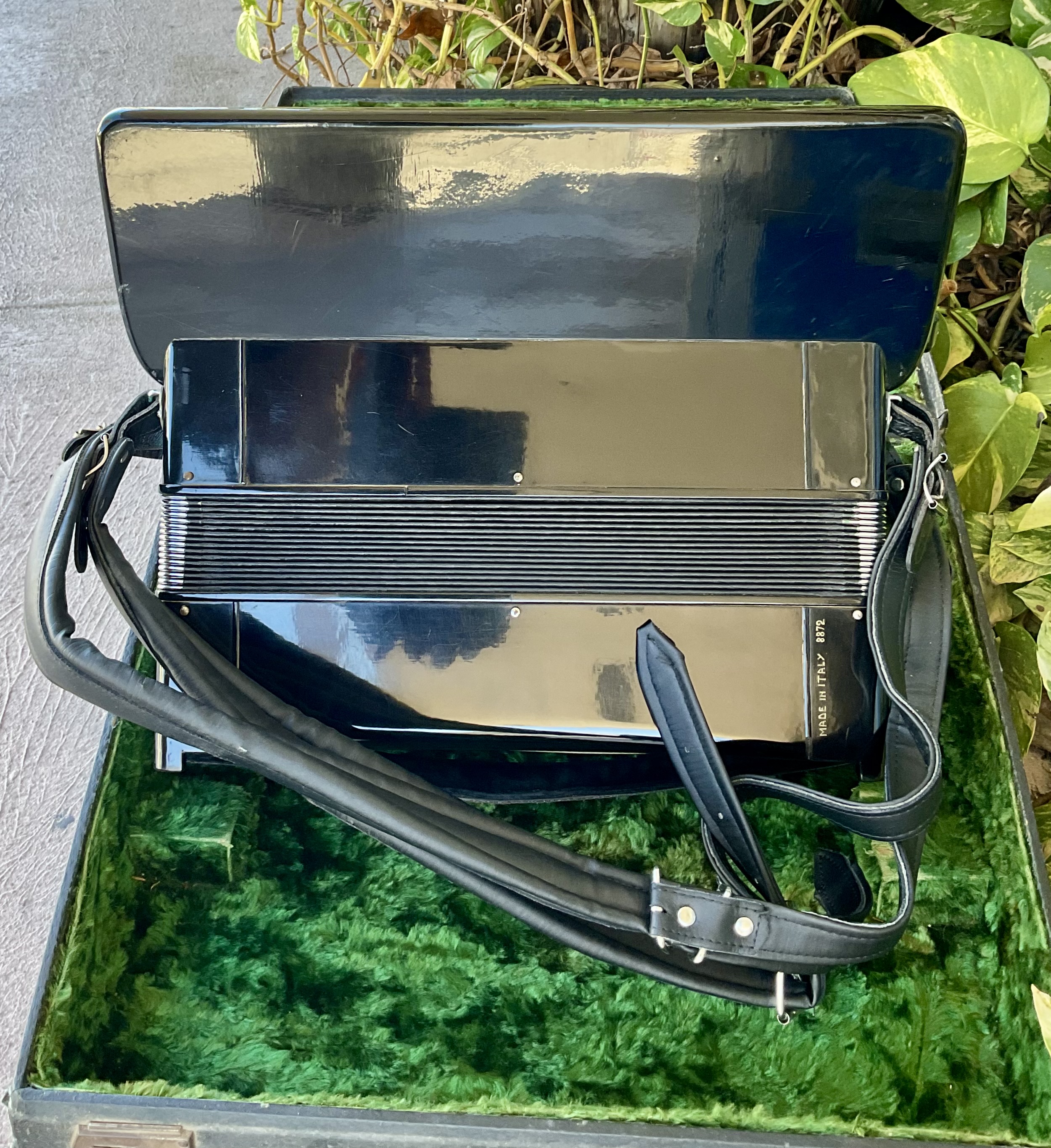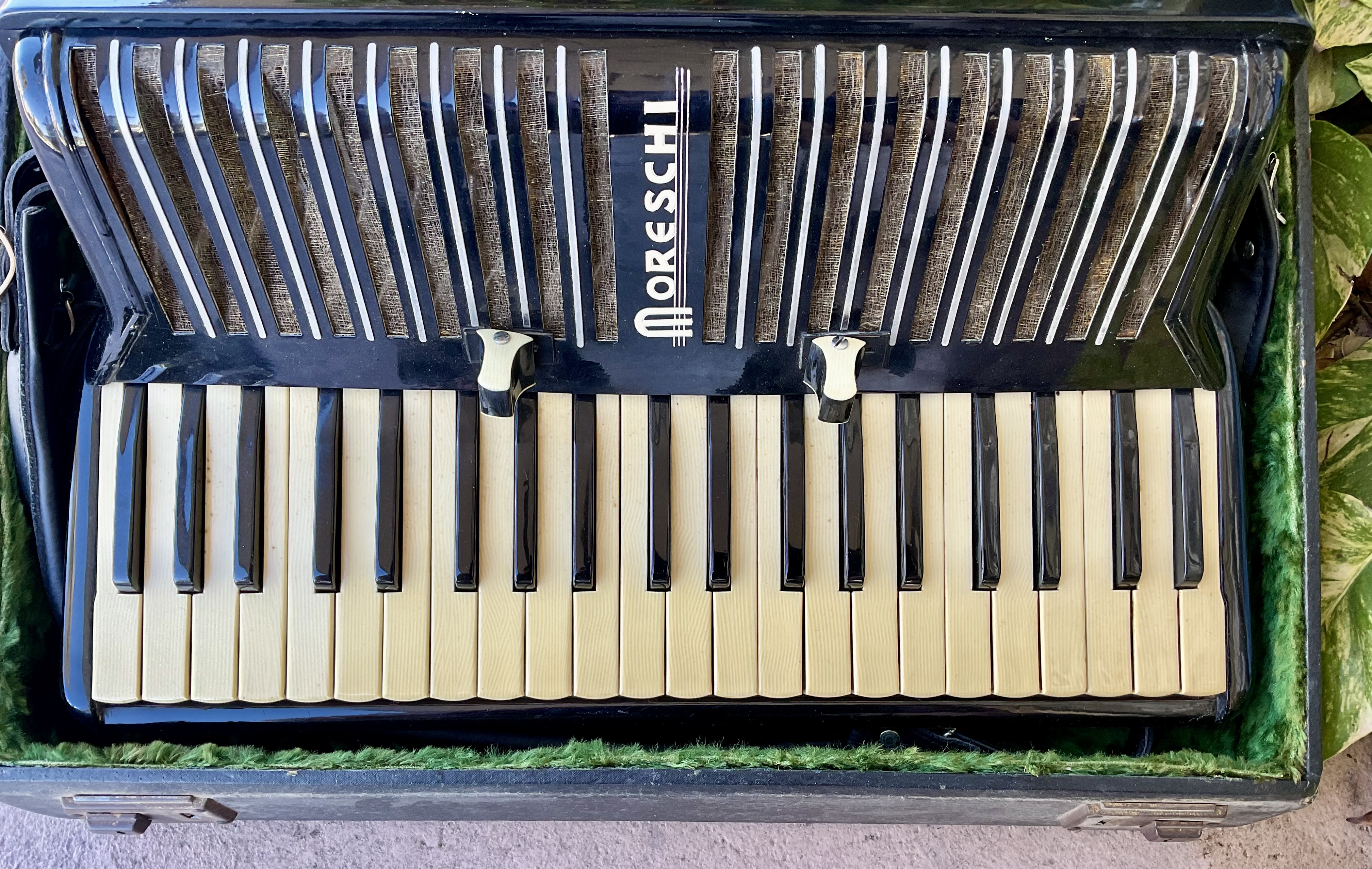 Here’s one of the most distinctive approaches to playing melody on a chord zither. It appeared in response to the rapid increase in popularity of Hawaiian music in the 1920’s. The instruction manual is bold enough to say that it “might well be called the Original Hawaiian Instrument,” though the Hawaiian steel guitar had already been played for decades. Even the patent plainly states that the instrument “simulates closely the tonal effects of the so-called Hawaiian steel guitar.” There’s a single melody string which is under fairly low tension. A sliding (or rolling) weight rests on the string and is positioned by the player to locations marked on the large note label under the string. That position controls the pitch of the string when plucked. The relatively heavy weight actually bounces on the string and alternately raises and lowers its tension a little. Thus the pitch is raised and lowered a little around the desired pitch, and the sound becomes a broad vibrato. In addition, as the weight moves from one played note to the next, the weight stays in contact with the string, and creates a glissando that is reminiscent of the sound of a Hawaiian steel guitar. The patent for the Tremoloa was granted in 1932 to Harold Finney, a principal in the International Musical Corp. at the time, and John H. Large, an inventor who also received a patent on a form of the Ukelin. The Tremoloa patent was applied for in 1929 and shows Form 1 of the instrument. We could assume that the Tremoloa wasn’t available before about 1929. $299 **tax and fees added in final price below domestic shipping available add additional $50